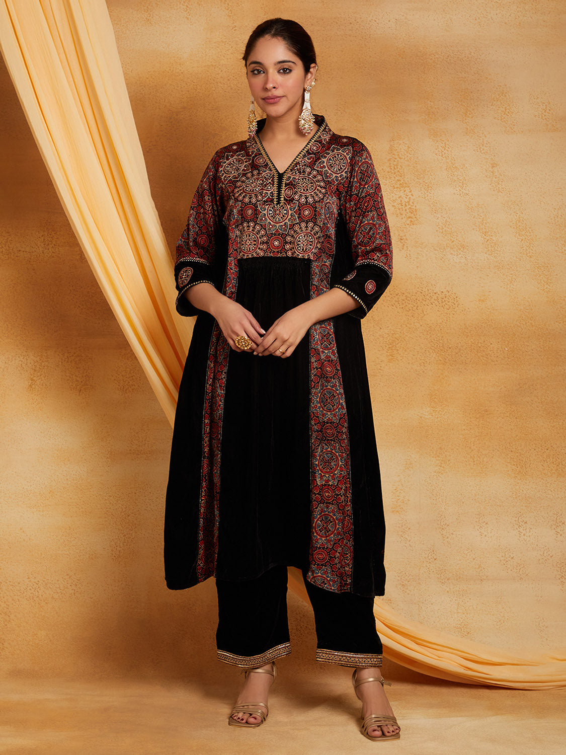 Black Velvet Modal Silk Applique Kurta Set-Set of 2