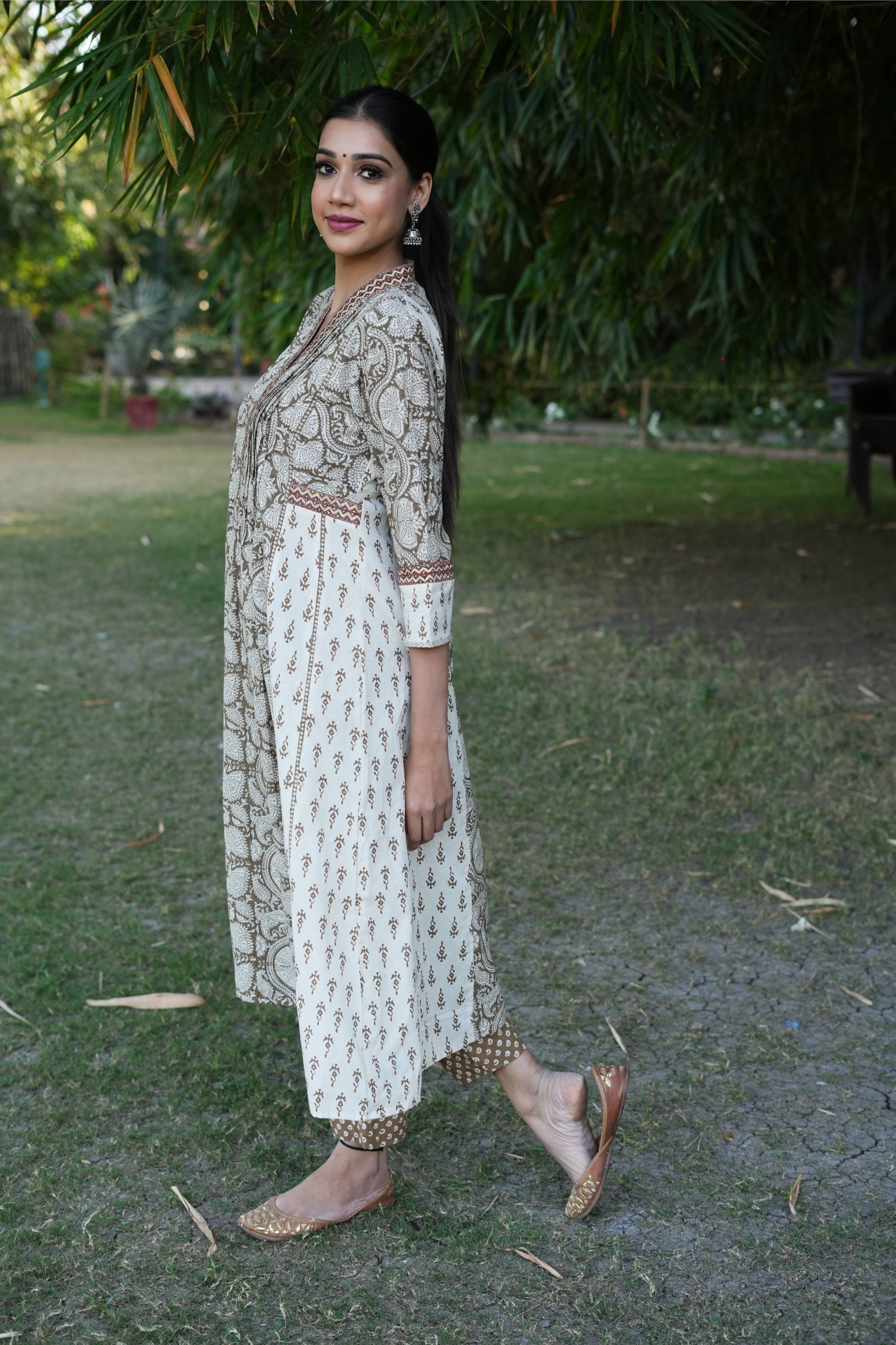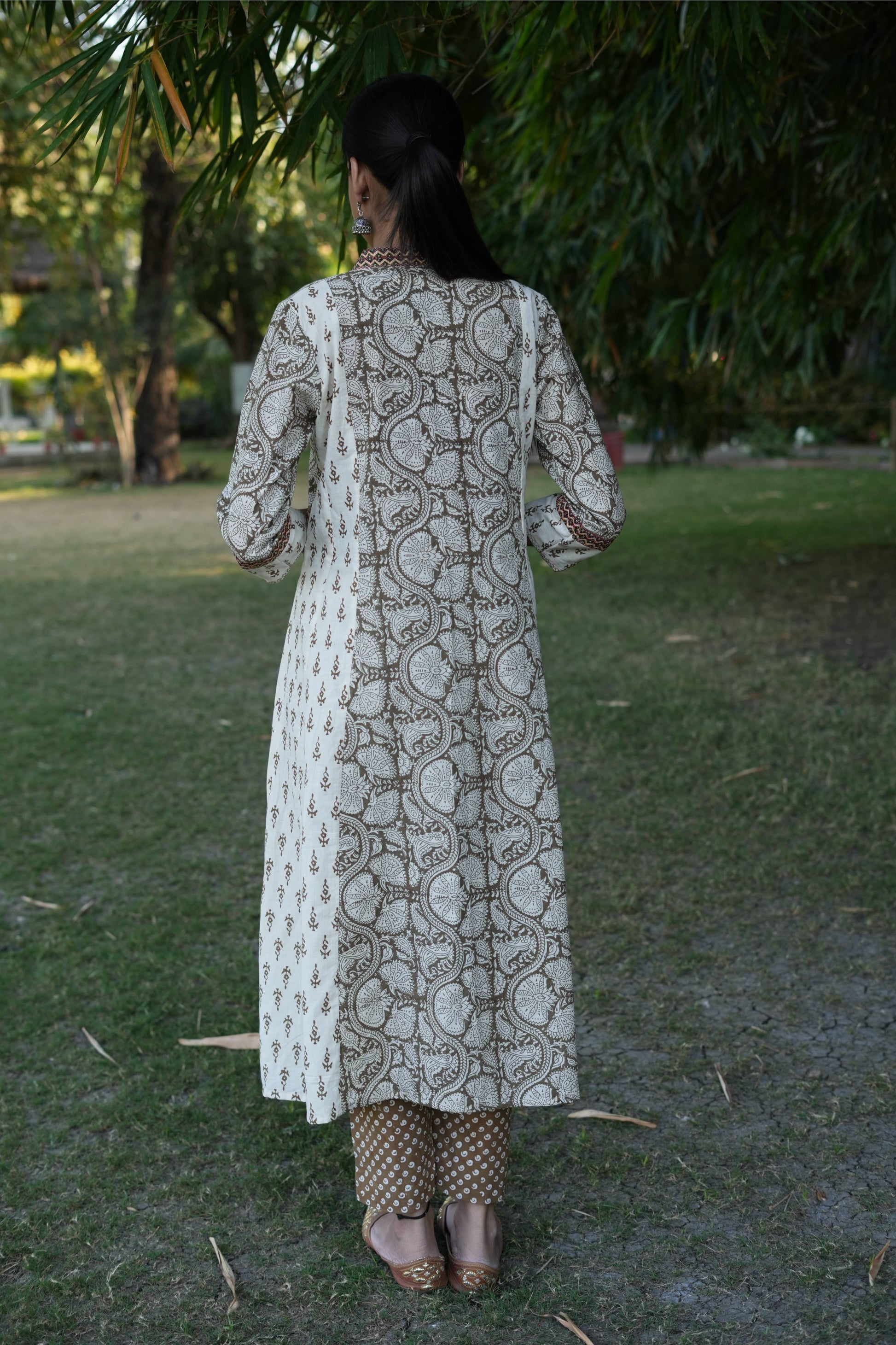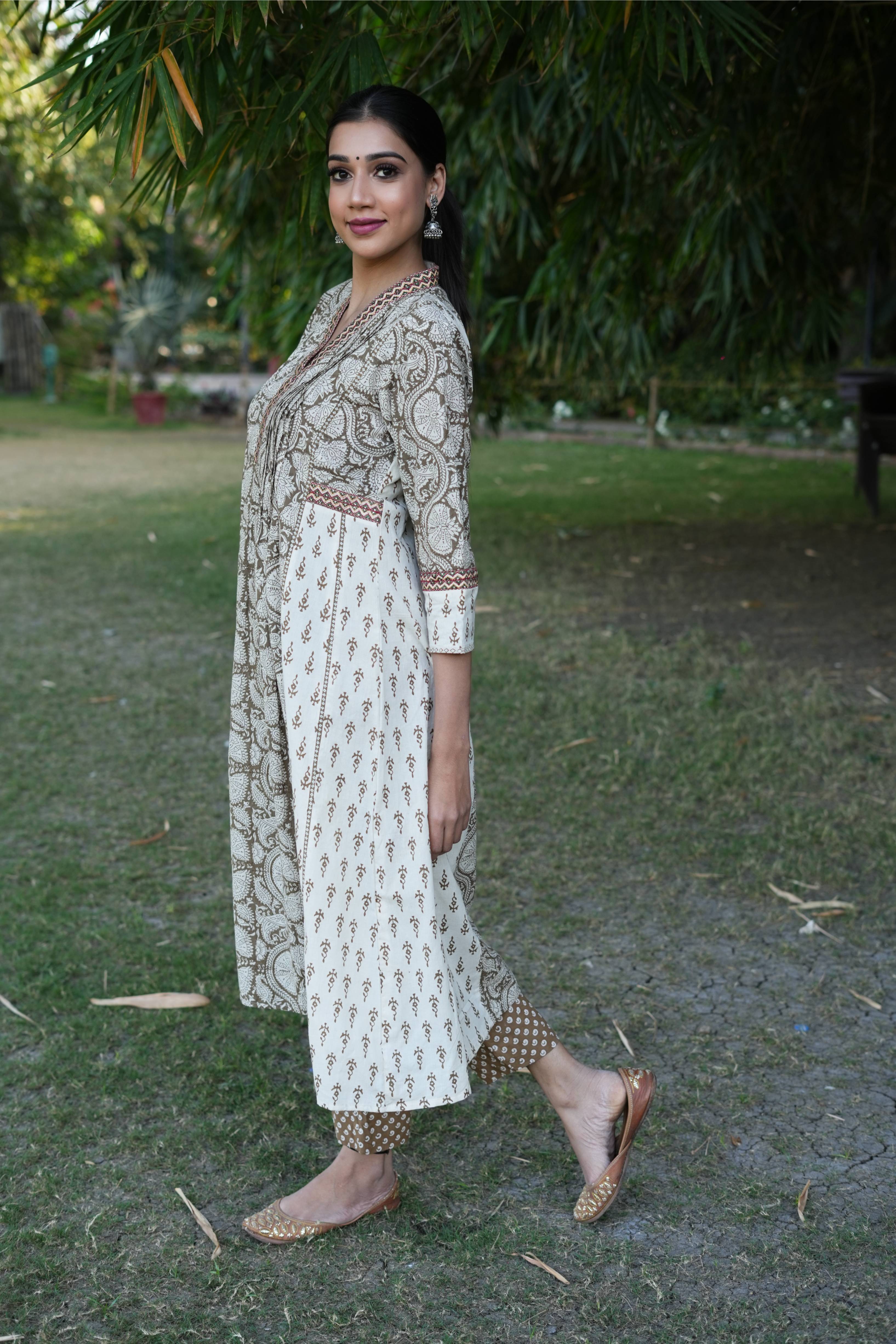 This cotton Bagh hand block printed in combination of ochre and white has colorful silk thread embroidery on neck and sides. It comes with a cotton Bagh pant