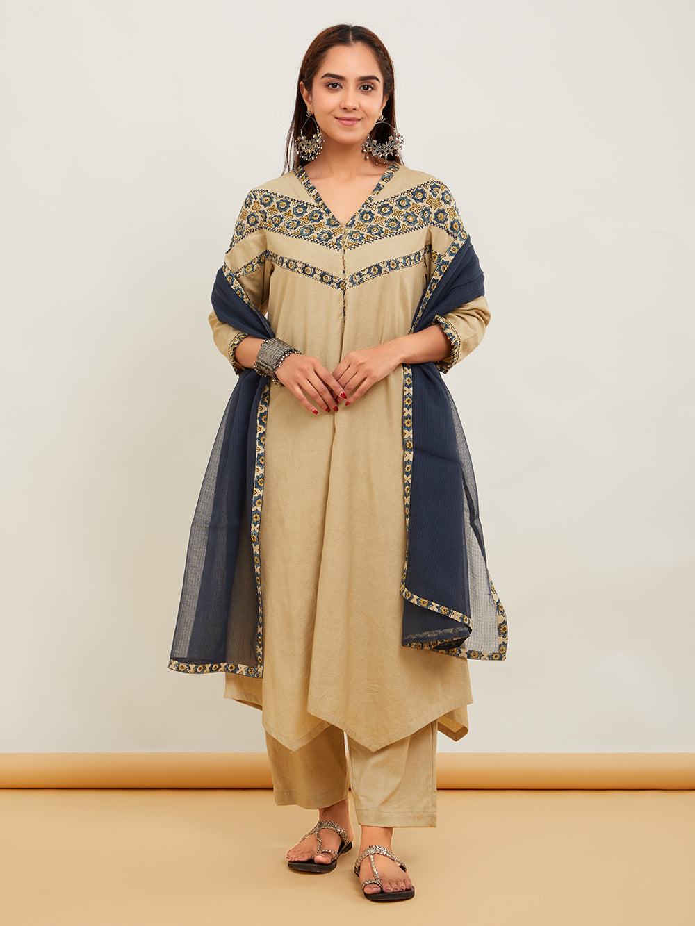 Step into effortless sophistication with the Beige Ajrakh Patch Work Cotton Suit - Set of 3, a captivating ensemble that celebrates heritage craftsmanship and contemporary elegance. The beige cotton kurta is adorned with intricate Ajrakh hand block printed patchwork, bringing a touch of timeless artistry to its graceful silhouette. Delicate sequins work adds a subtle shimmer, enhancing the beauty of its textile patterns. A classic V-neckline frames the look beautifully, while 3/4th sleeves ensure a poised yet relaxed fit. Thoughtfully designed with a side pocket, this kurta blends functionality with refined aesthetics. Paired with beige cotton pants, featuring a back elasticated waist, the ensemble embraces comfort and tailored sophistication. Completing this stunning set, the blue kota doria dupatta, adorned with printed border detailing, introduces a striking contrast that enhances the beauty of the kurta, making it a must-have for festive and everyday elegance.