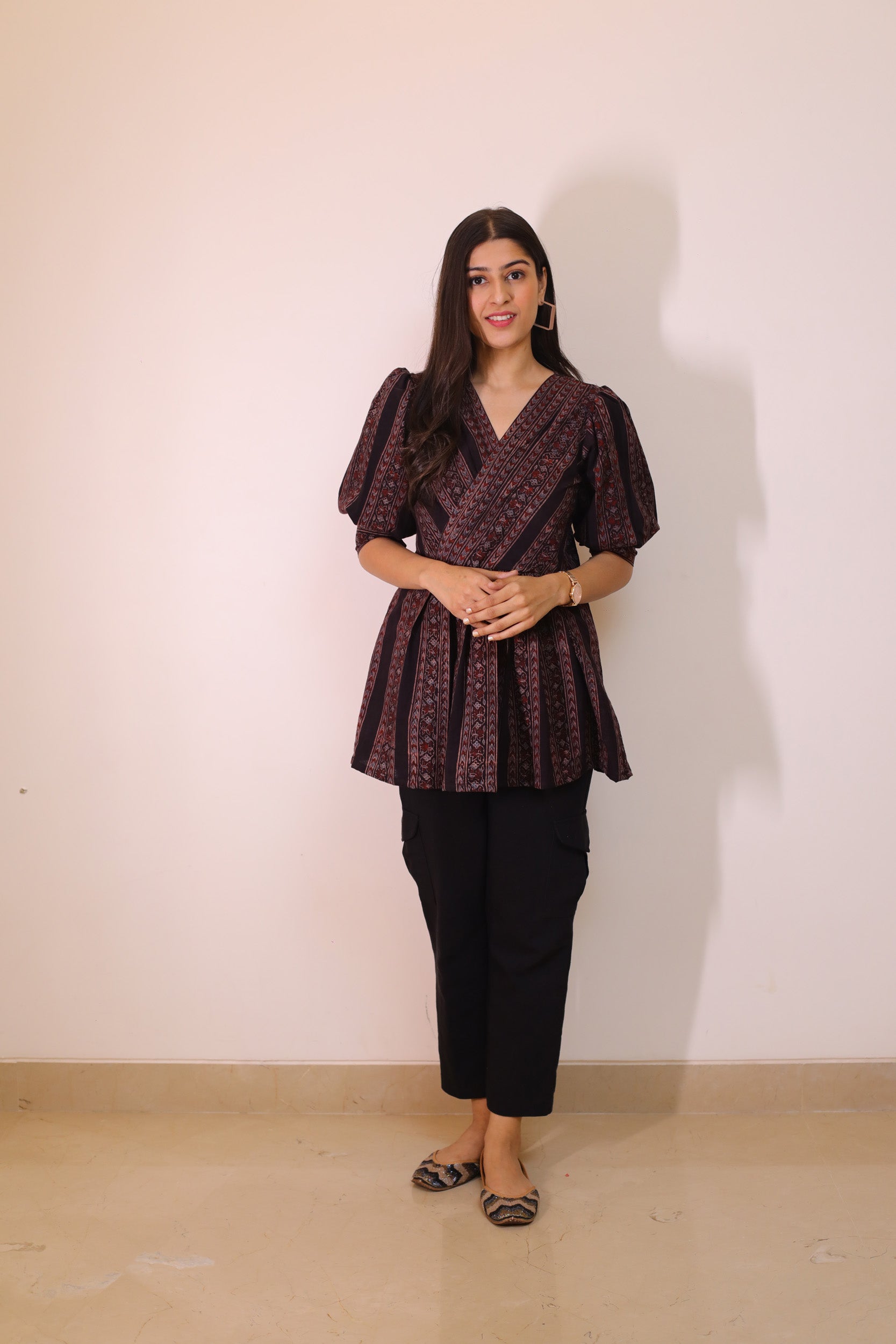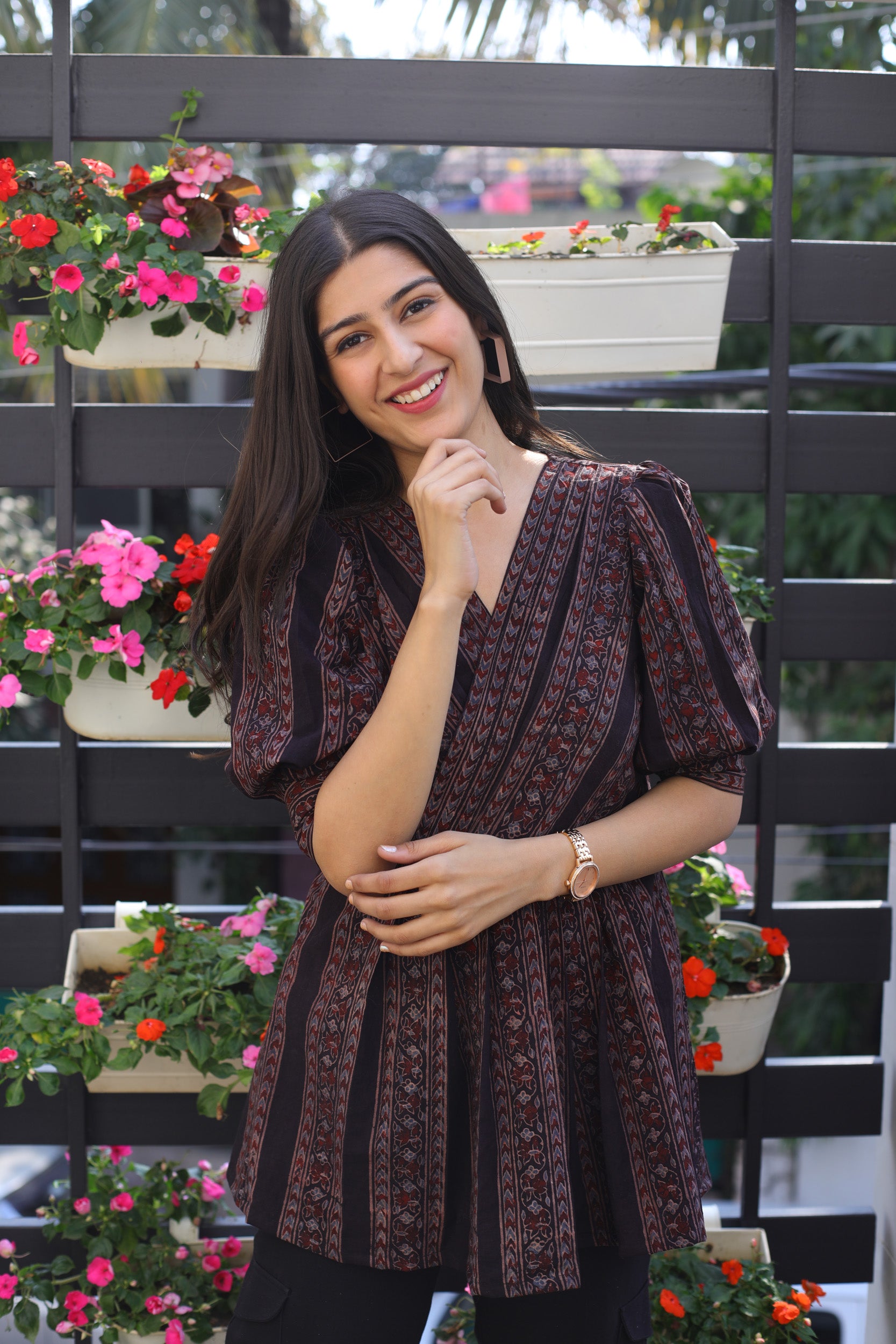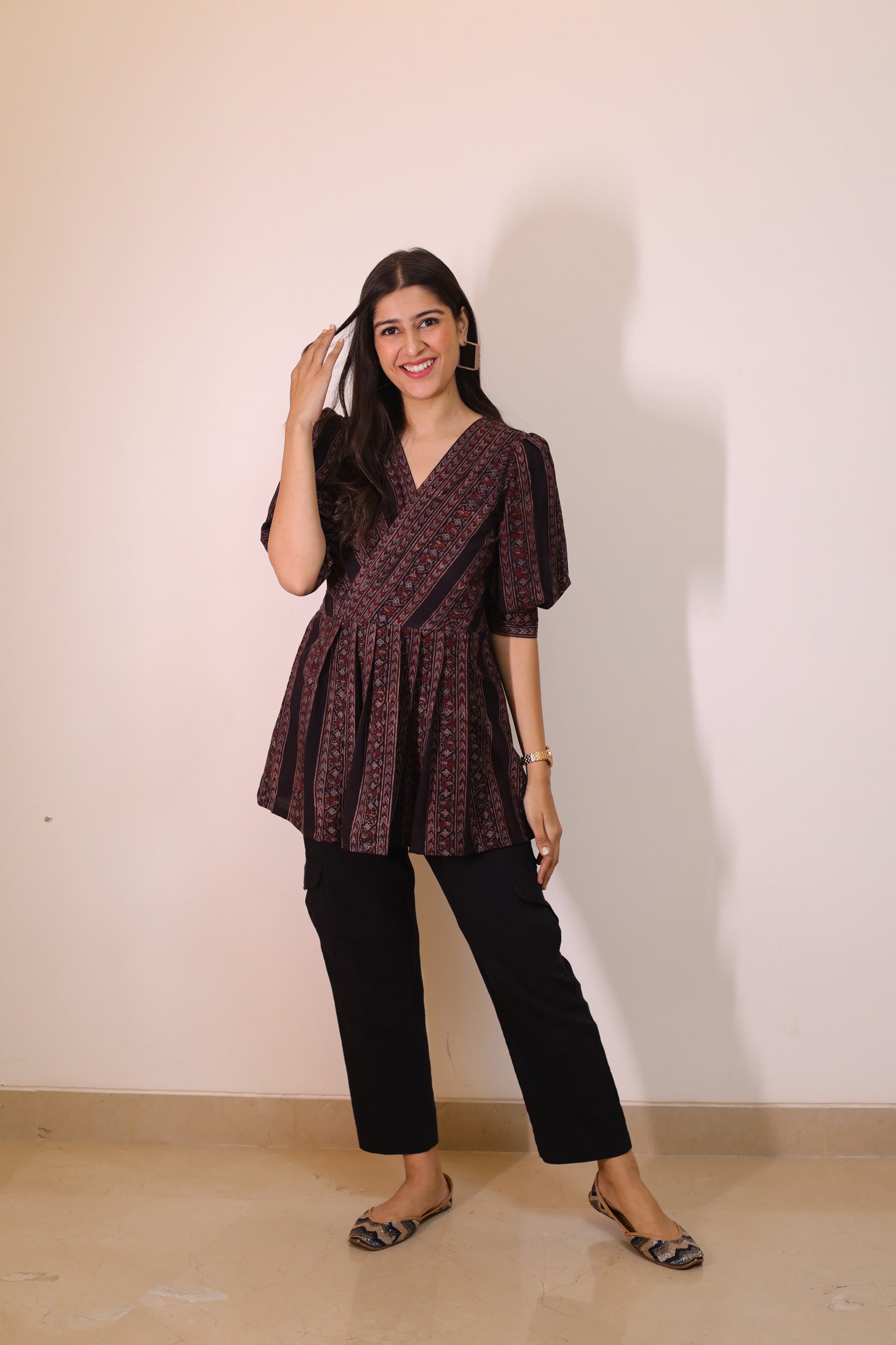 This black Ajrakh top features traditional block-printed stripes and a flattering V-neck design. Crafted with attention to detail, it combines cultural artistry with modern style, making it a versatile piece for both casual and semi-formal occasions. The breathable fabric ensures comfort throughout the day while showcasing timeless craftsmanship.