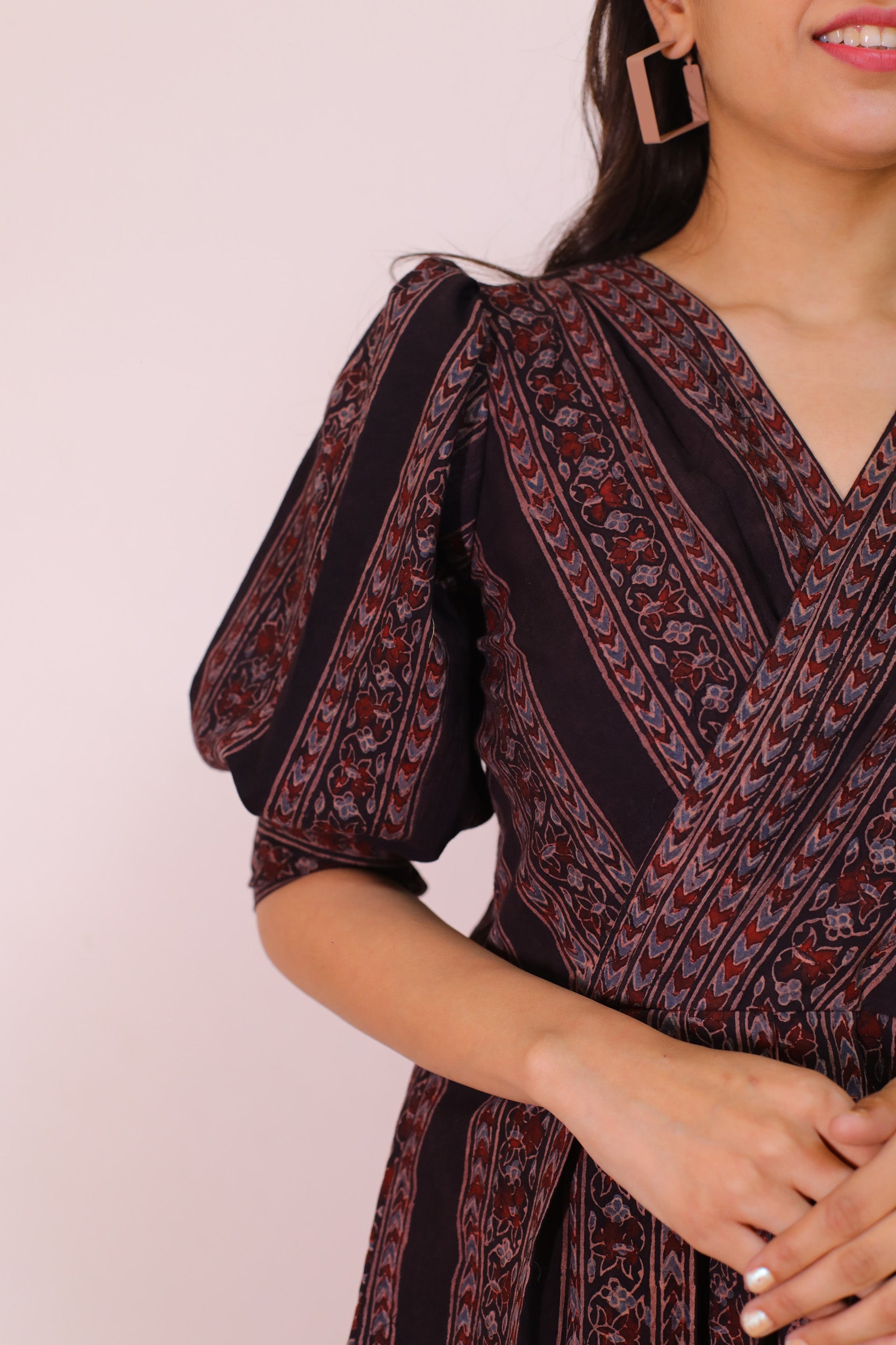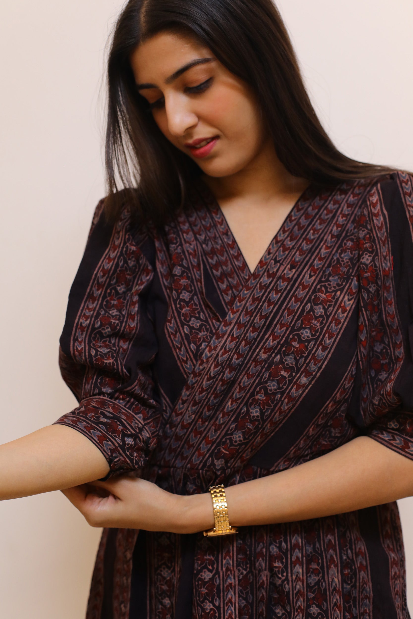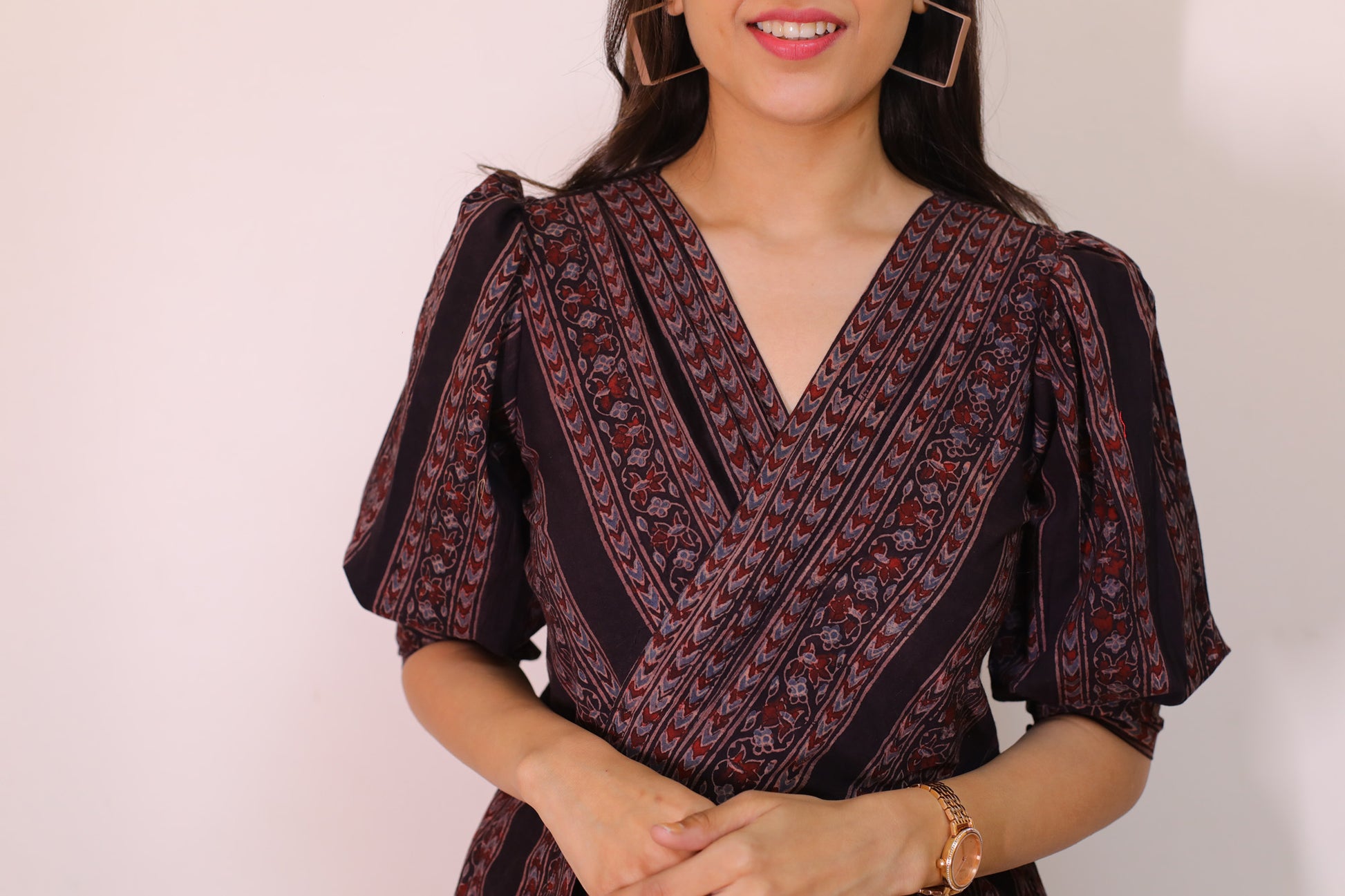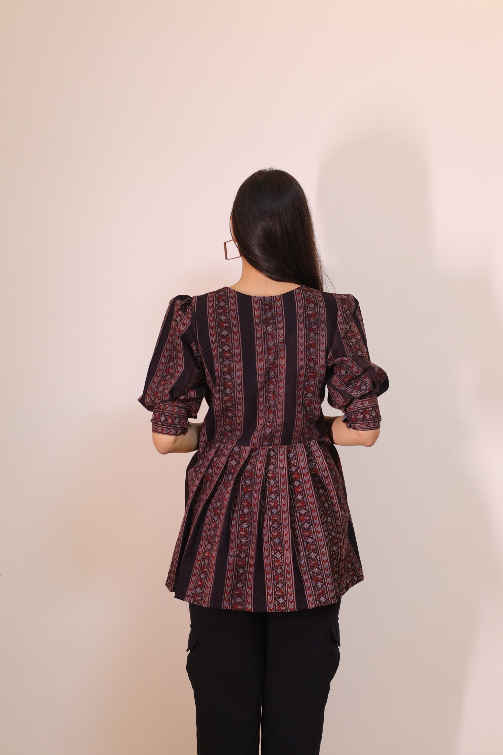 This black Ajrakh top features traditional block-printed stripes and a flattering V-neck design. Crafted with attention to detail, it combines cultural artistry with modern style, making it a versatile piece for both casual and semi-formal occasions. The breathable fabric ensures comfort throughout the day while showcasing timeless craftsmanship.