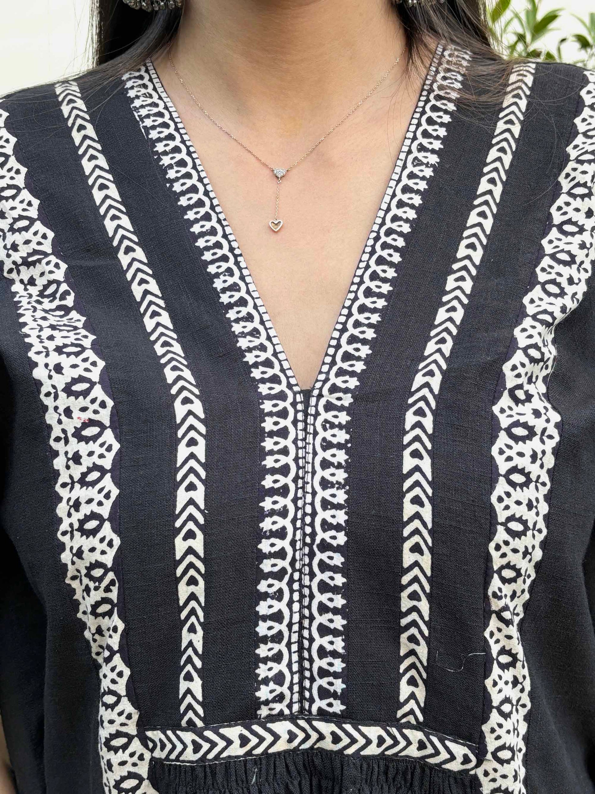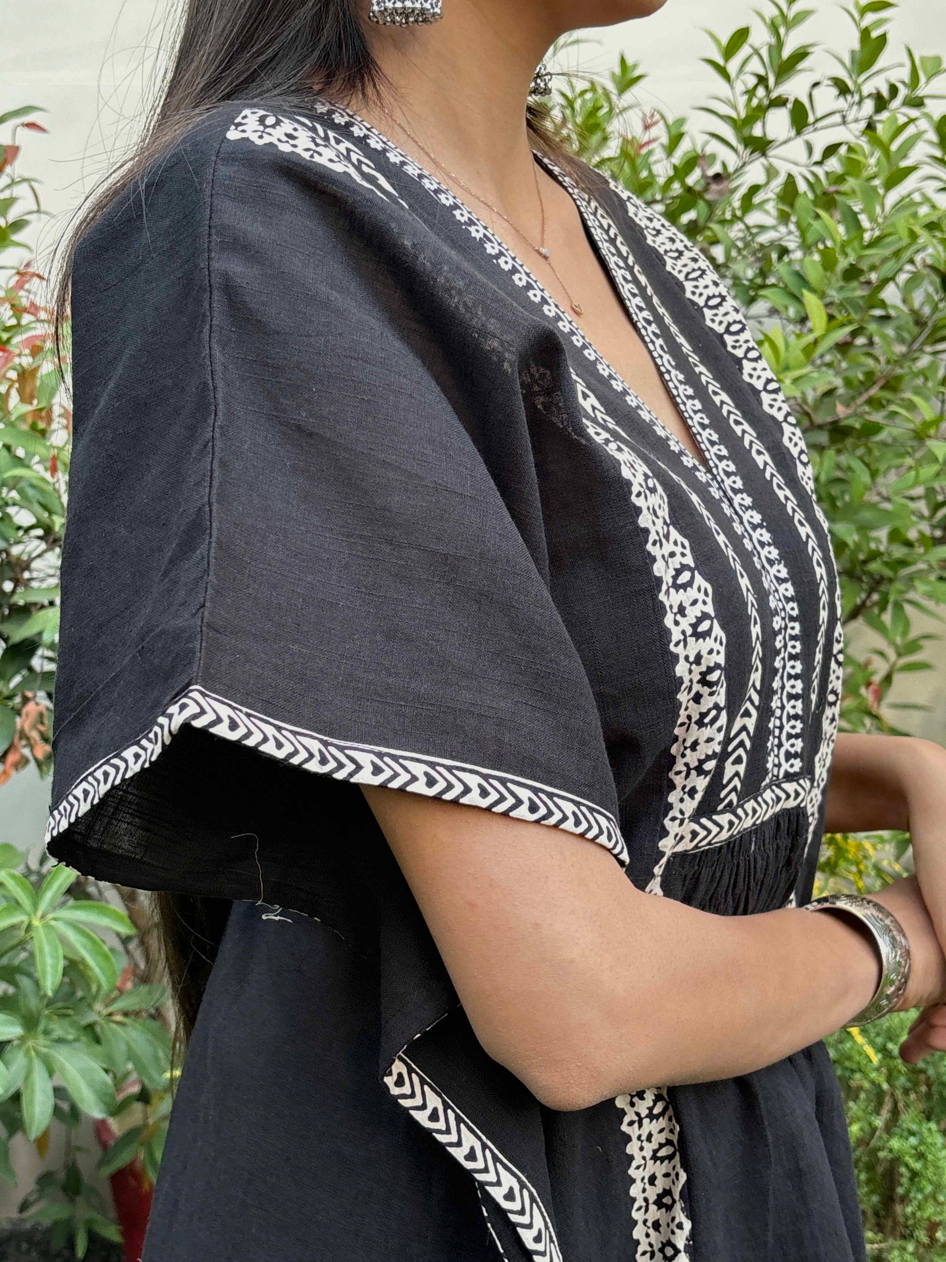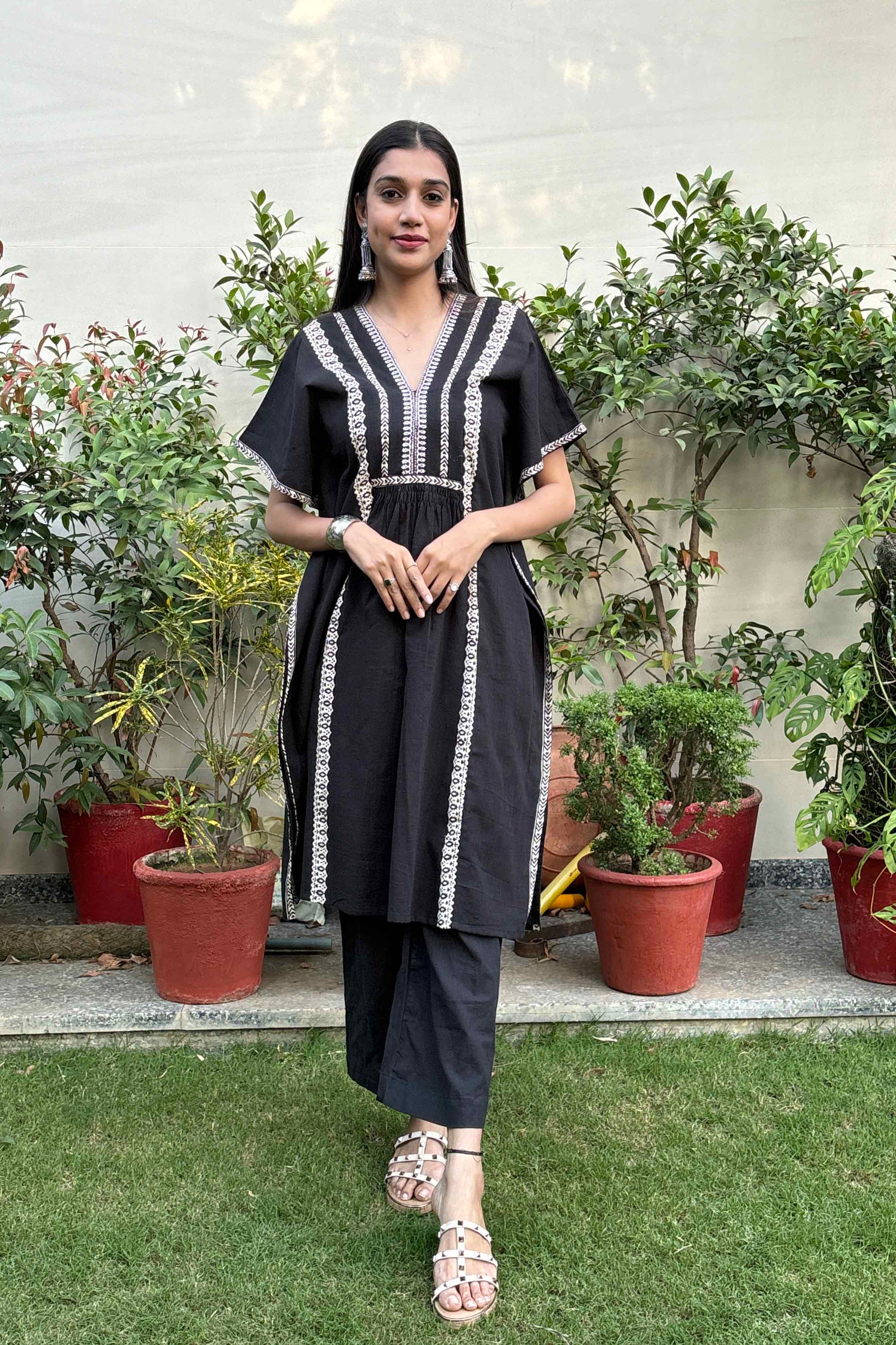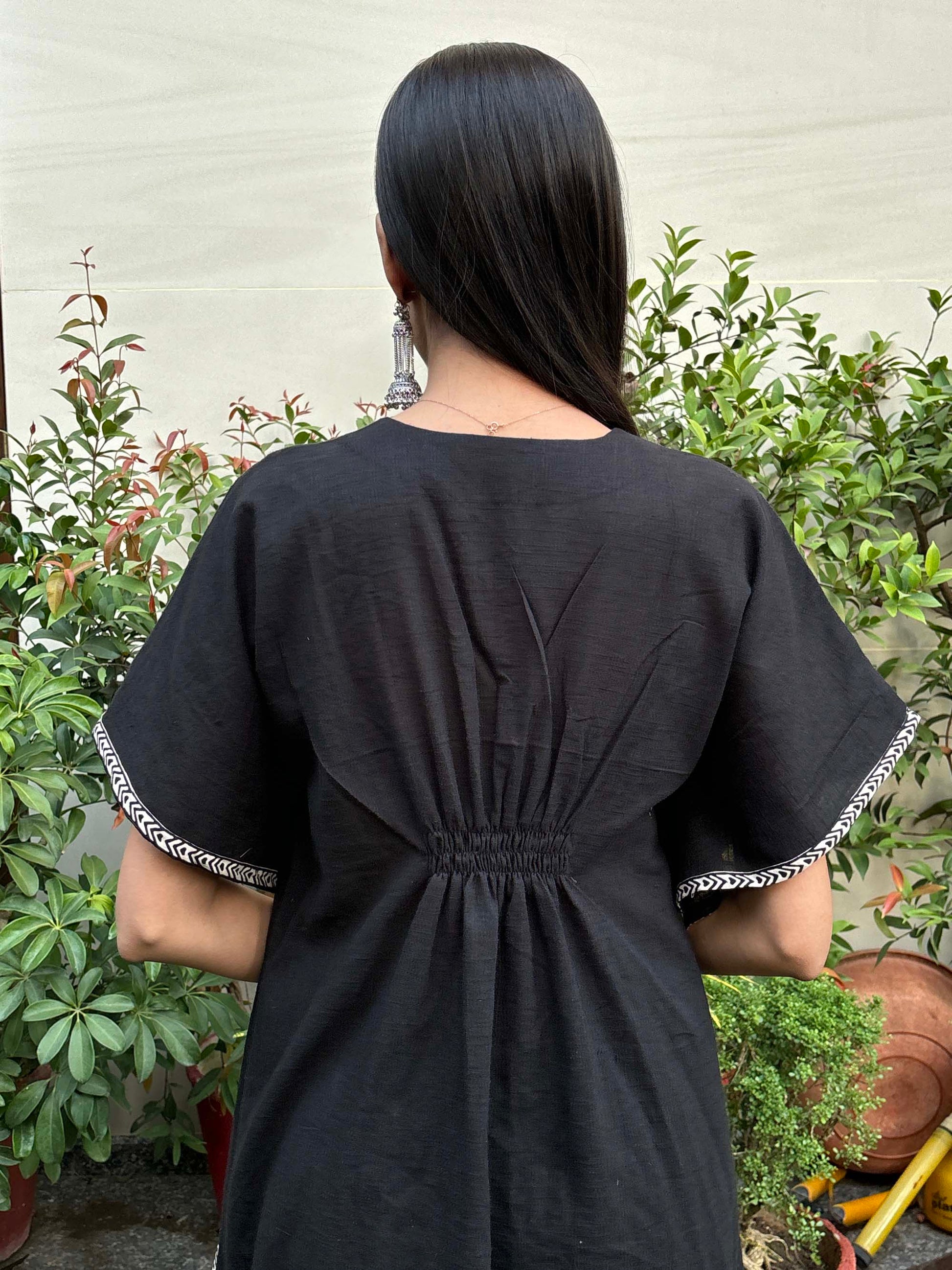 Embrace this summer with black cotton slub bagh applique kaftan style kurta. The back has smocking waist for the comfort fit.