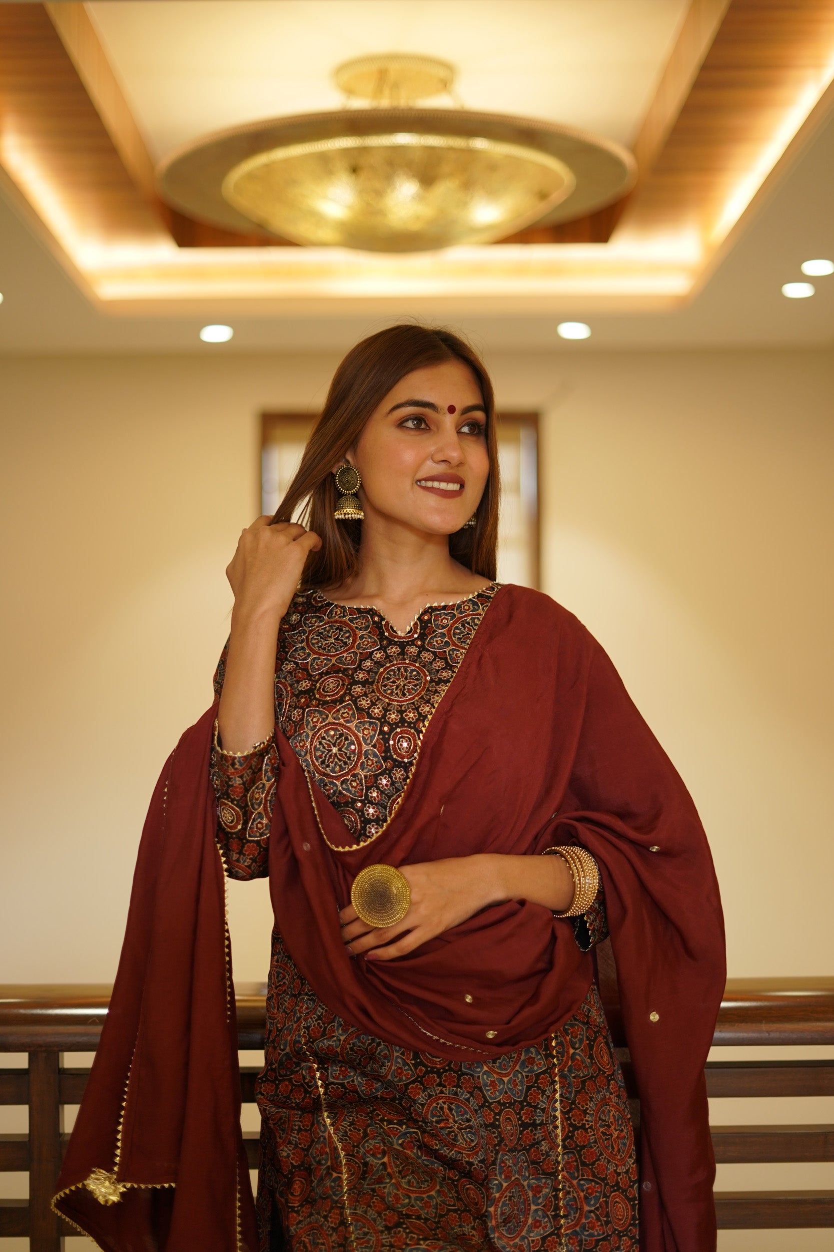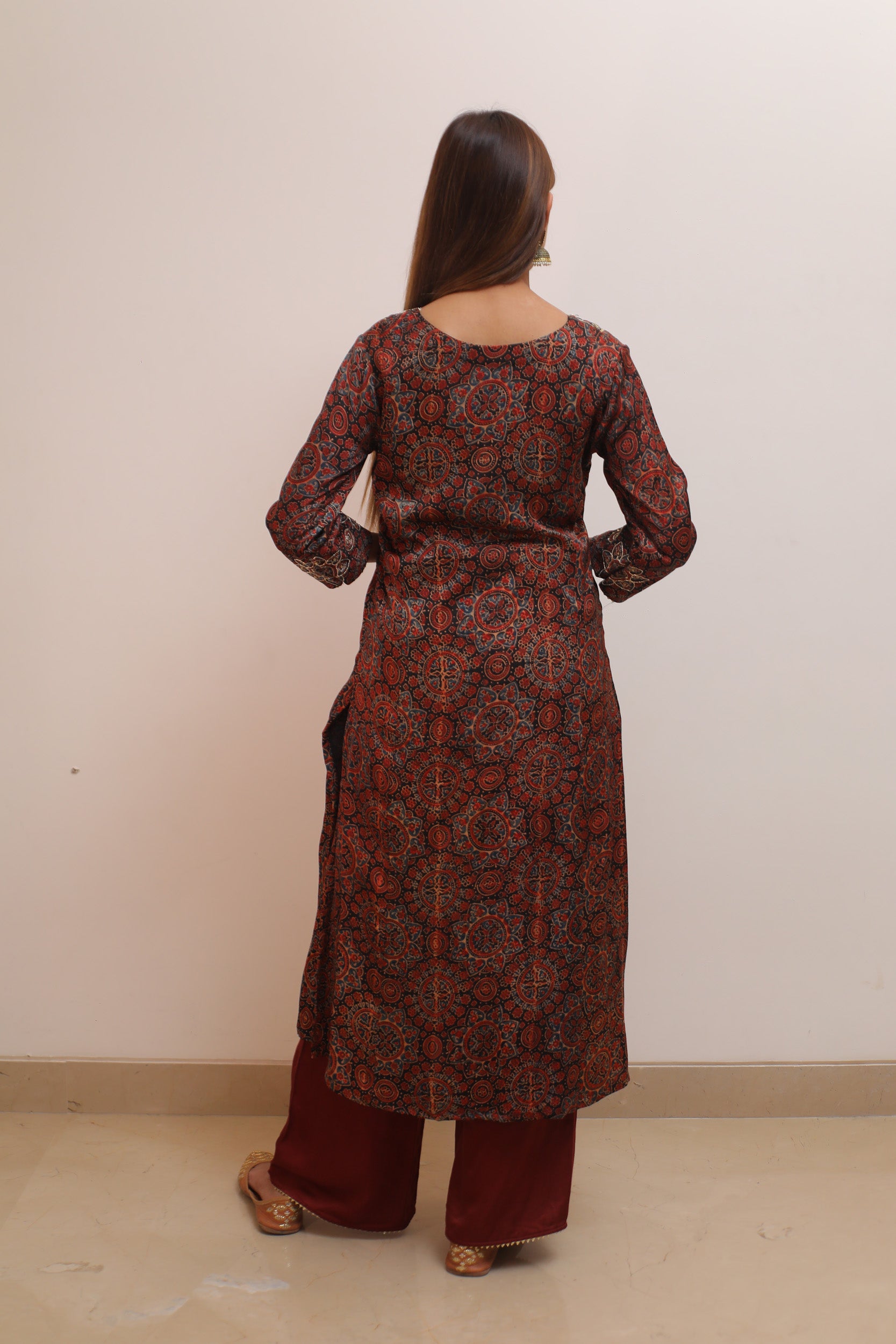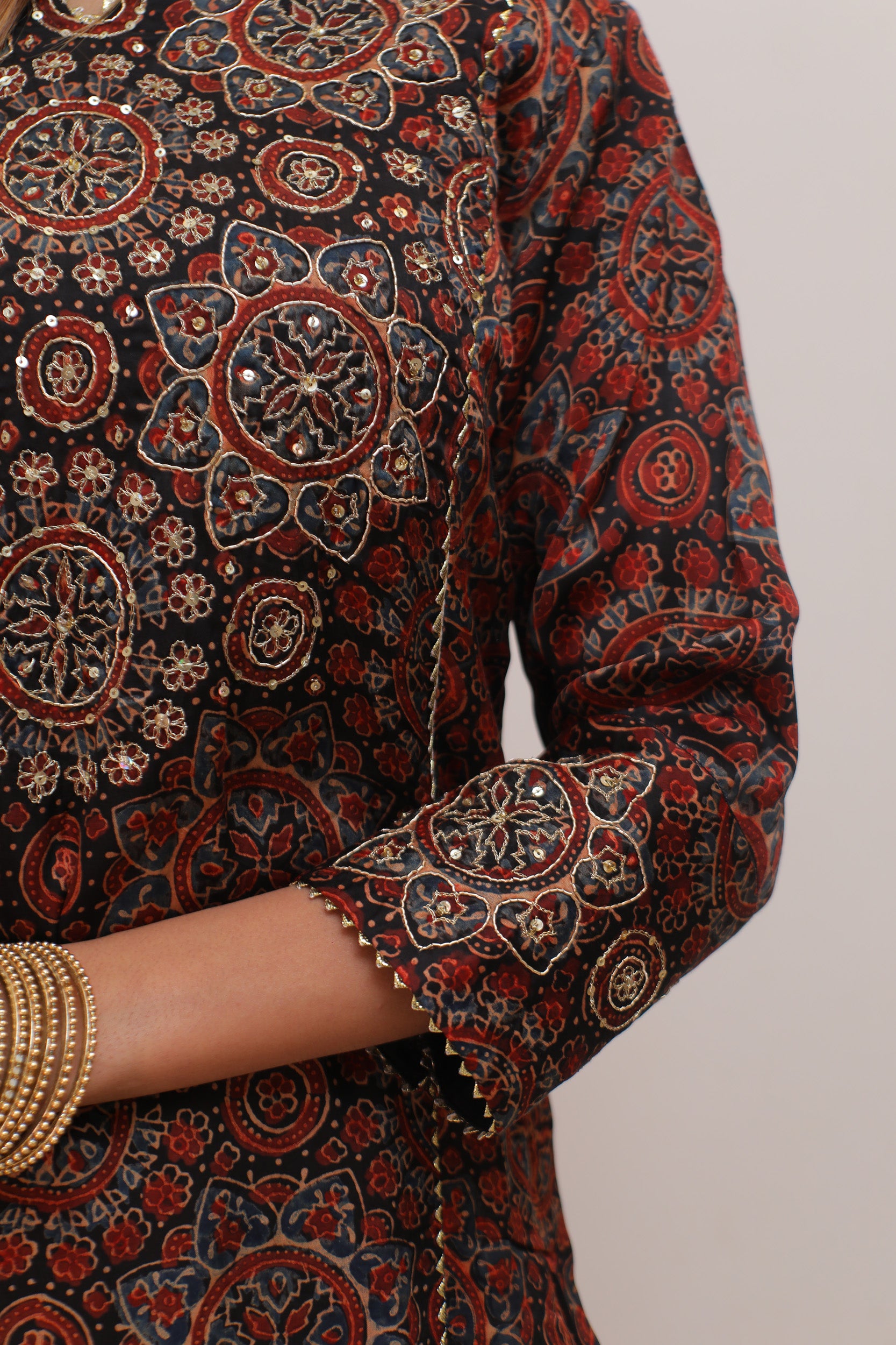 Black Maroon ajrakh print Modal Zari zardozi embellished suit set