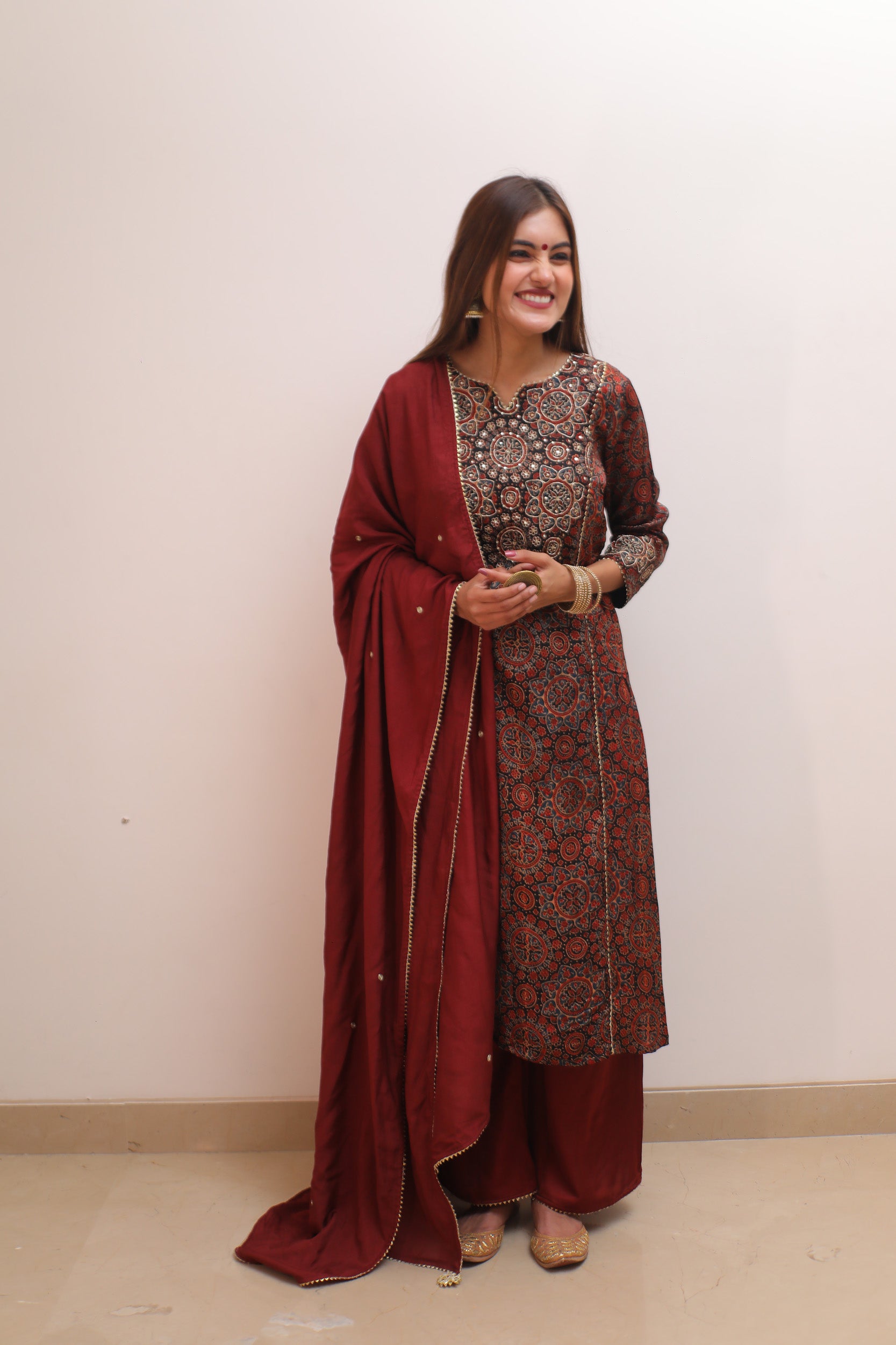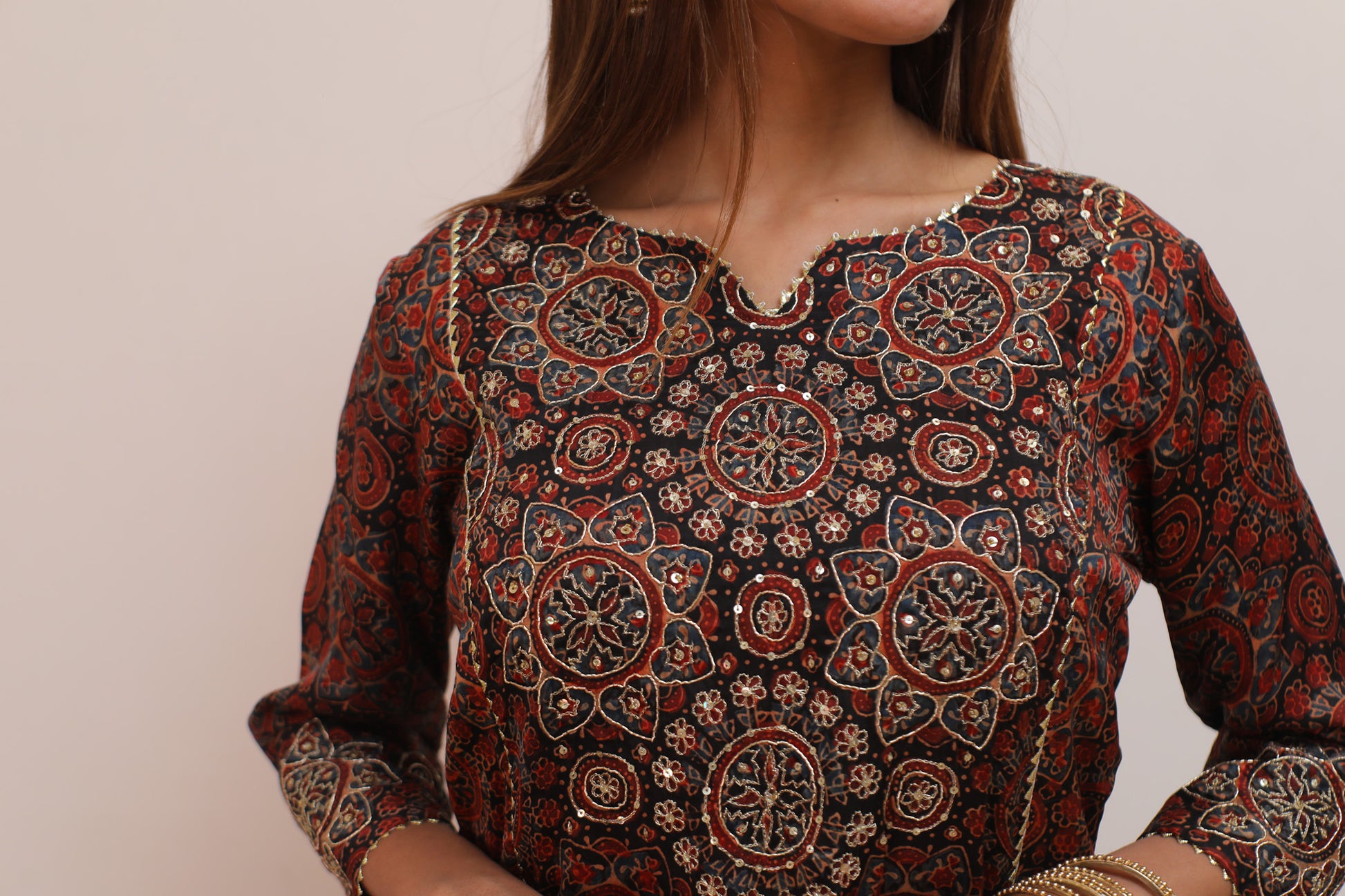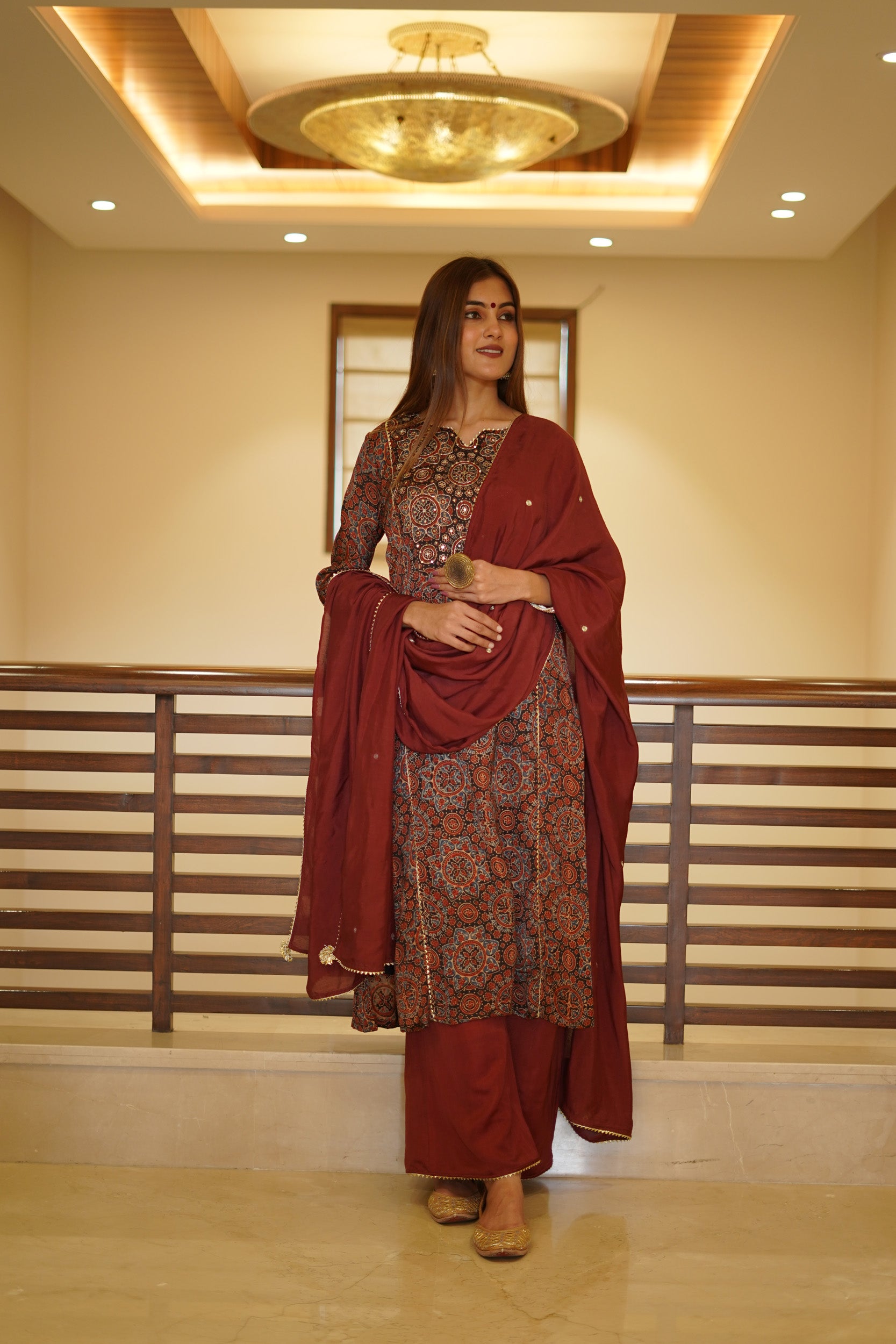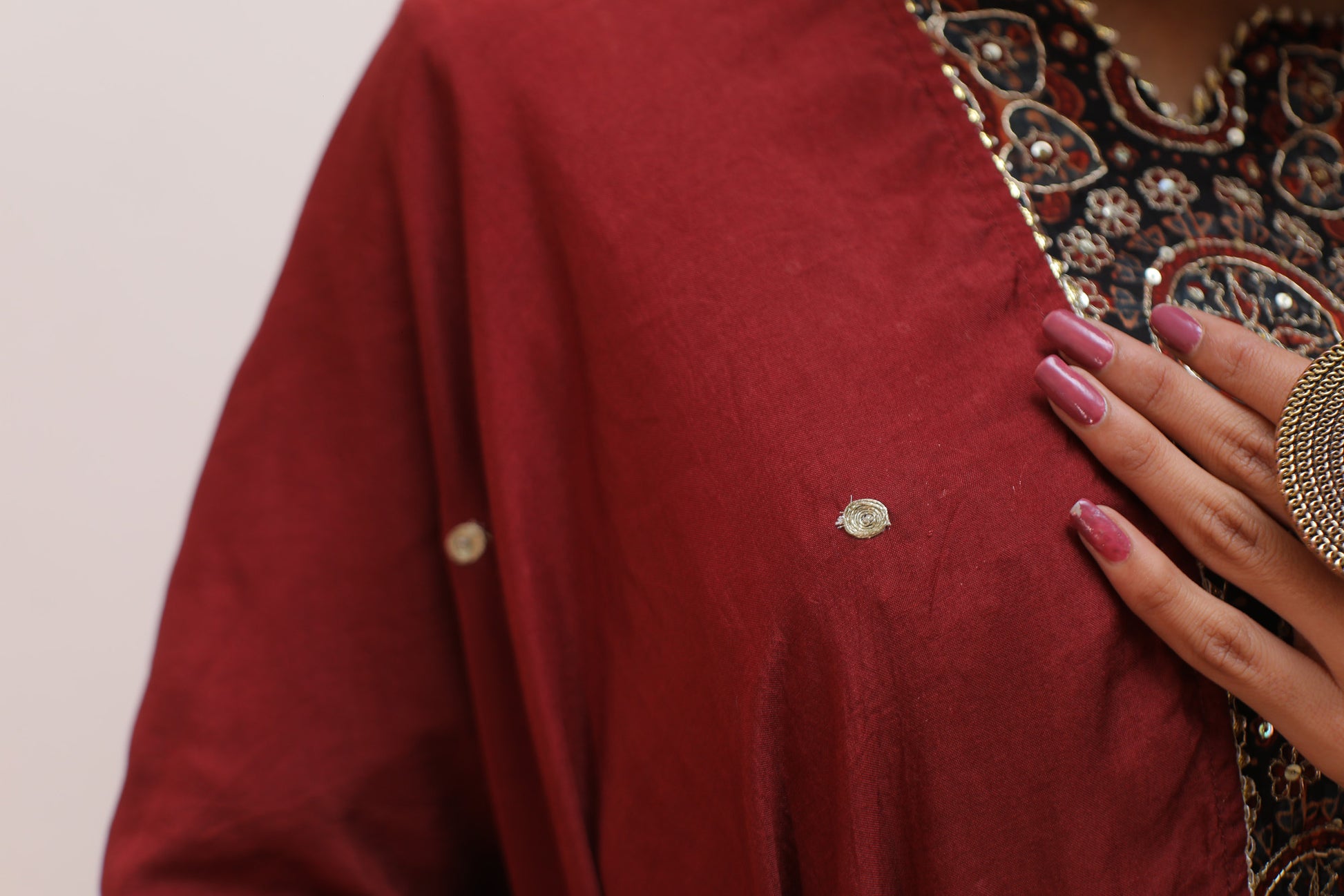 Black Maroon ajrakh print Modal Zari zardozi embellished suit set
