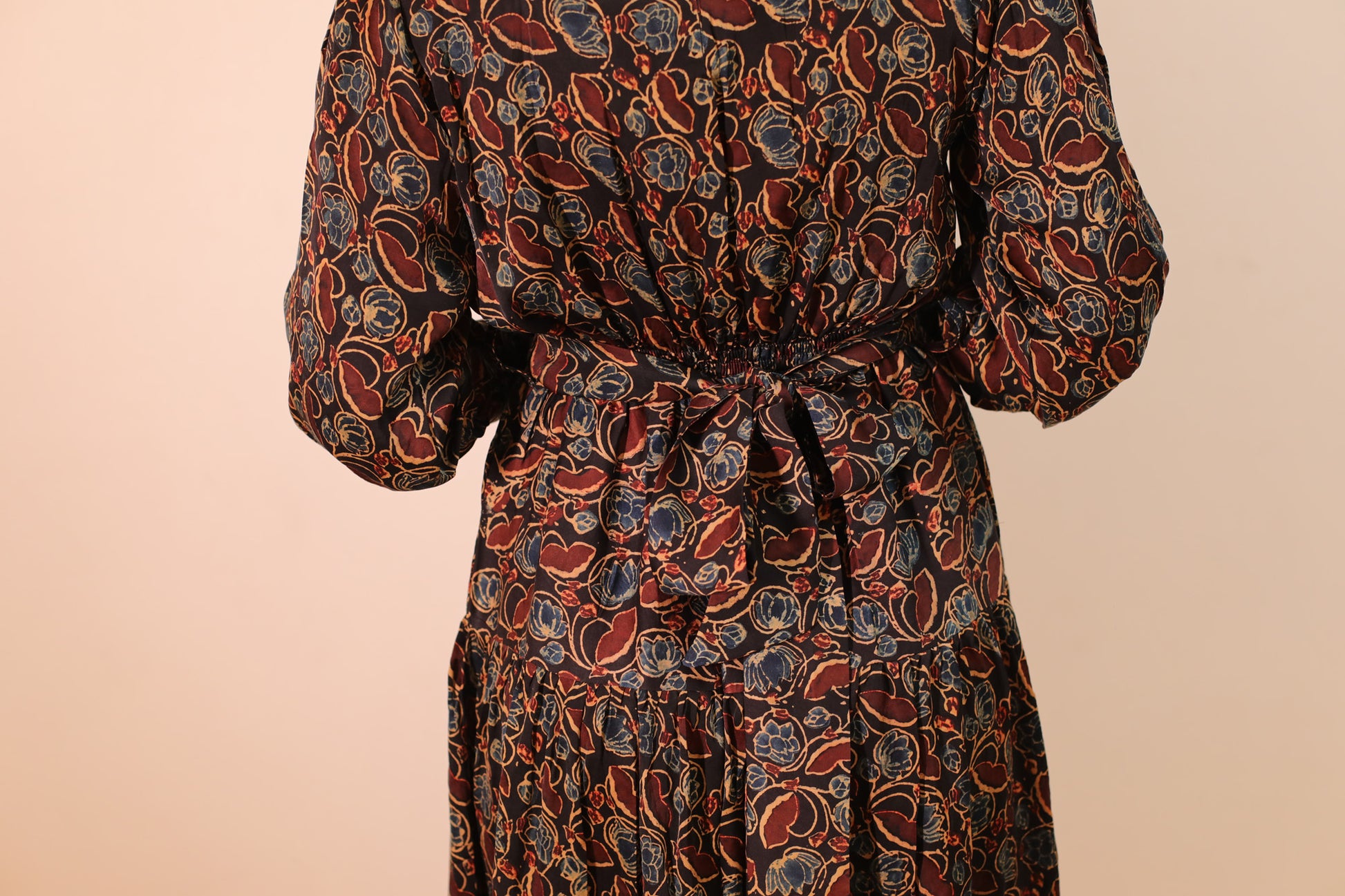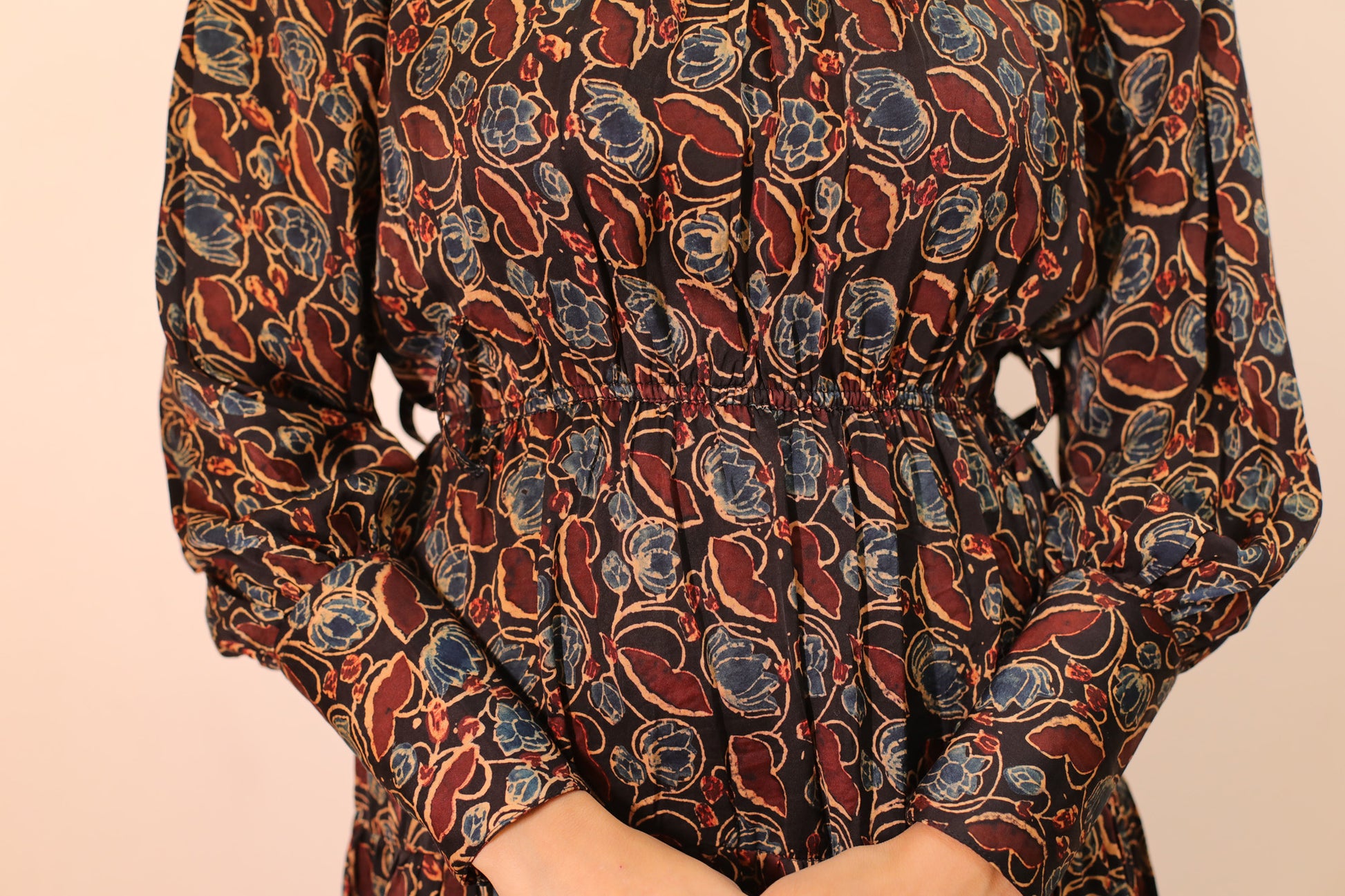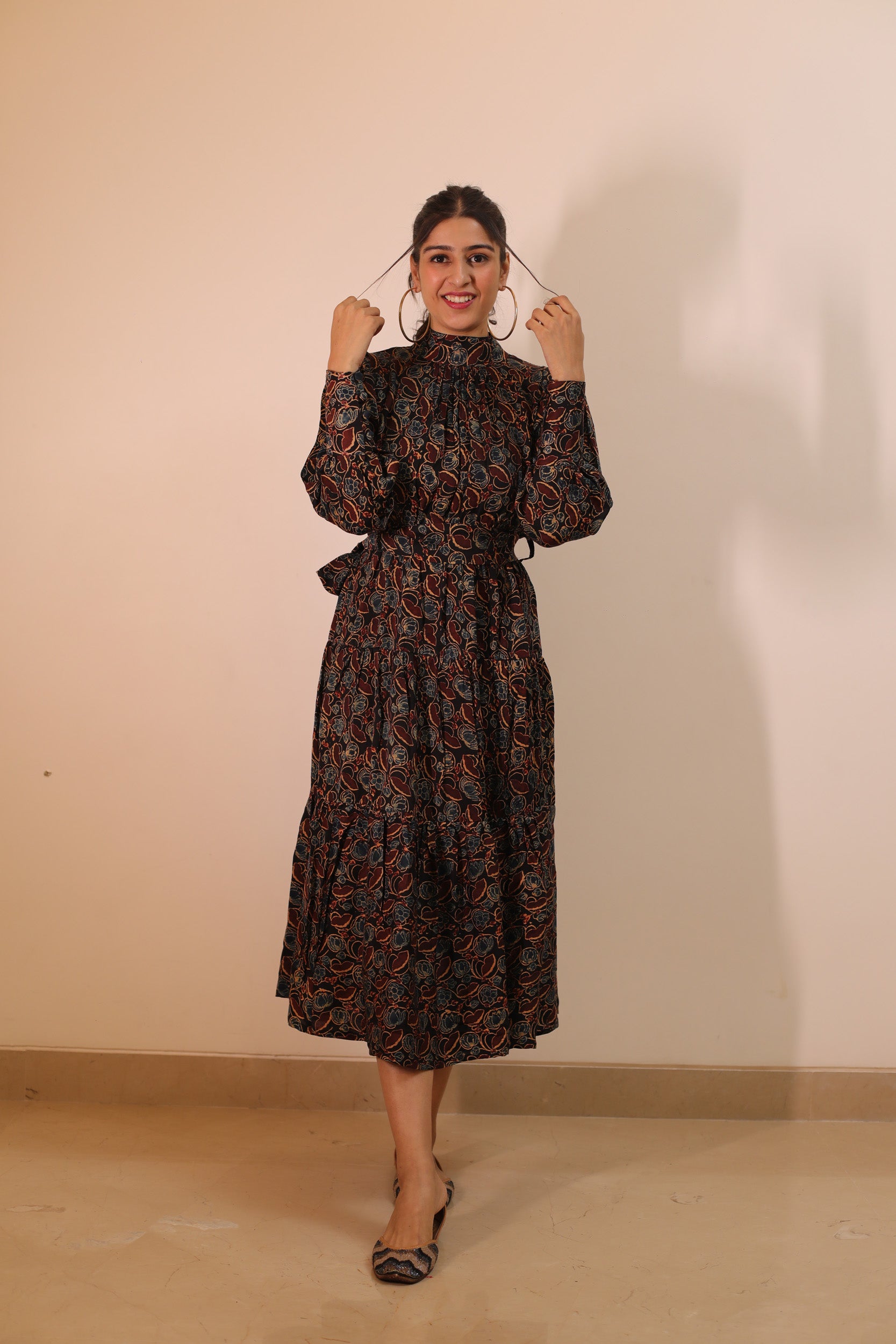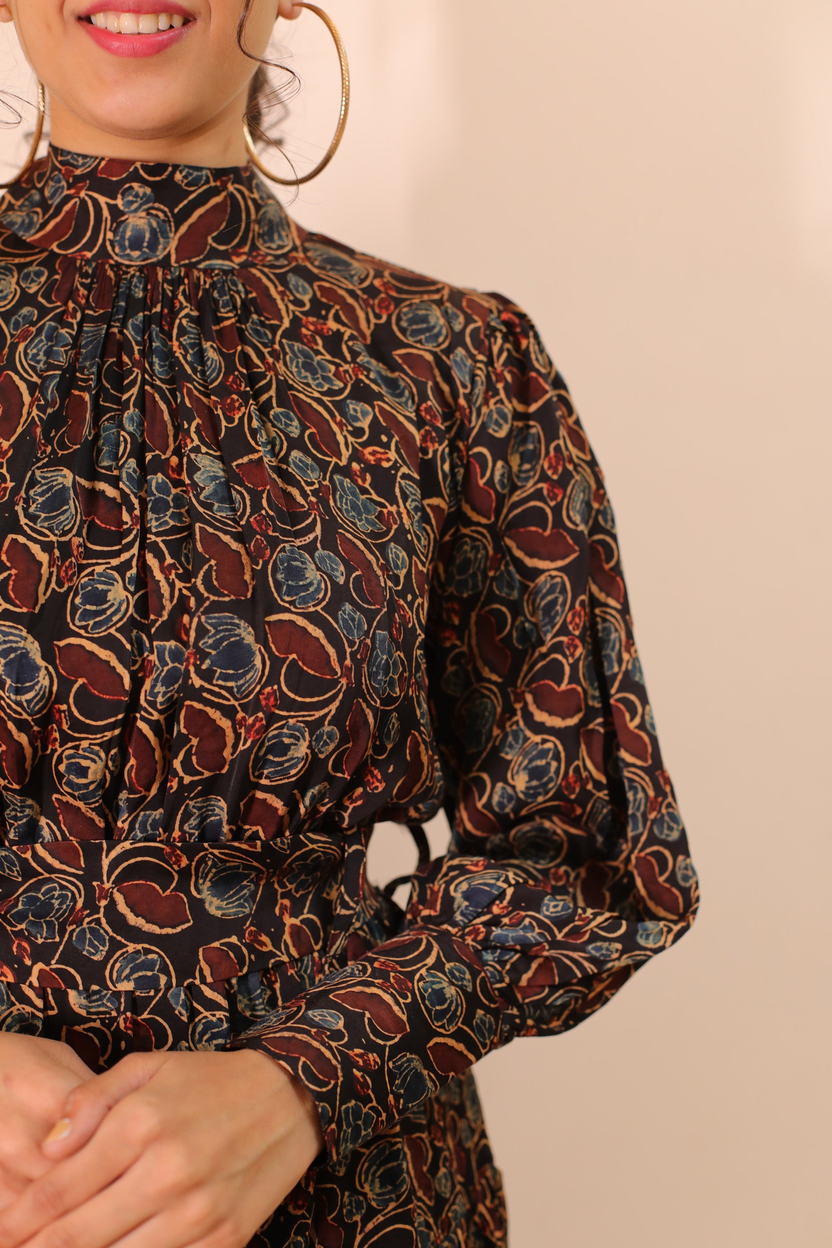 This black modal dress features a high neck and long sleeves with cuffs, showcasing an elegant ajrakh floral jal pattern in maroon and blue. Crafted for comfort and style, its breathable modal fabric ensures a soft touch, while the intricate print adds a refined, artisanal appeal suitable for both casual and formal occasions.