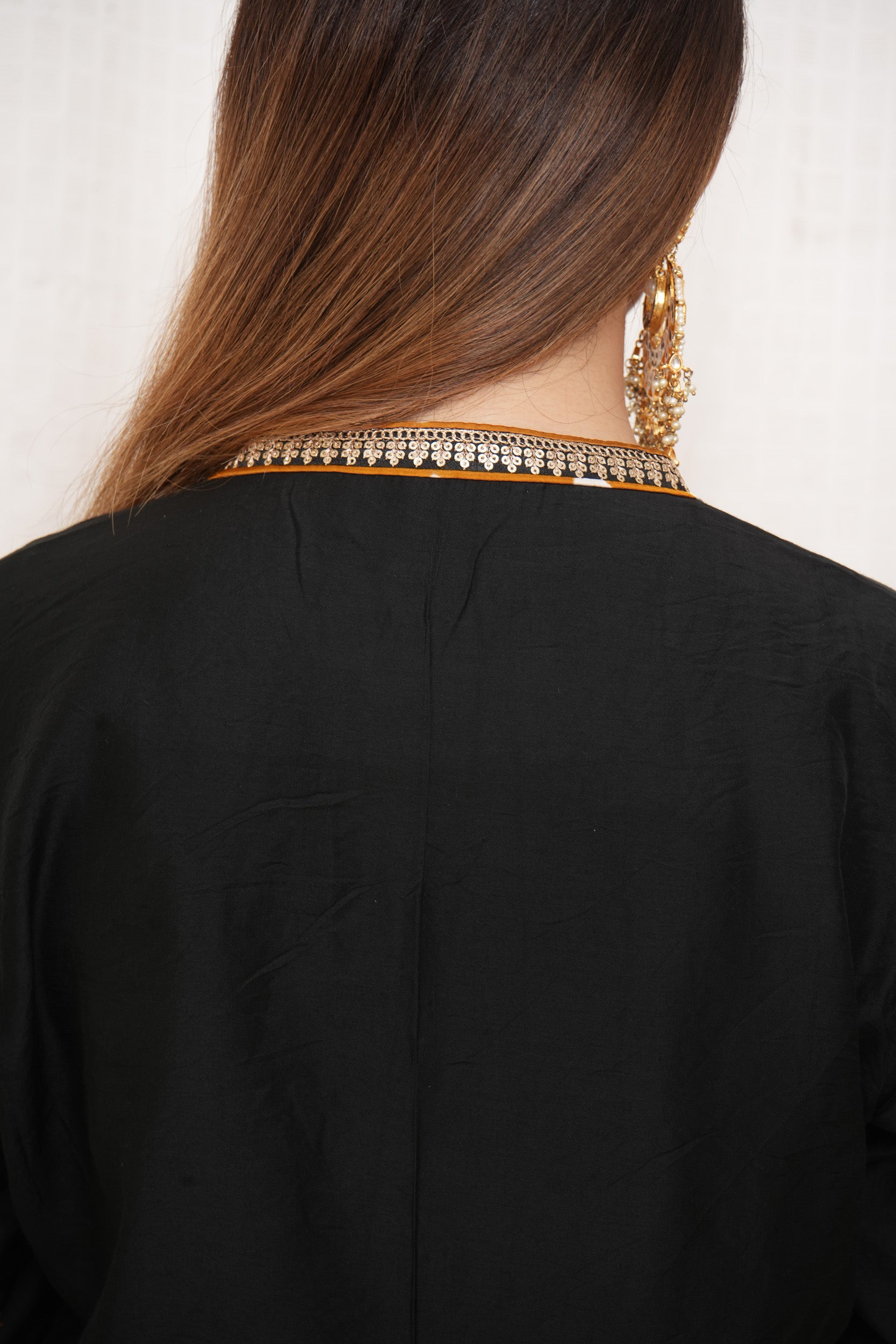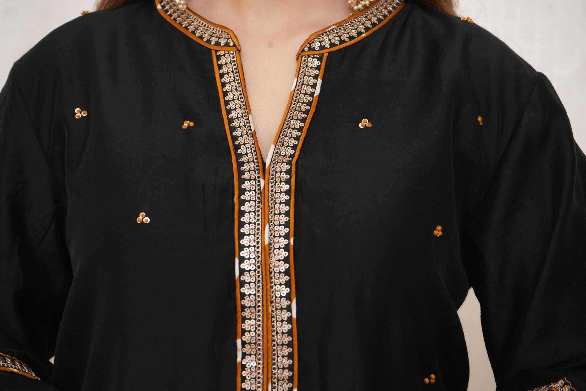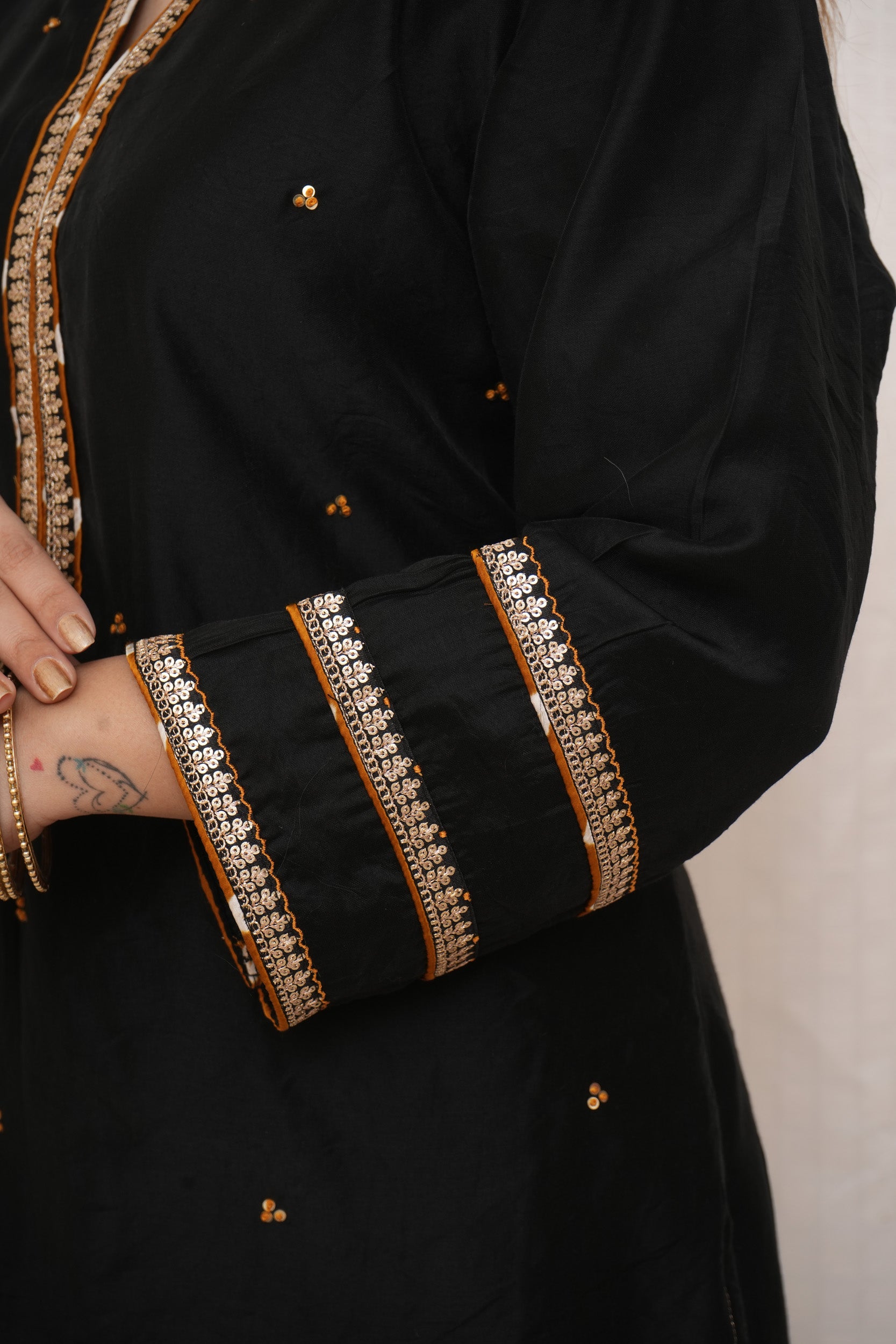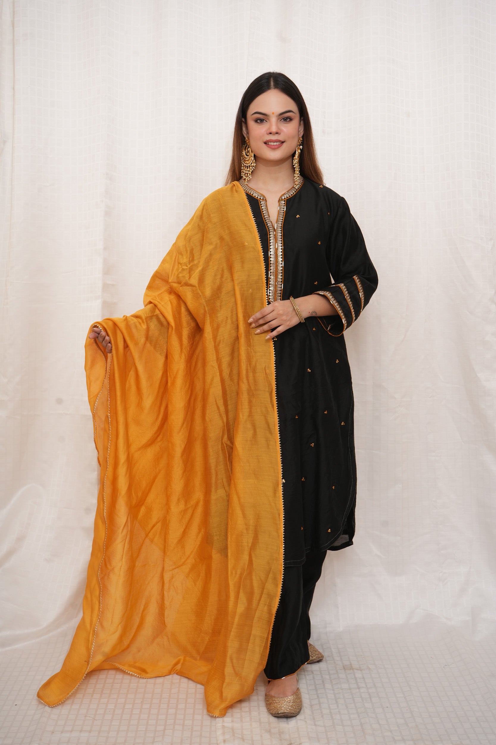Black sequence embellished Chanderi suitset with yellow dupatta