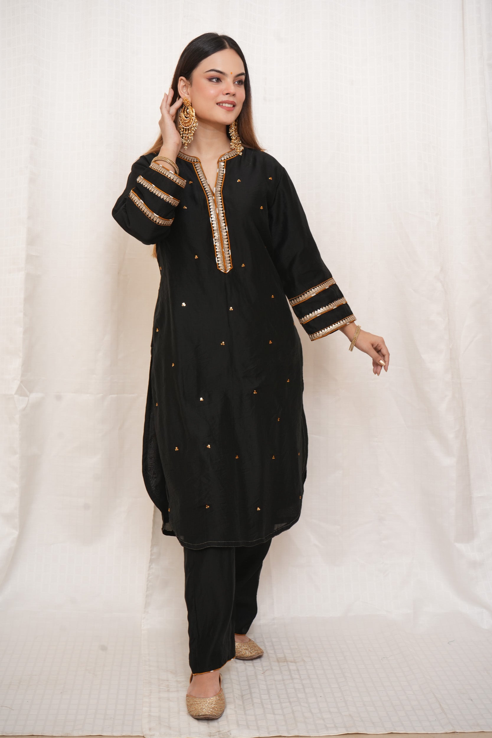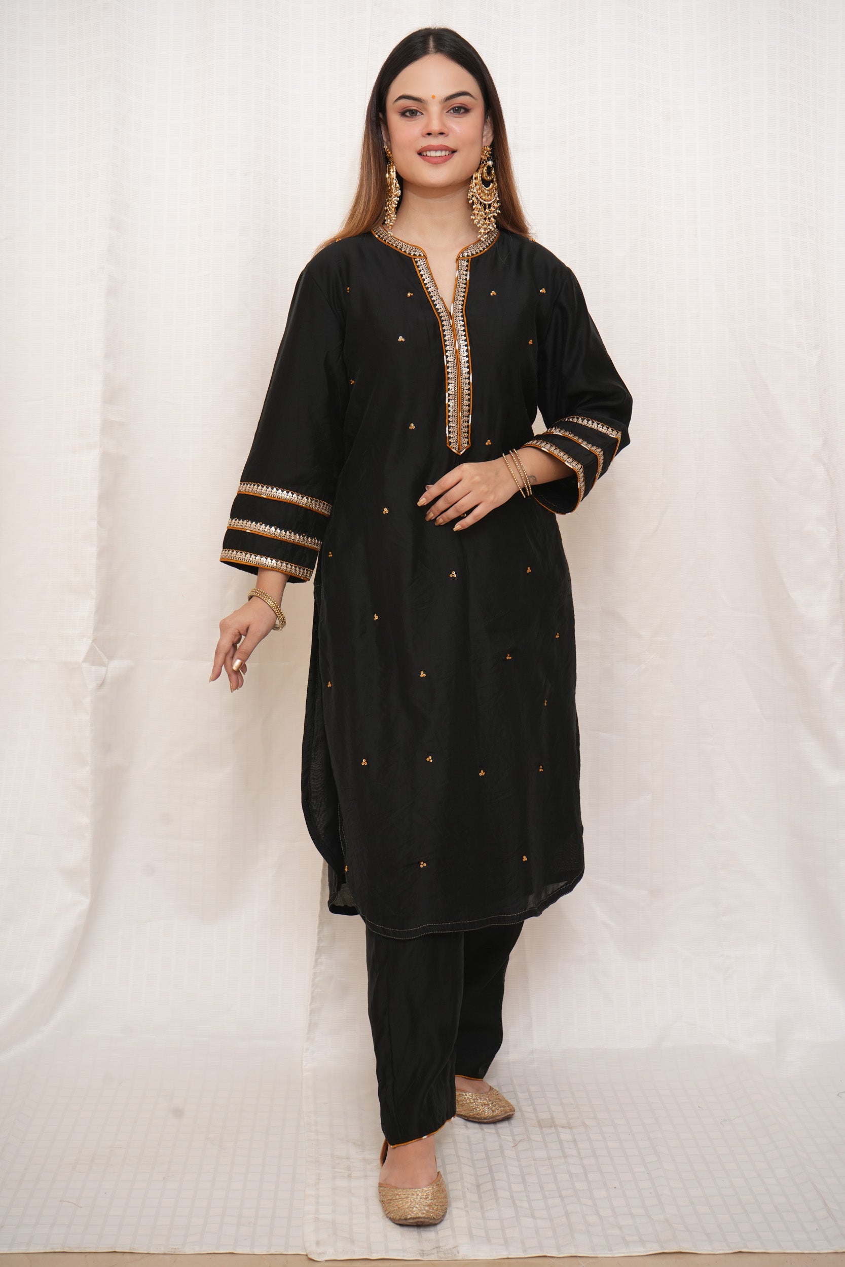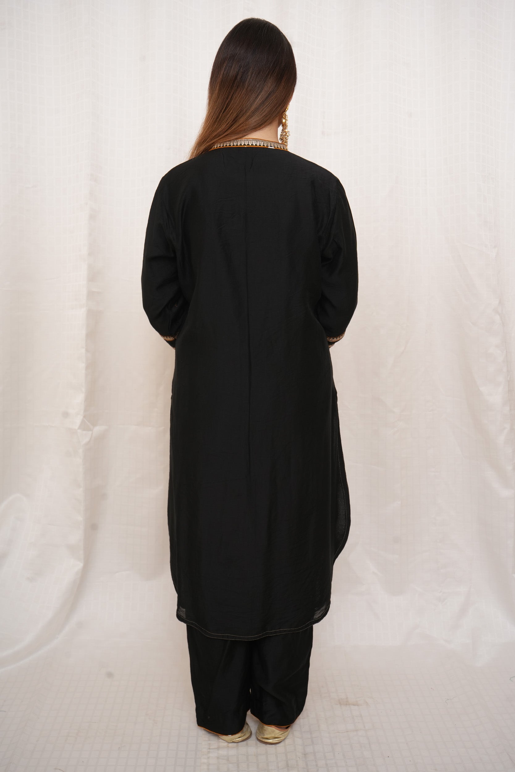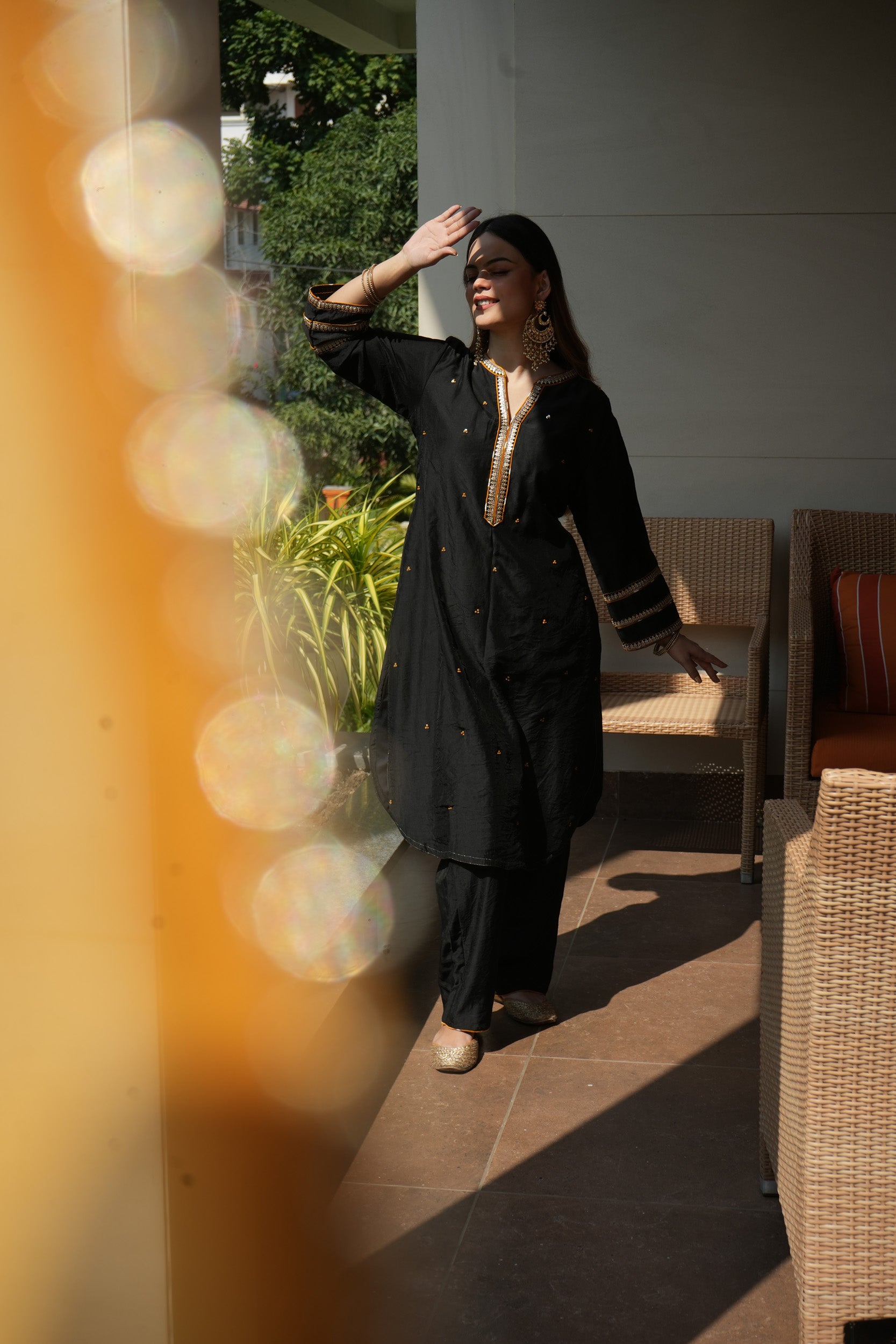 Black sequence embellished Chanderi suitset with yellow dupatta