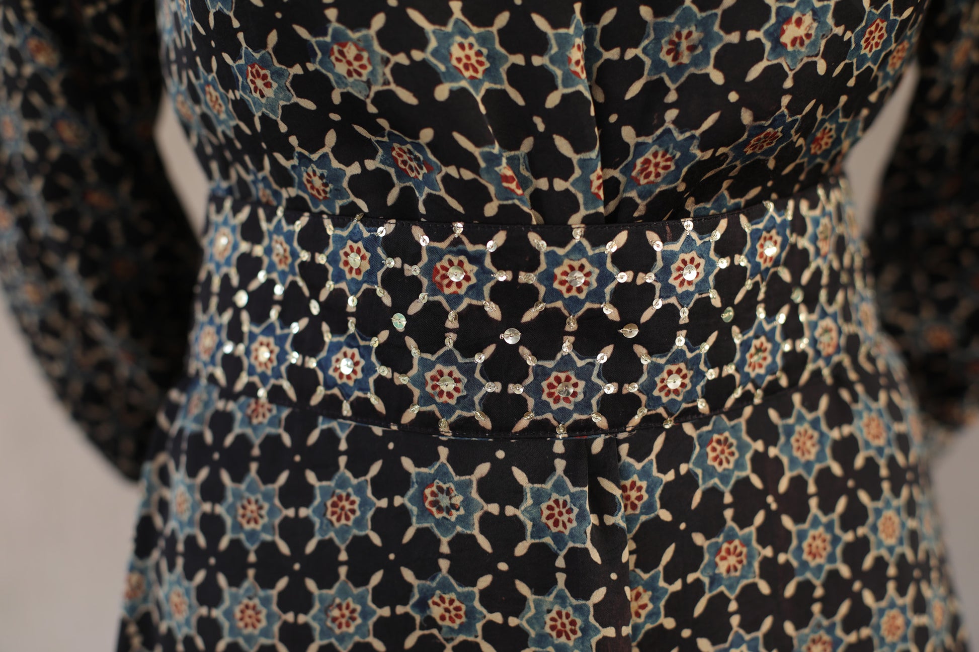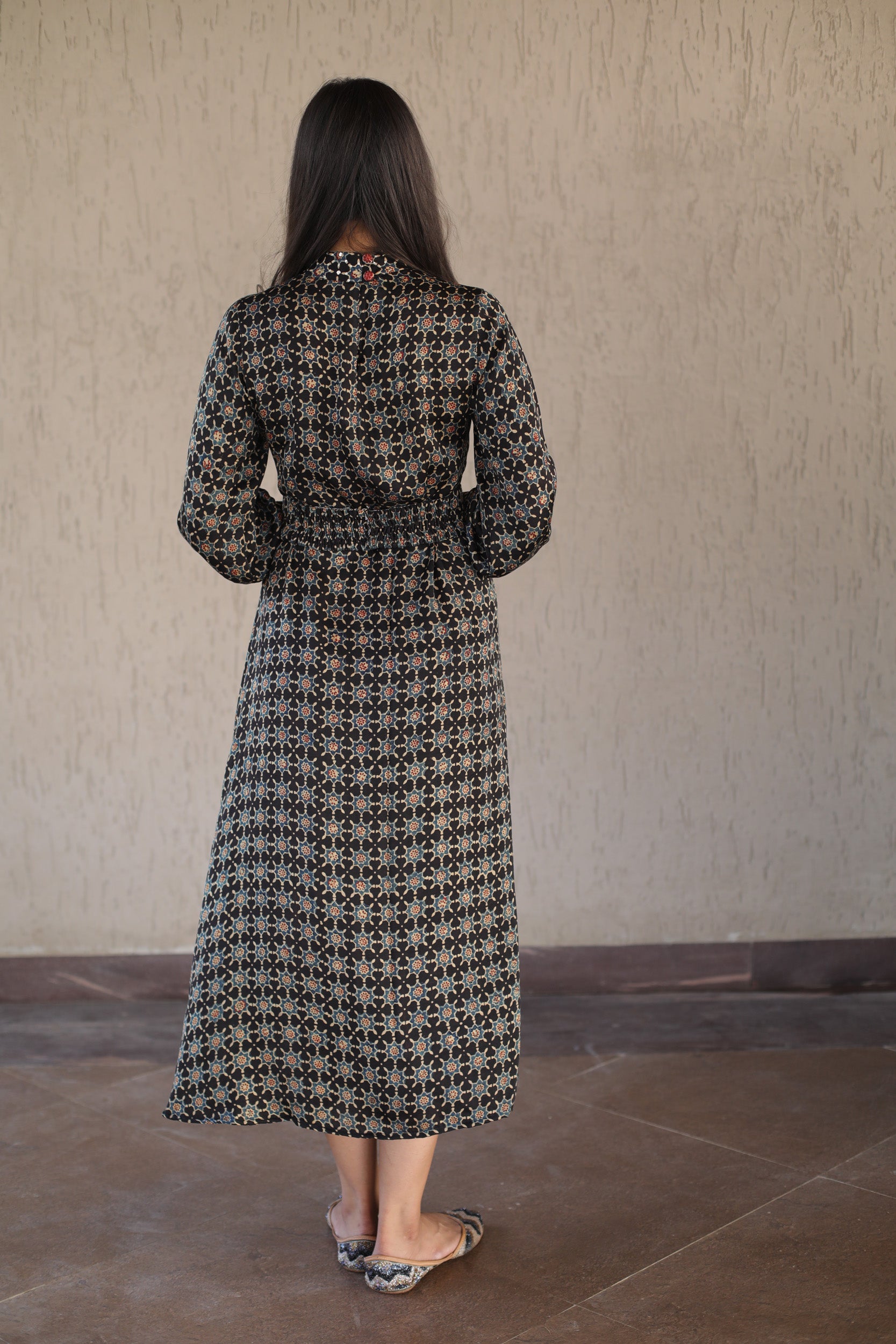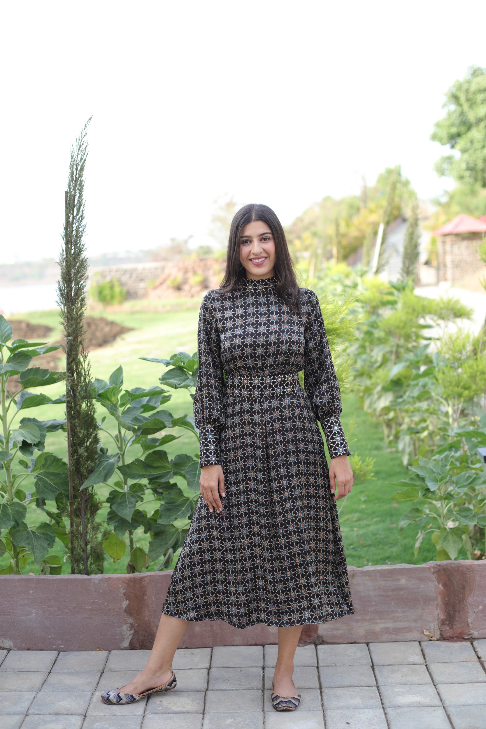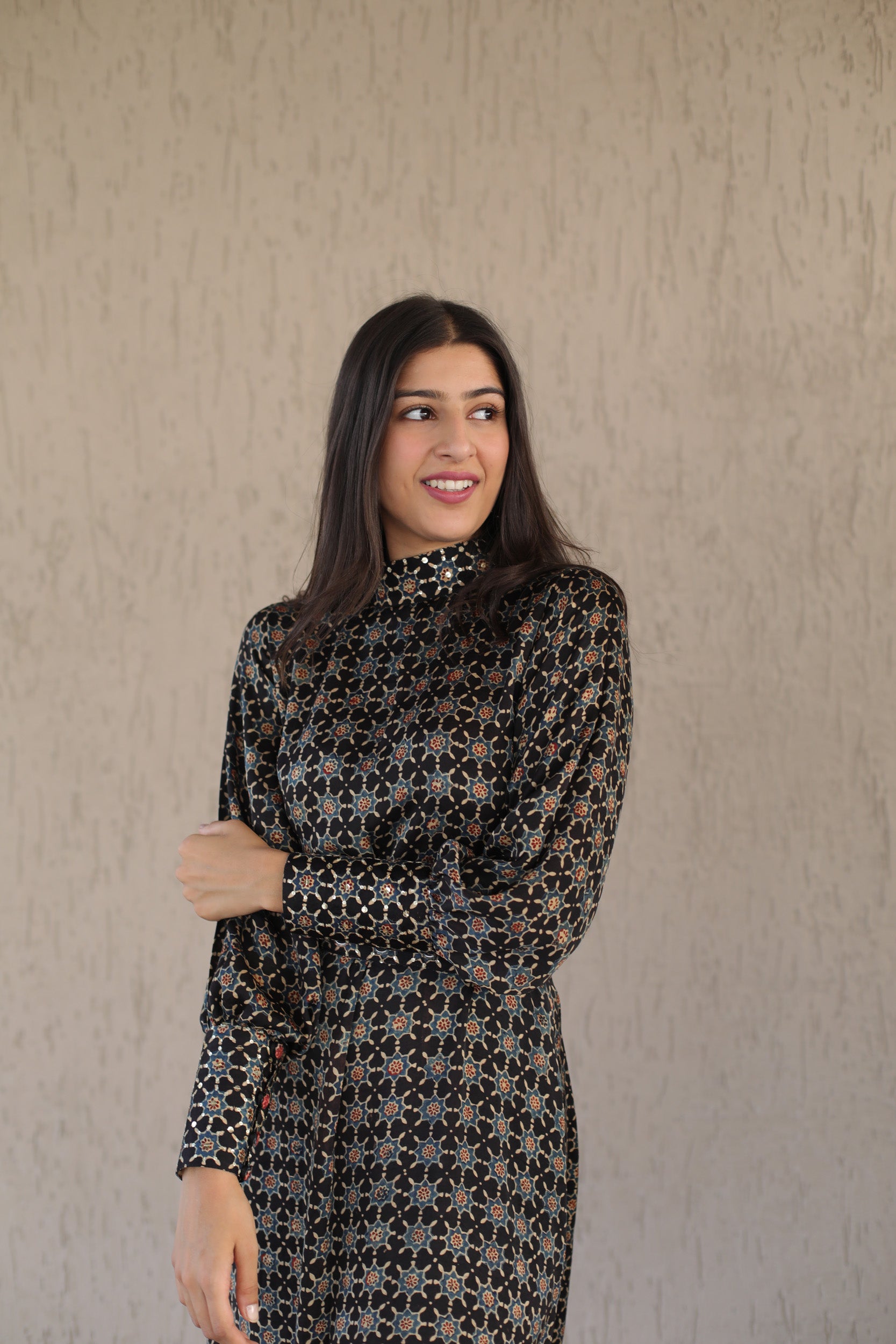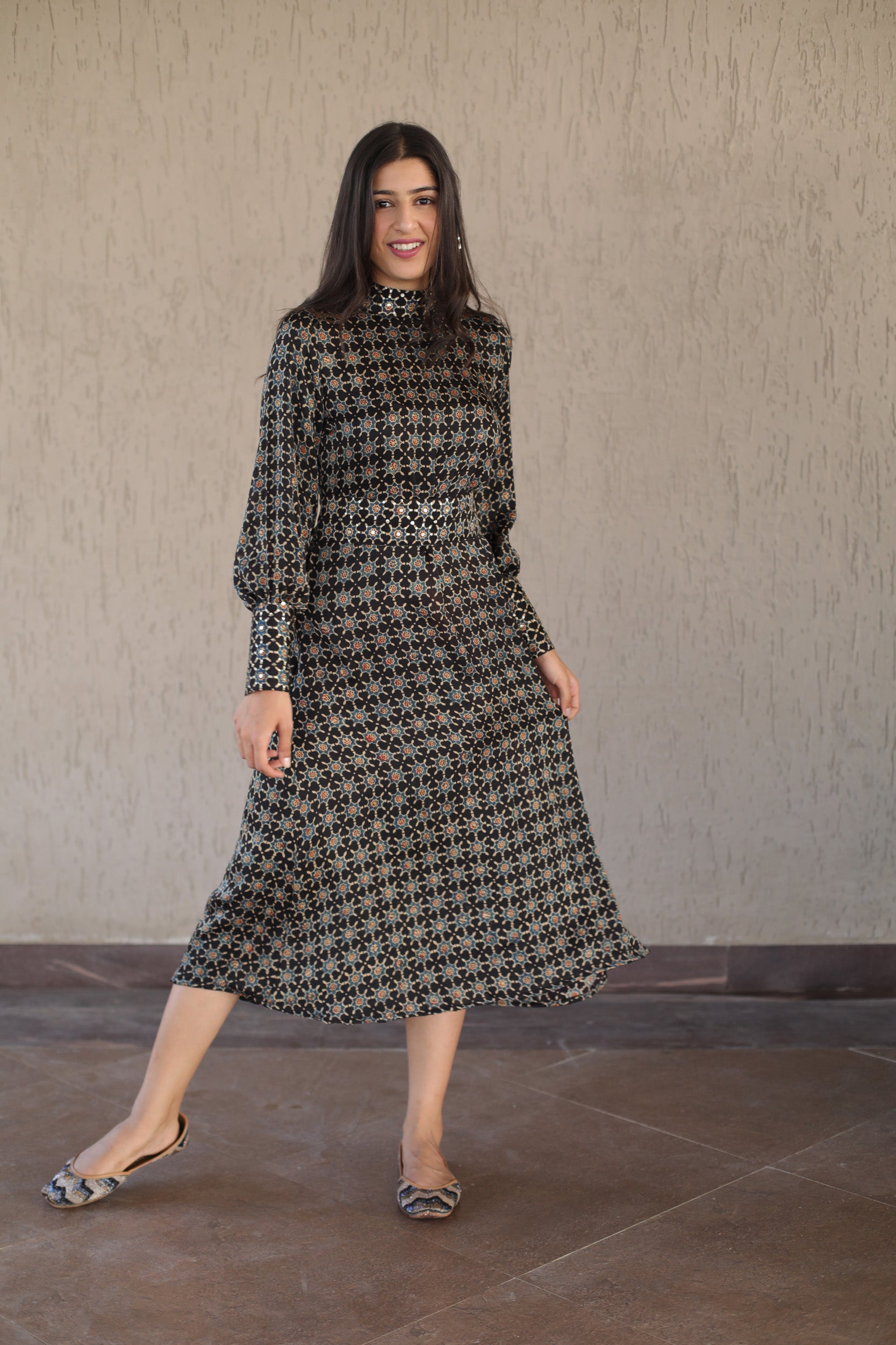 This elegant black dress features a high neck and cuffs adorned with intricate sequins, enhancing its sophisticated appeal. Crafted from soft modal silk, it showcases a striking star print inspired by traditional Ajrakh patterns. The embellished belt cinches the waist, adding definition and a refined finishing touch. Perfect for formal occasions, this dress combines artisanal craftsmanship with contemporary style for a standout look.