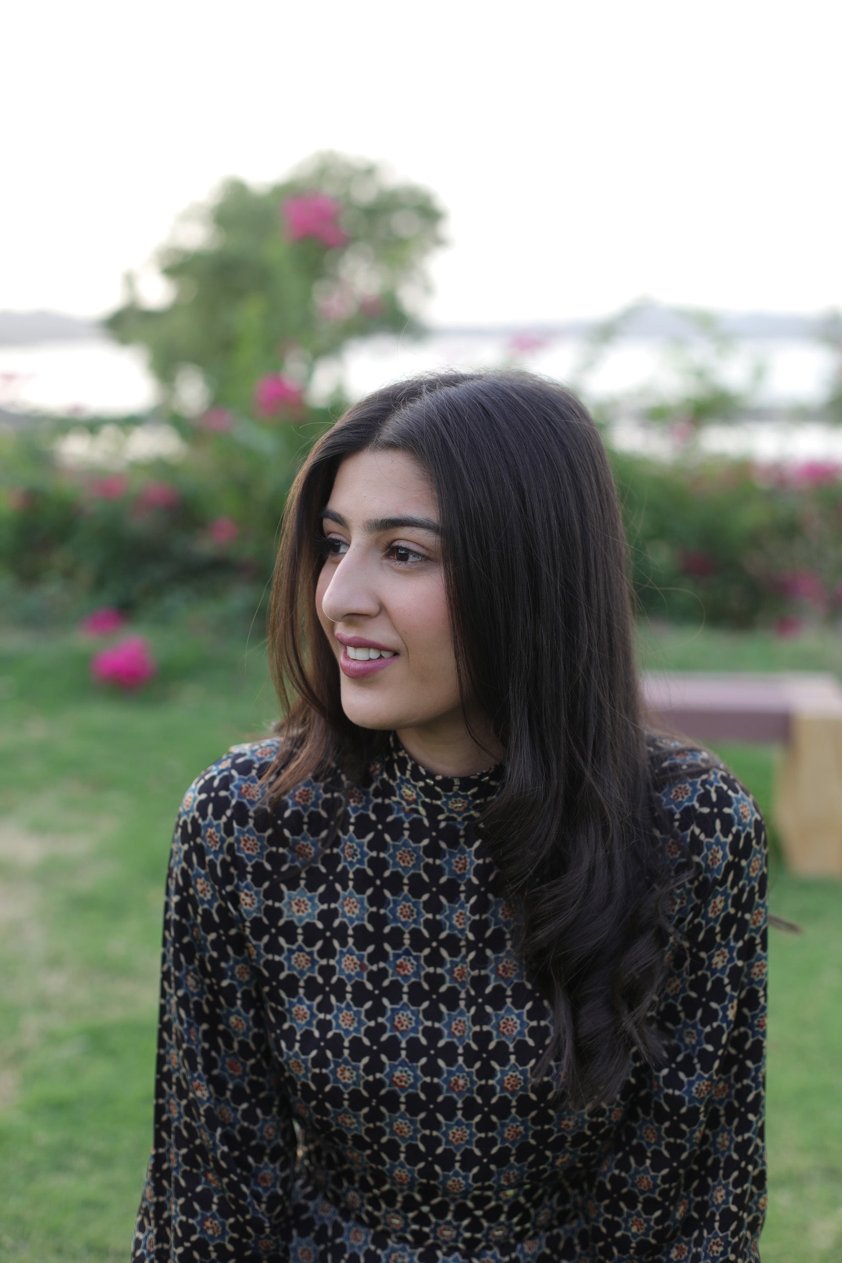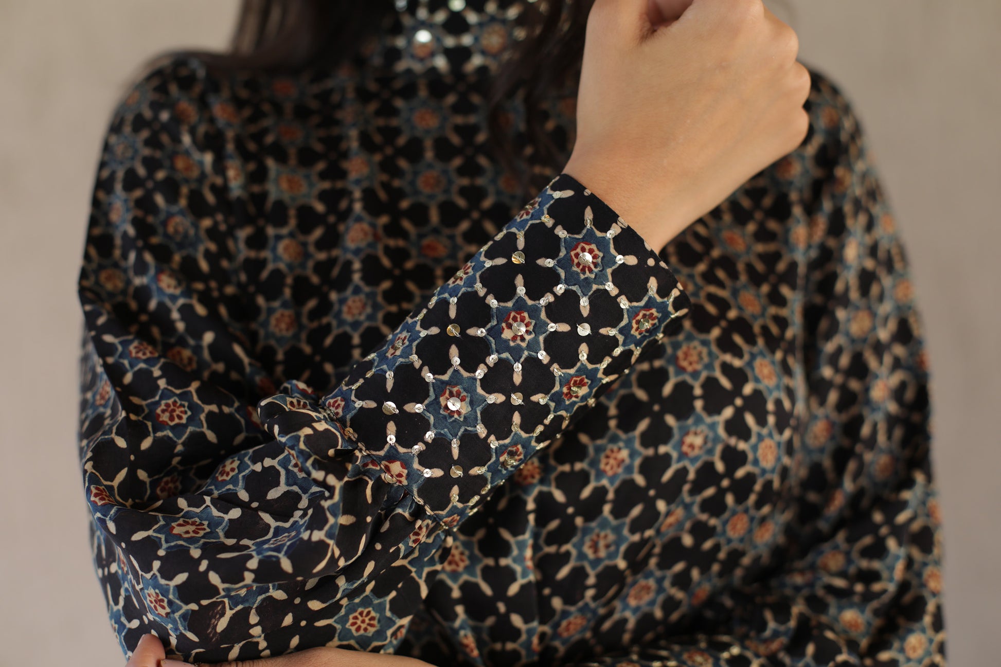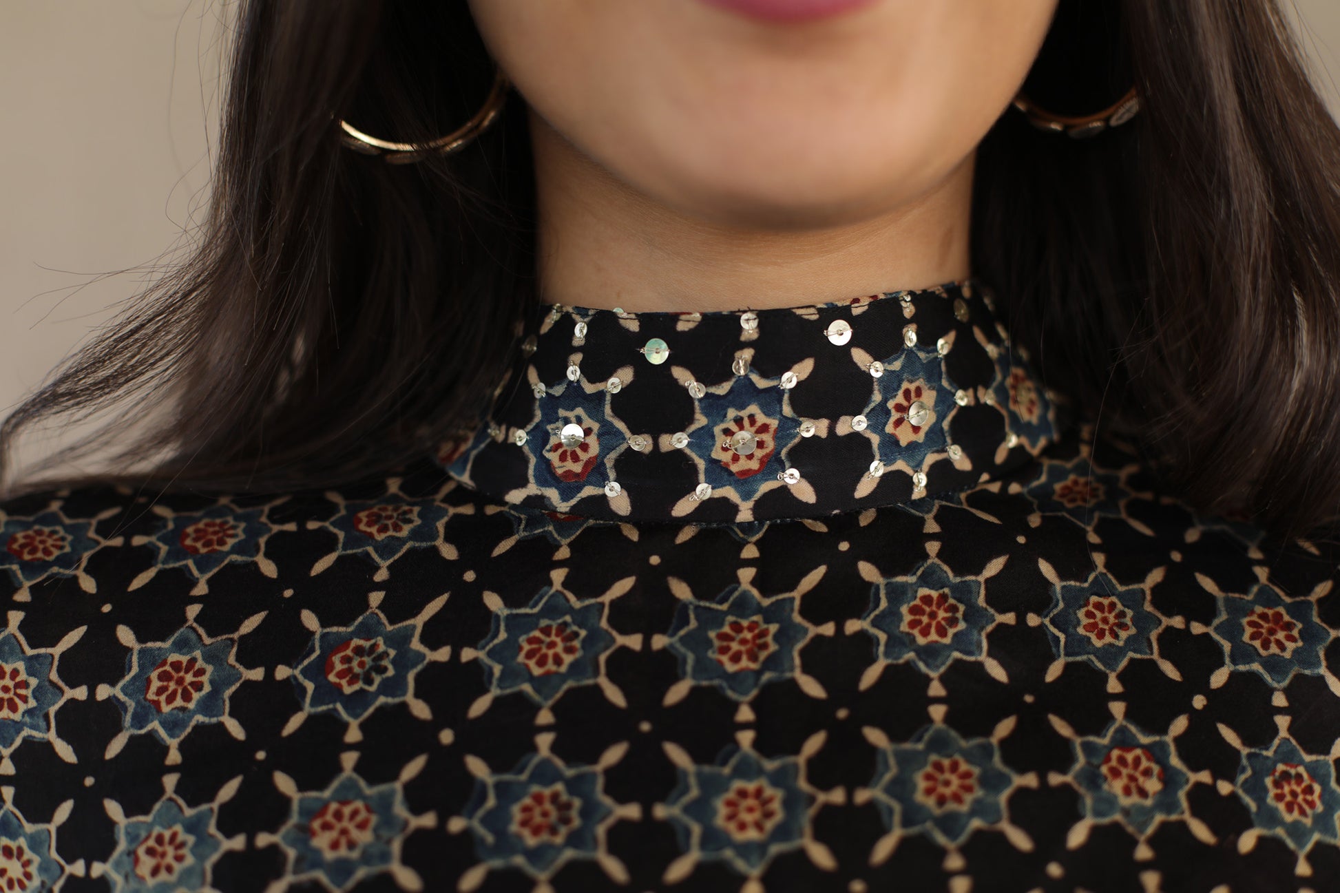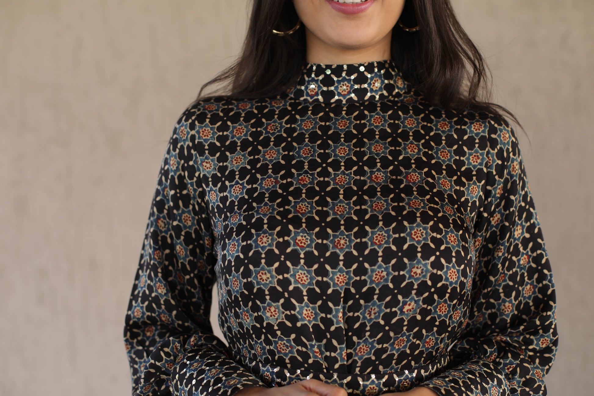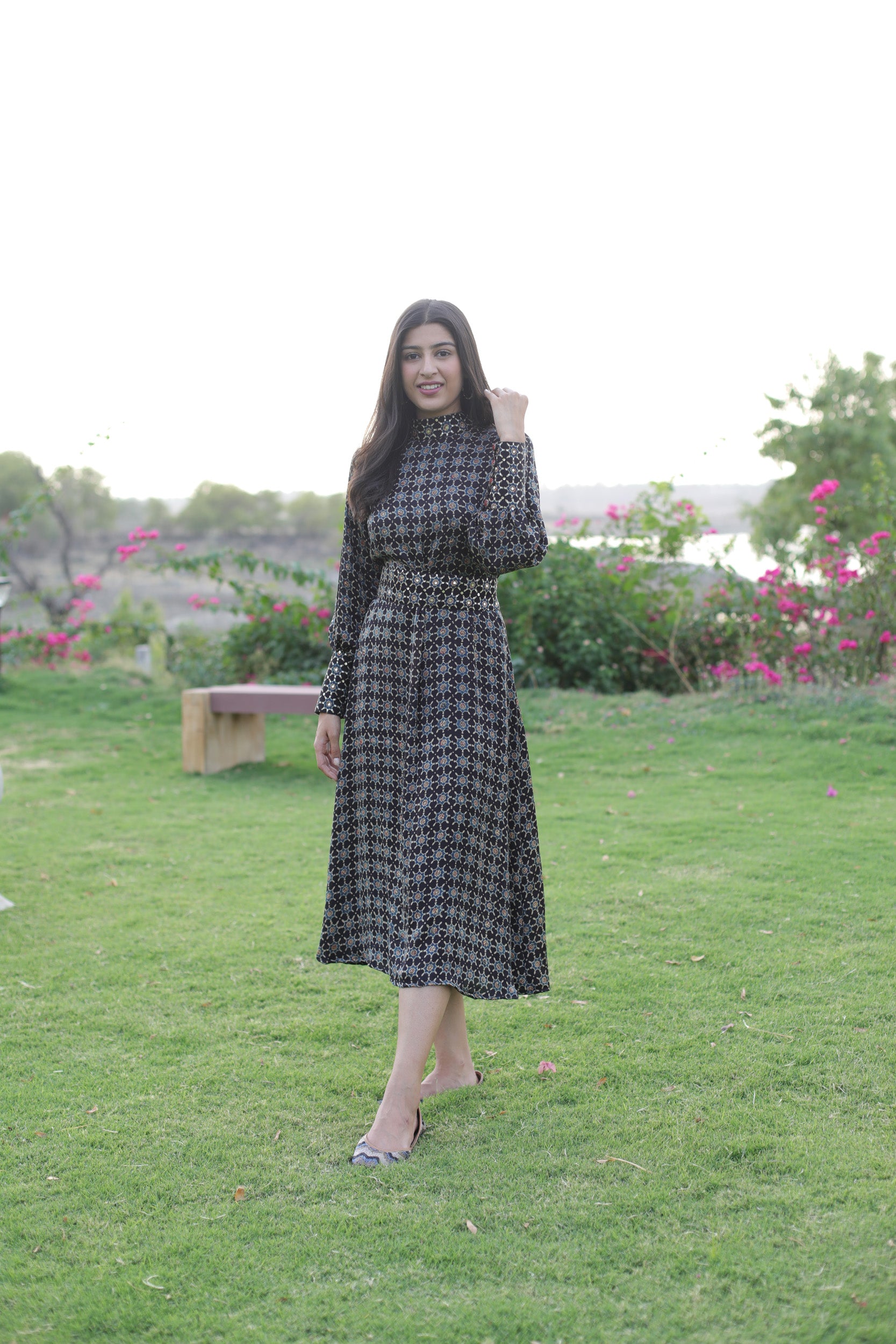 This elegant black dress features a high neck and cuffs adorned with intricate sequins, enhancing its sophisticated appeal. Crafted from soft modal silk, it showcases a striking star print inspired by traditional Ajrakh patterns. The embellished belt cinches the waist, adding definition and a refined finishing touch. Perfect for formal occasions, this dress combines artisanal craftsmanship with contemporary style for a standout look.