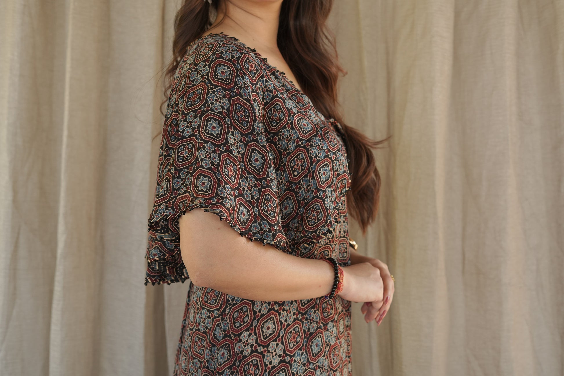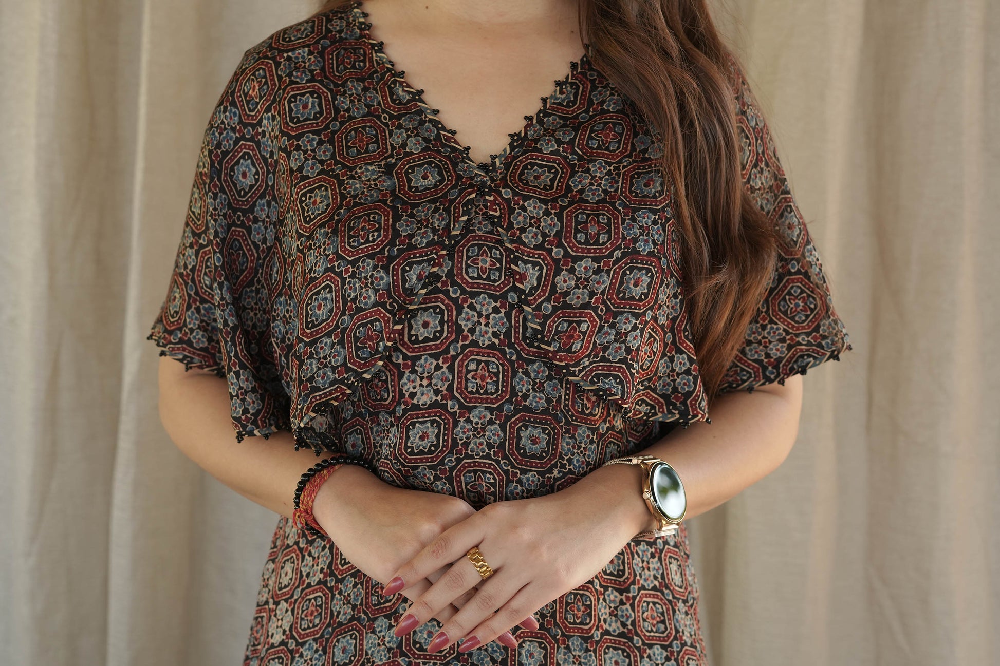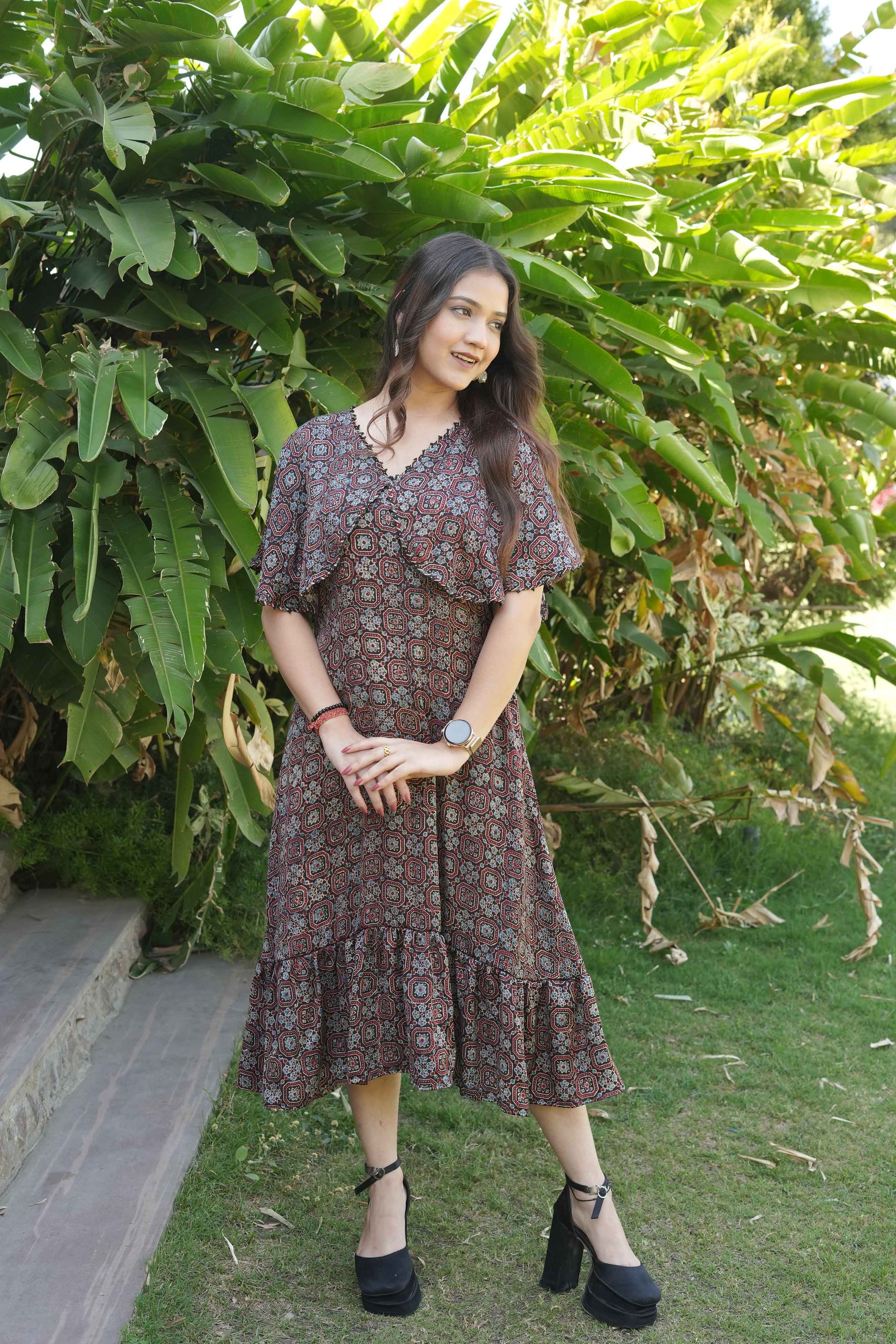 Elevate your wardrobe with this timeless black modal V-neck dress, thoughtfully handcrafted to reflect effortless elegance and sustainable charm. Featuring a flowing cape-style silhouette and delicate frill detailing at the hem, this dress merges modern femininity with artisanal roots.