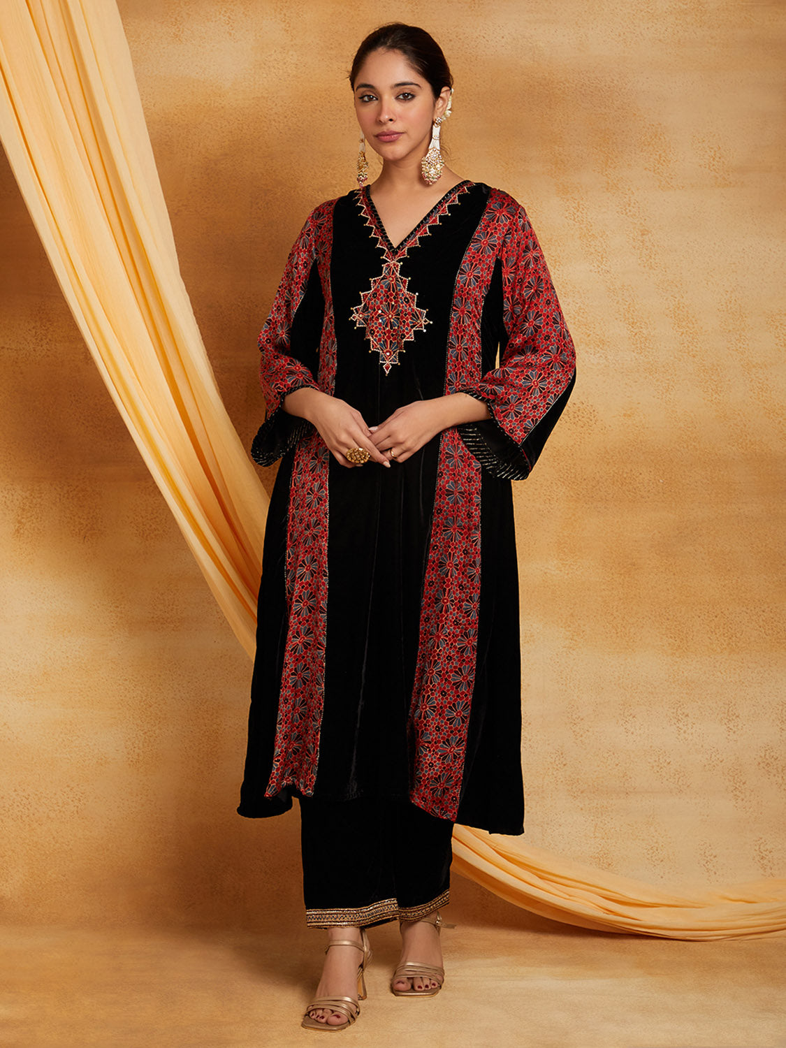 Crafted in black velvet the kurta has applique of ajrakh modal silk which is embroidered with golden threads.