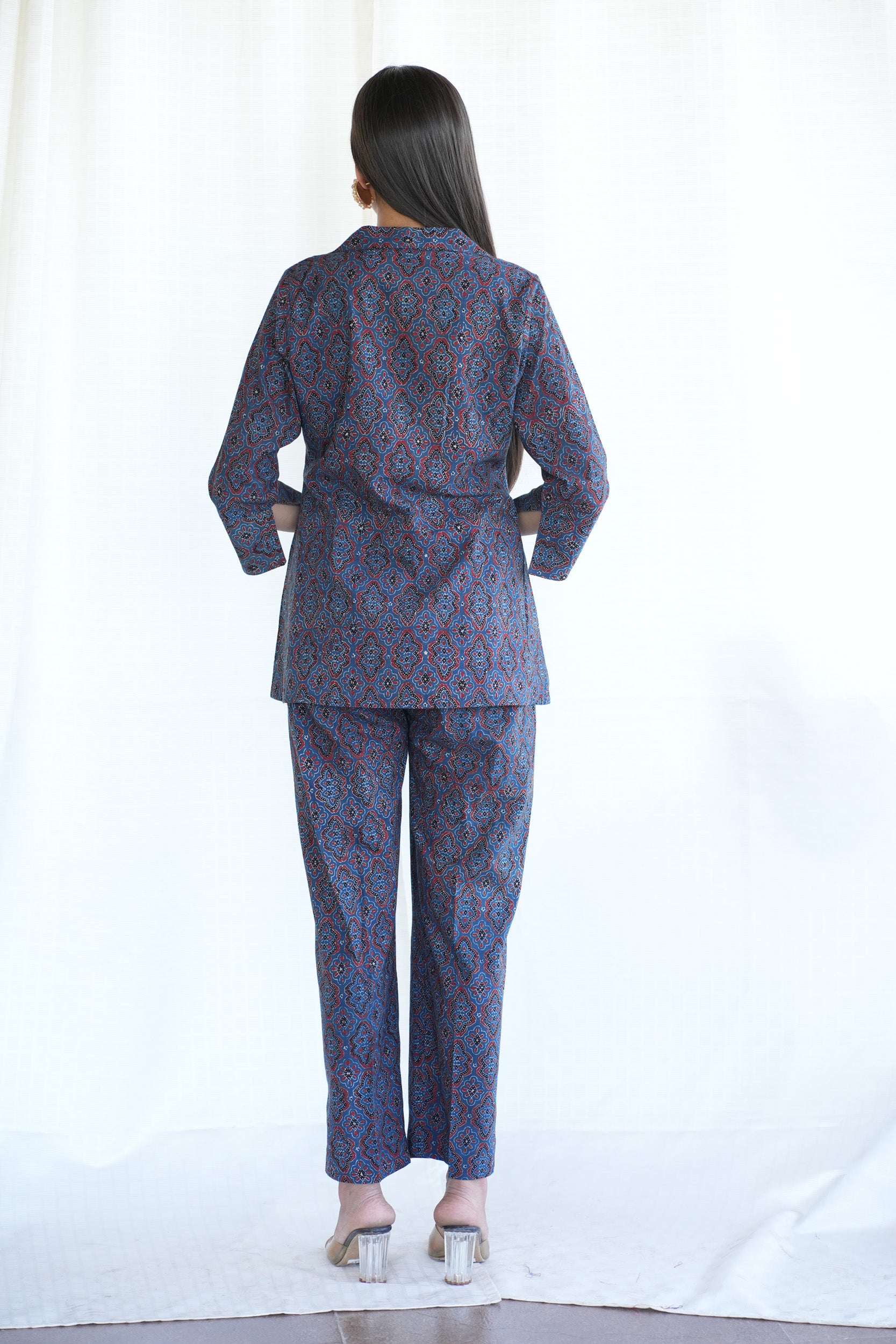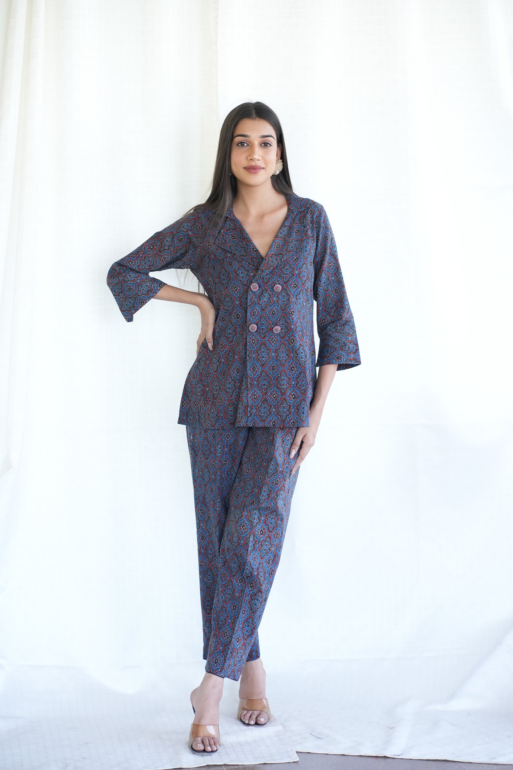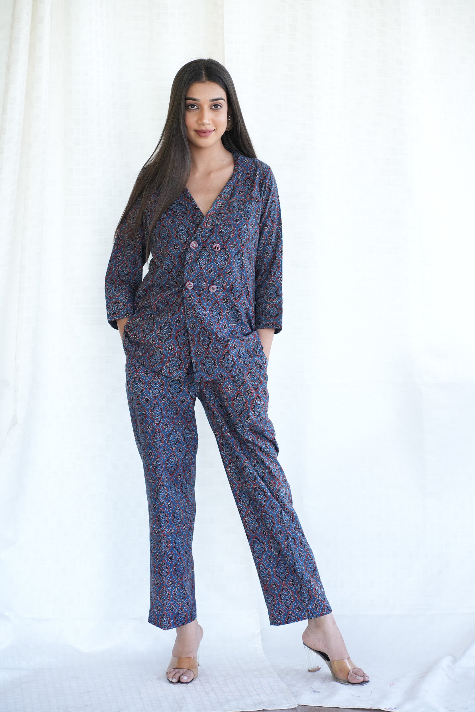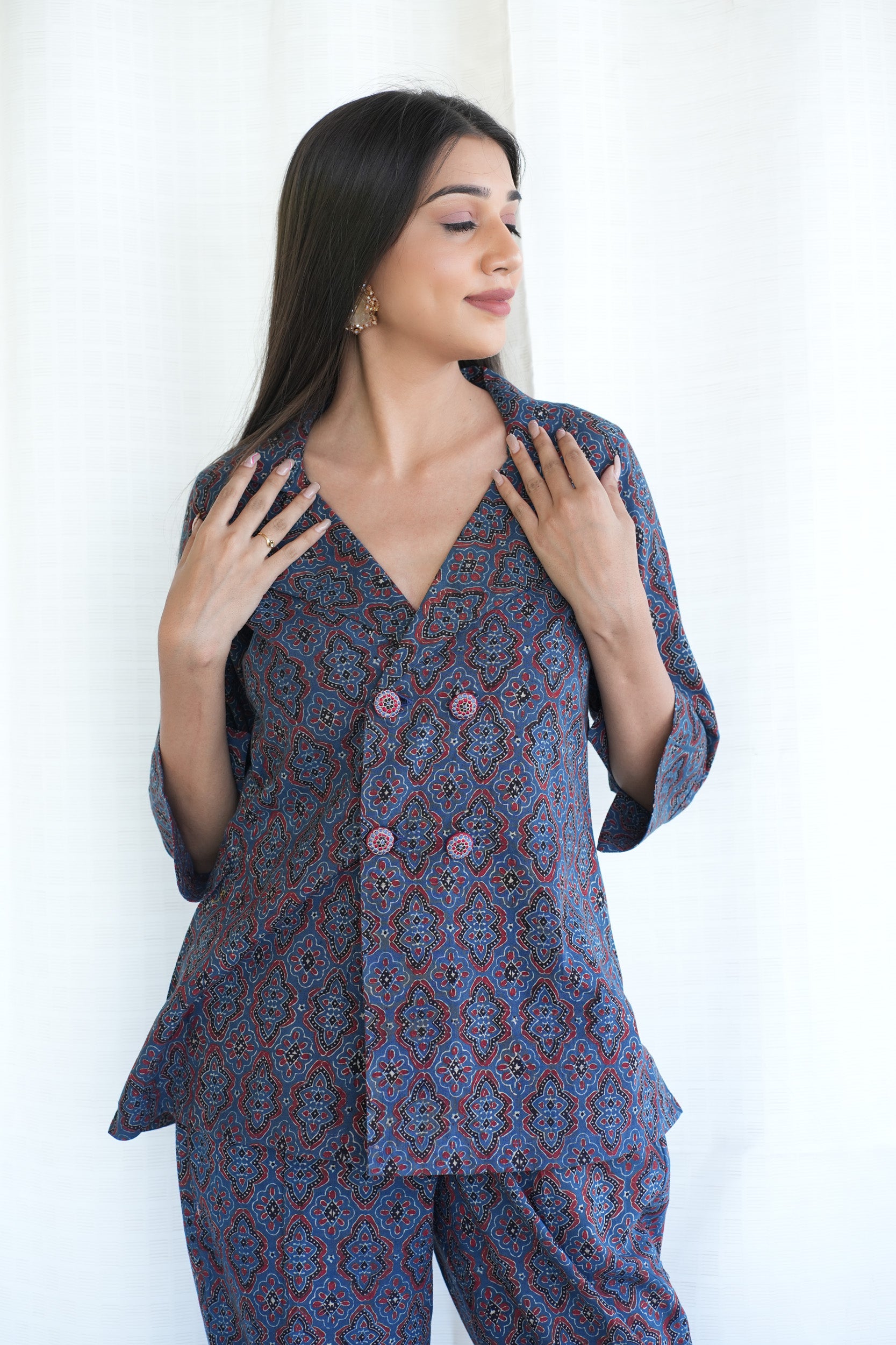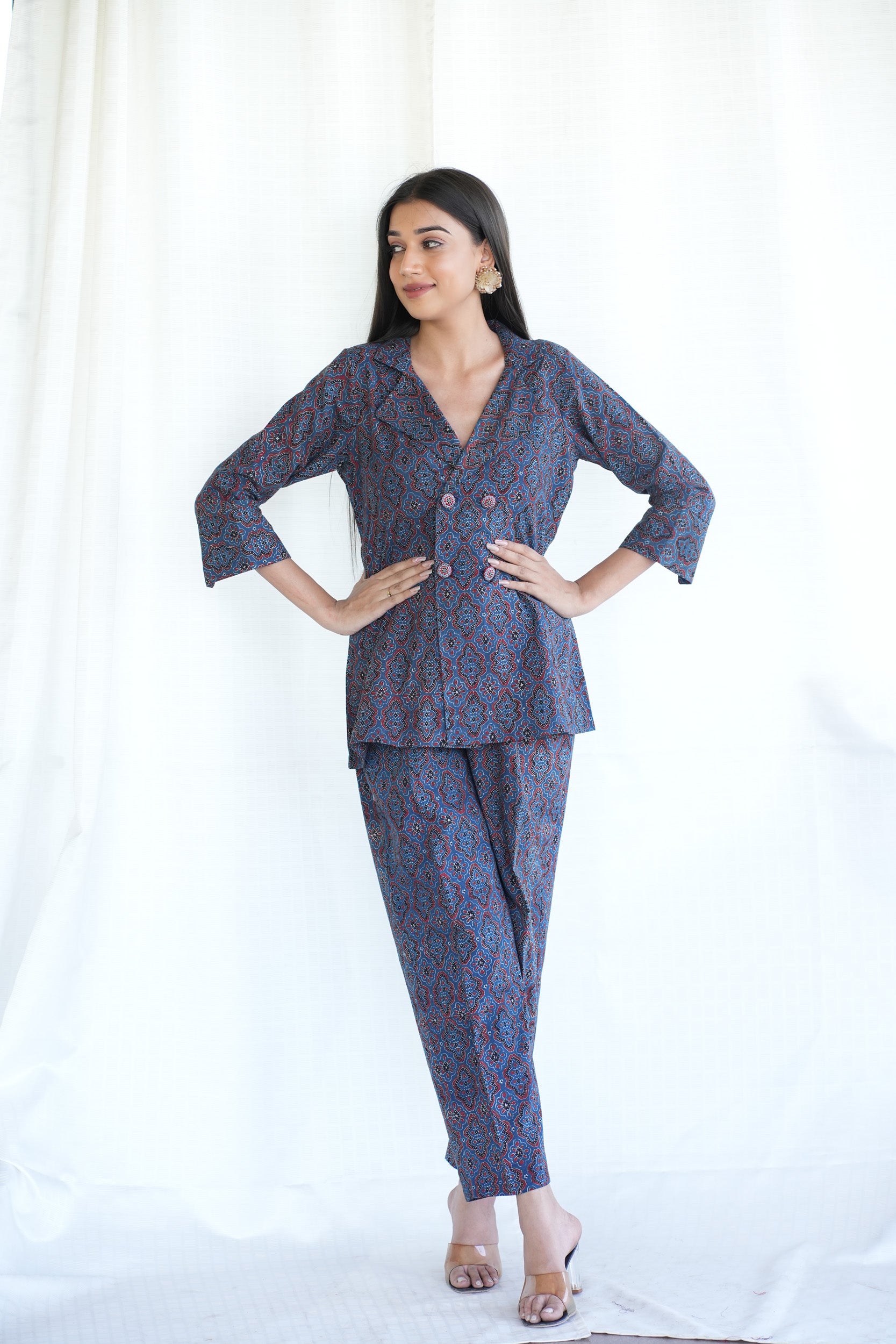 Elevate your office wardrobe with the Blue Ajrakh Cordset, featuring an intricate ajrakh print that showcases traditional craftsmanship. Enhanced with silk-embellished buttons, this set combines elegance and cultural heritage, making it an ideal choice for sophisticated desi officewear. Its refined design ensures you stand out with subtle yet striking style.