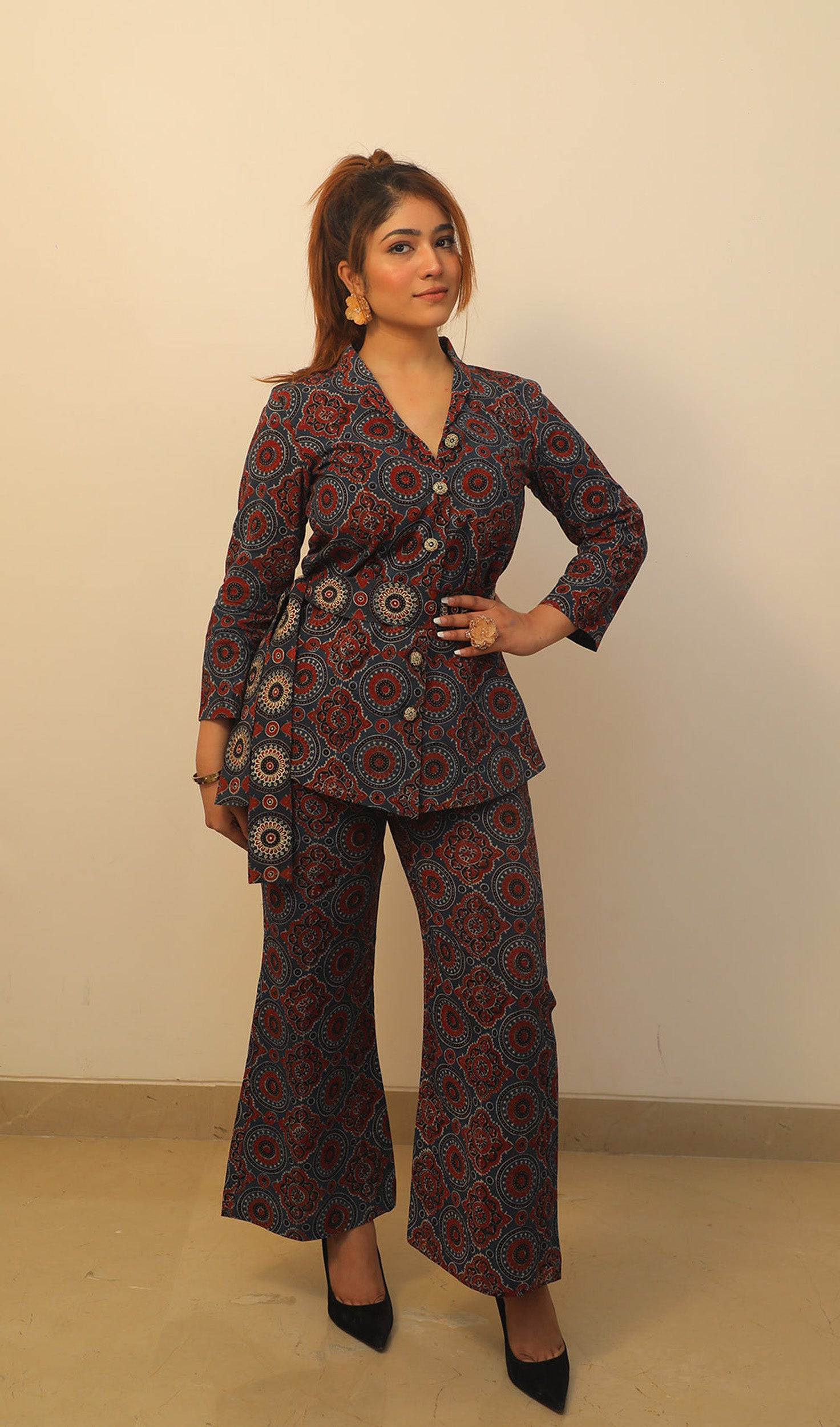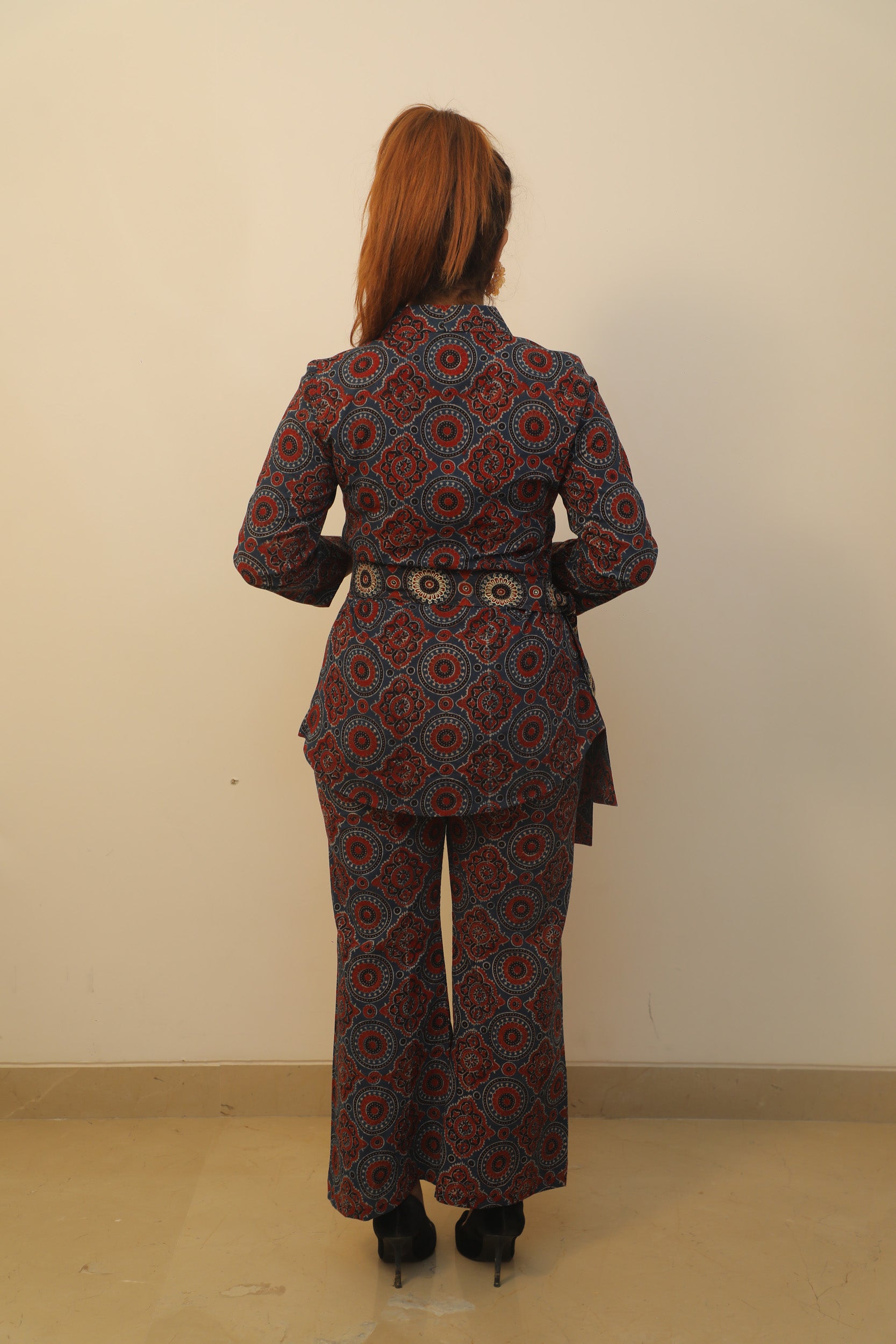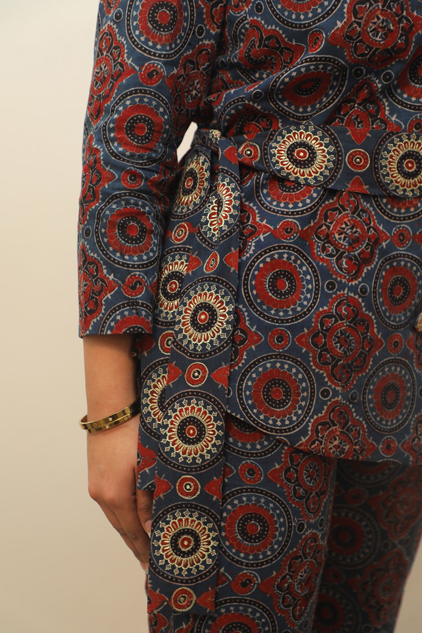 This Blue Ajrakh Cordset features a traditional hand-block printed fabric paired with a zari-embellished belt that adds a refined touch. The ensemble includes a shawl collar top, offering a sophisticated silhouette, complemented by bell-bottom pants that provide both comfort and style. Perfect for those seeking a blend of heritage craftsmanship and contemporary design.
