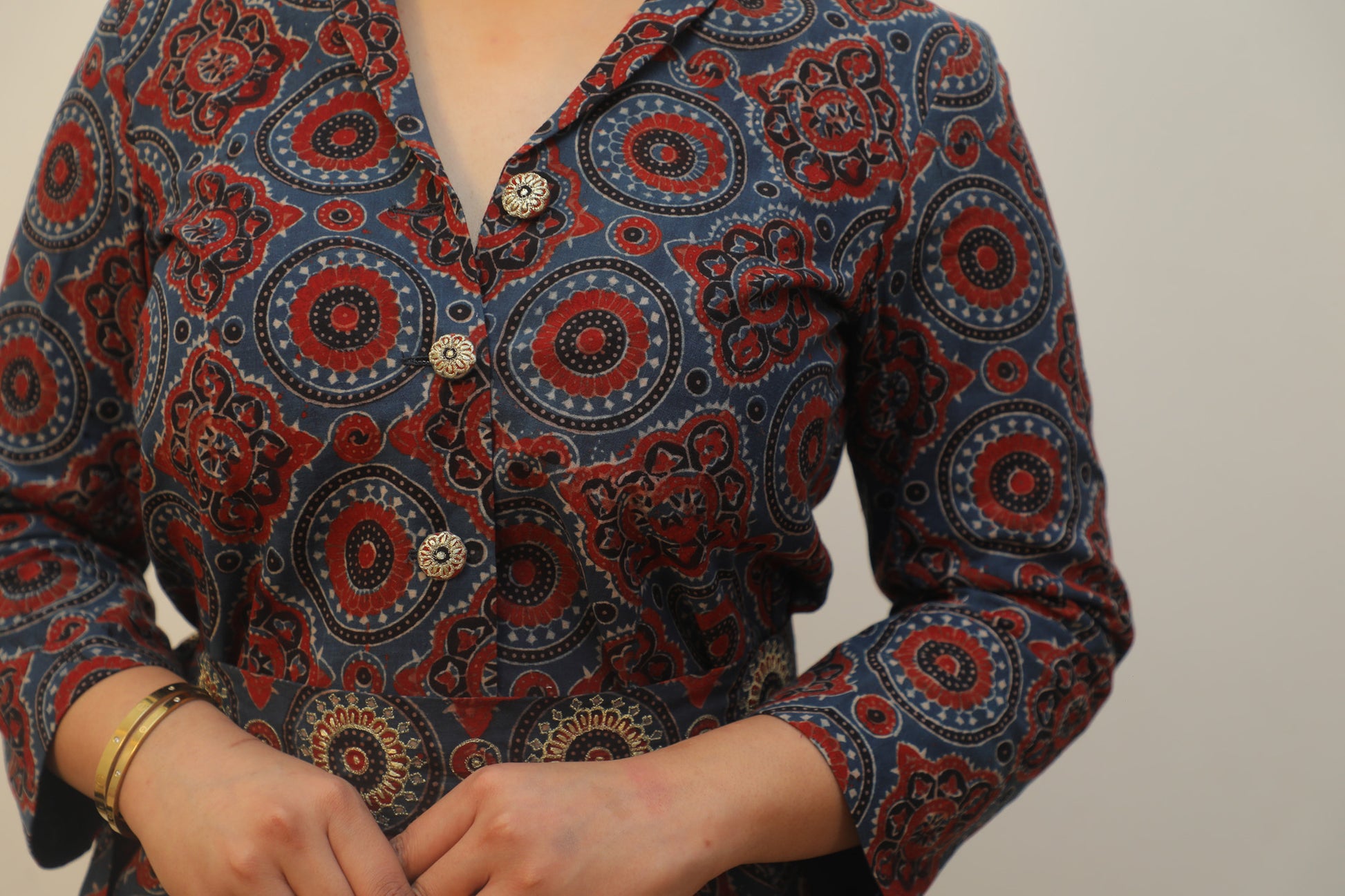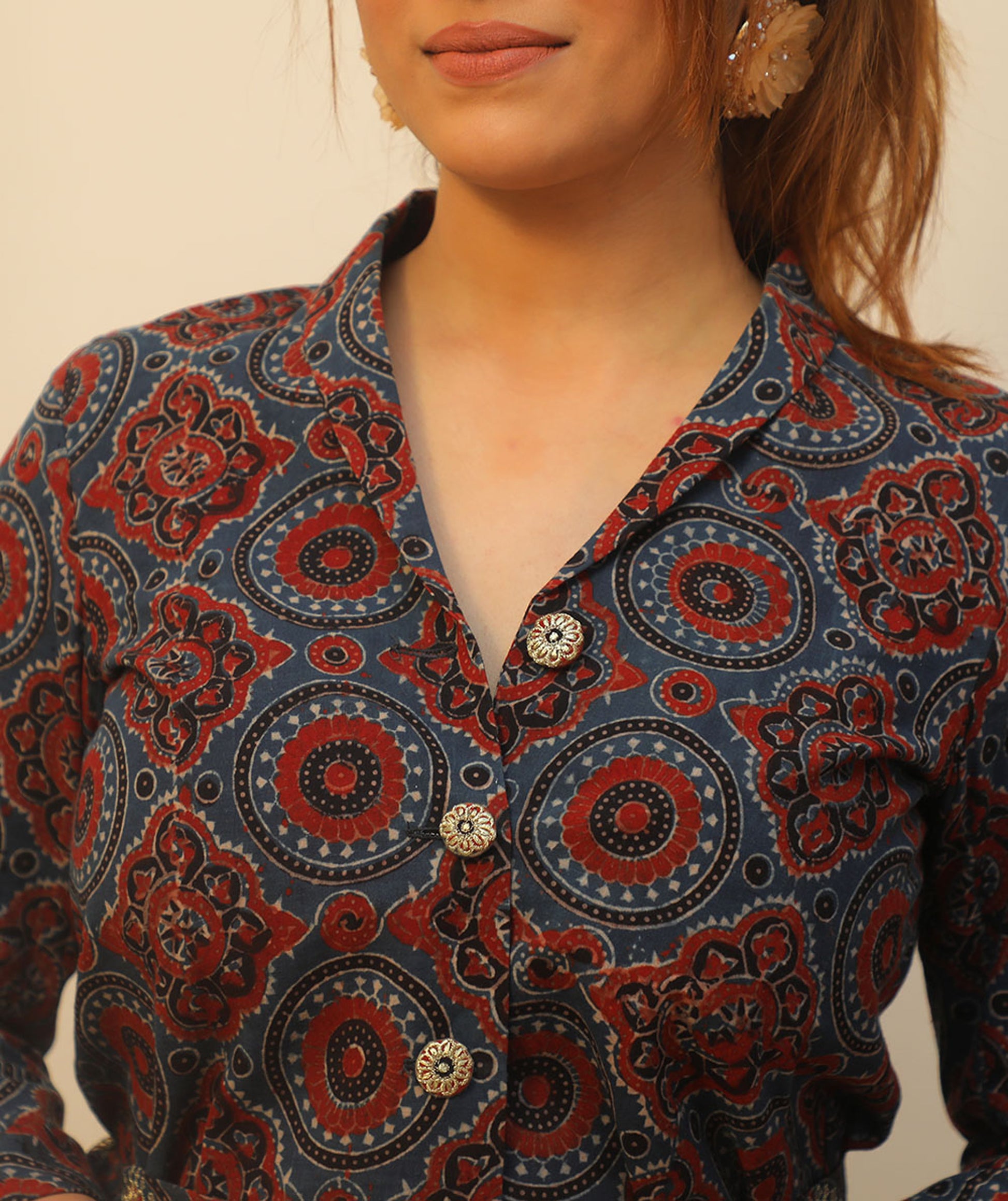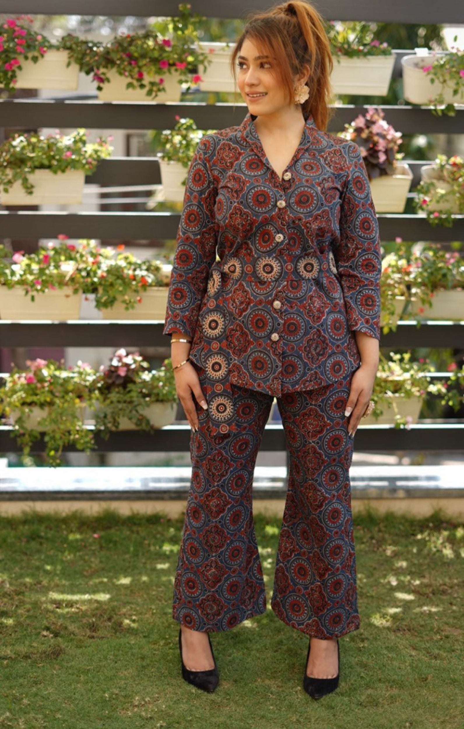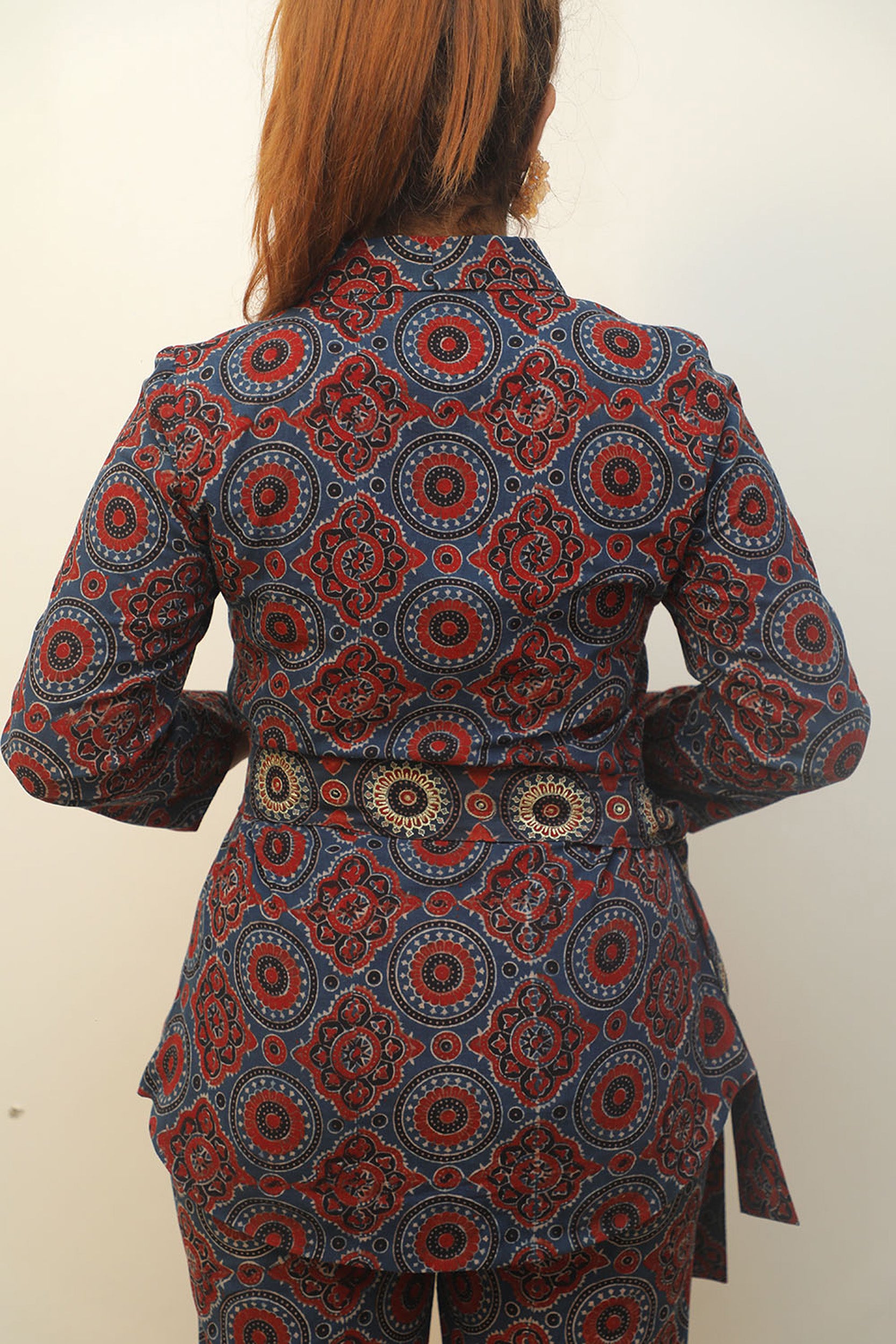 This Blue Ajrakh Cordset features a traditional hand-block printed fabric paired with a zari-embellished belt that adds a refined touch. The ensemble includes a shawl collar top, offering a sophisticated silhouette, complemented by bell-bottom pants that provide both comfort and style. Perfect for those seeking a blend of heritage craftsmanship and contemporary design.