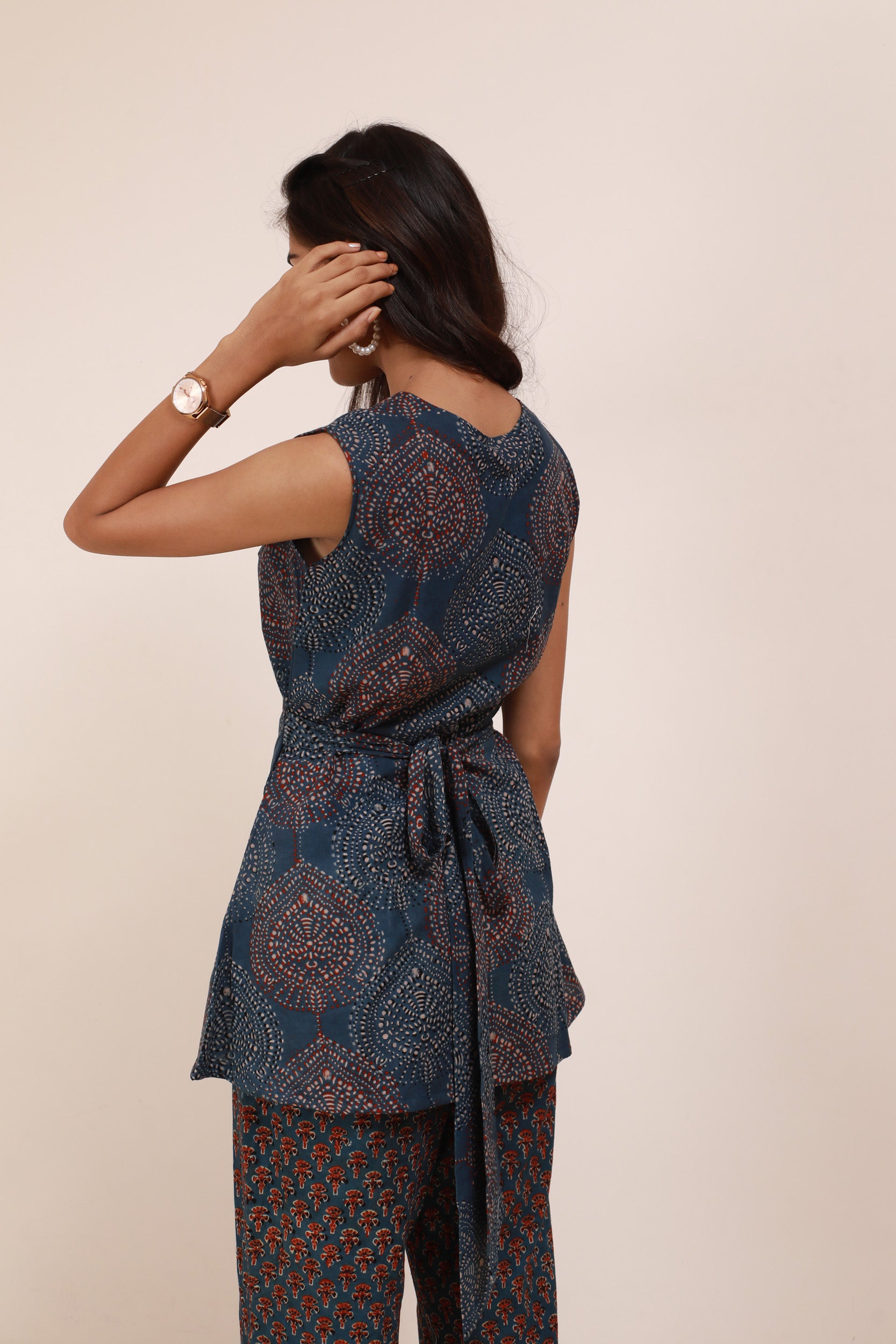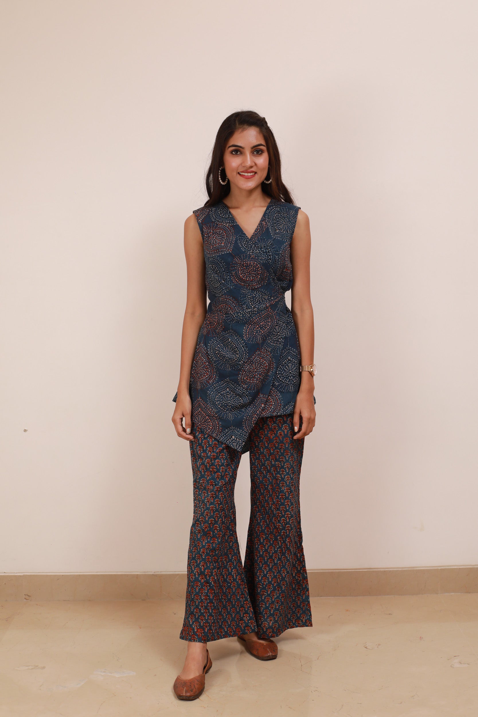 This Blue Ajrakh Drape Cordset features a pure Ajrakh print in a striking blue base with subtle maroon accents. The set includes a V-neck top with elegant side and back ties, paired with stylish bell-bottom pants. Crafted to blend traditional craftsmanship with contemporary design, it offers both comfort and a distinctive look perfect for sophisticated, casual wear.