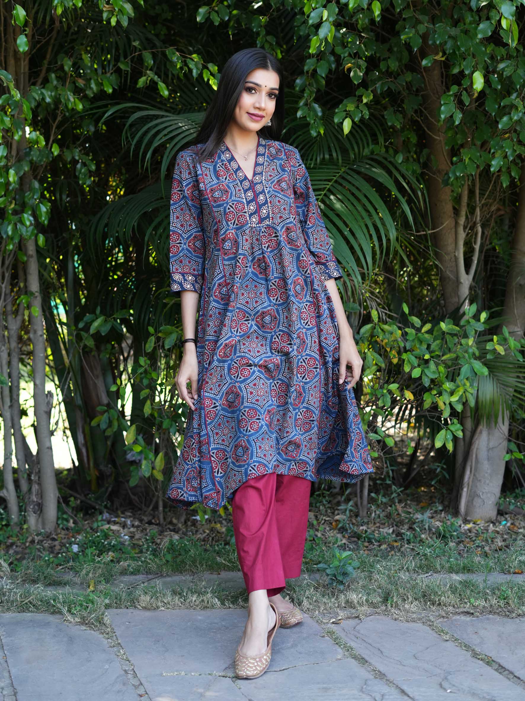 Crafted in pure cotton the kurta is beautifully printed in ajrakh block. The neck and sleeves is highlighted with sequence.