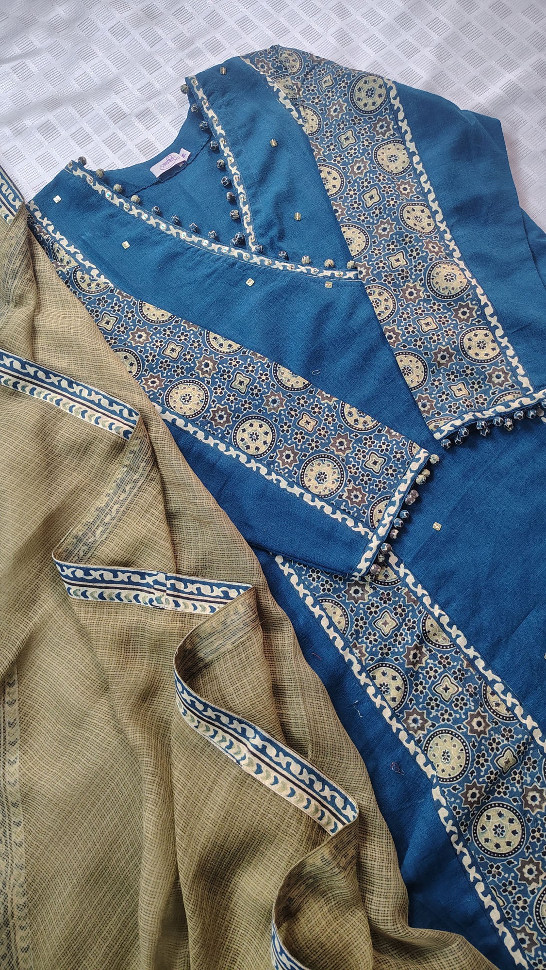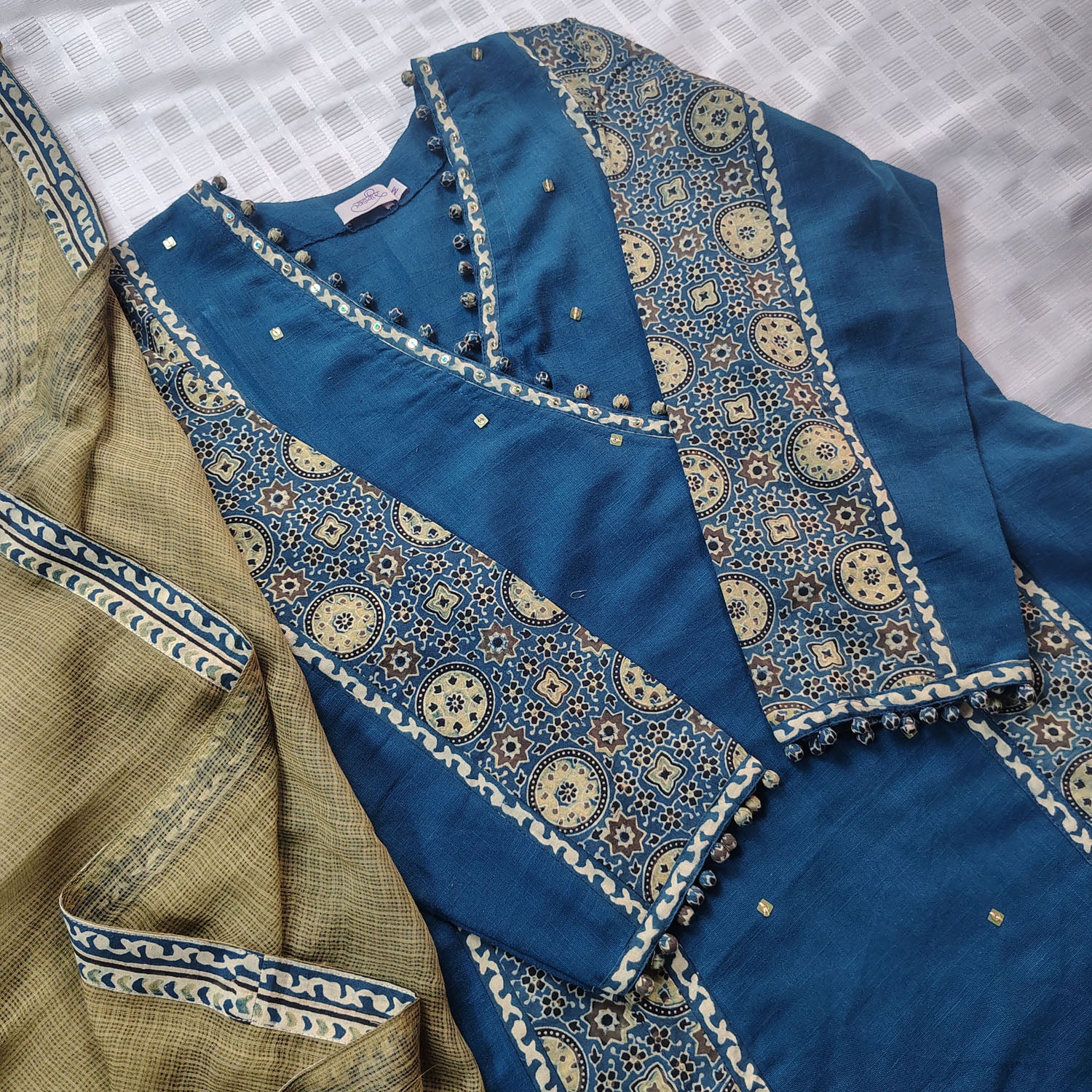 Blue Ajrakh Patch Work Cotton Kurta Suitset