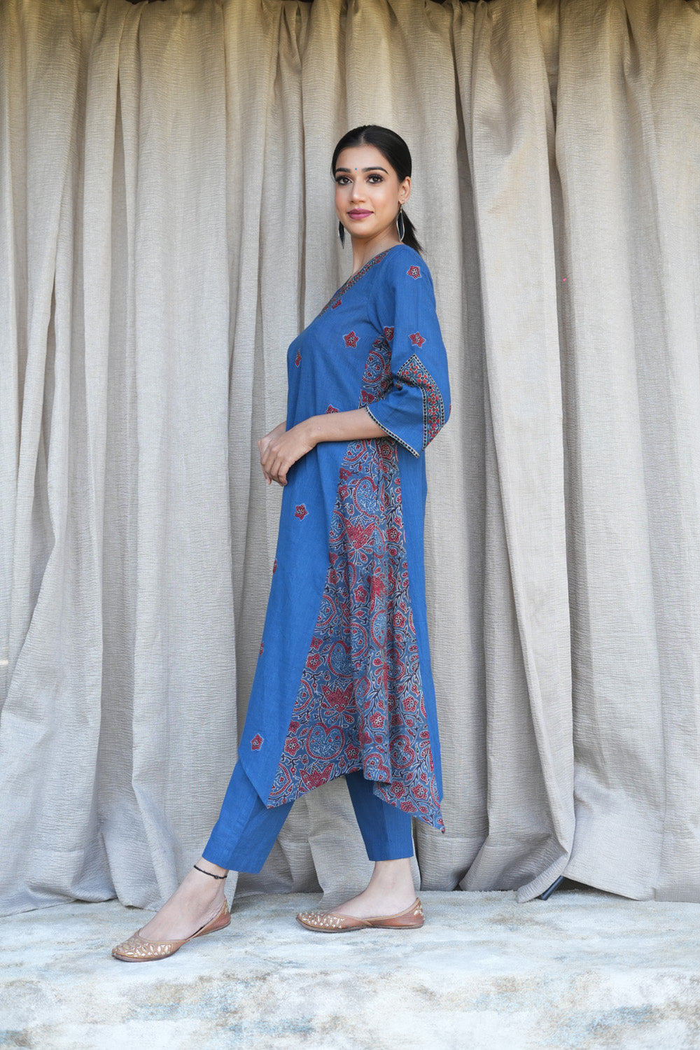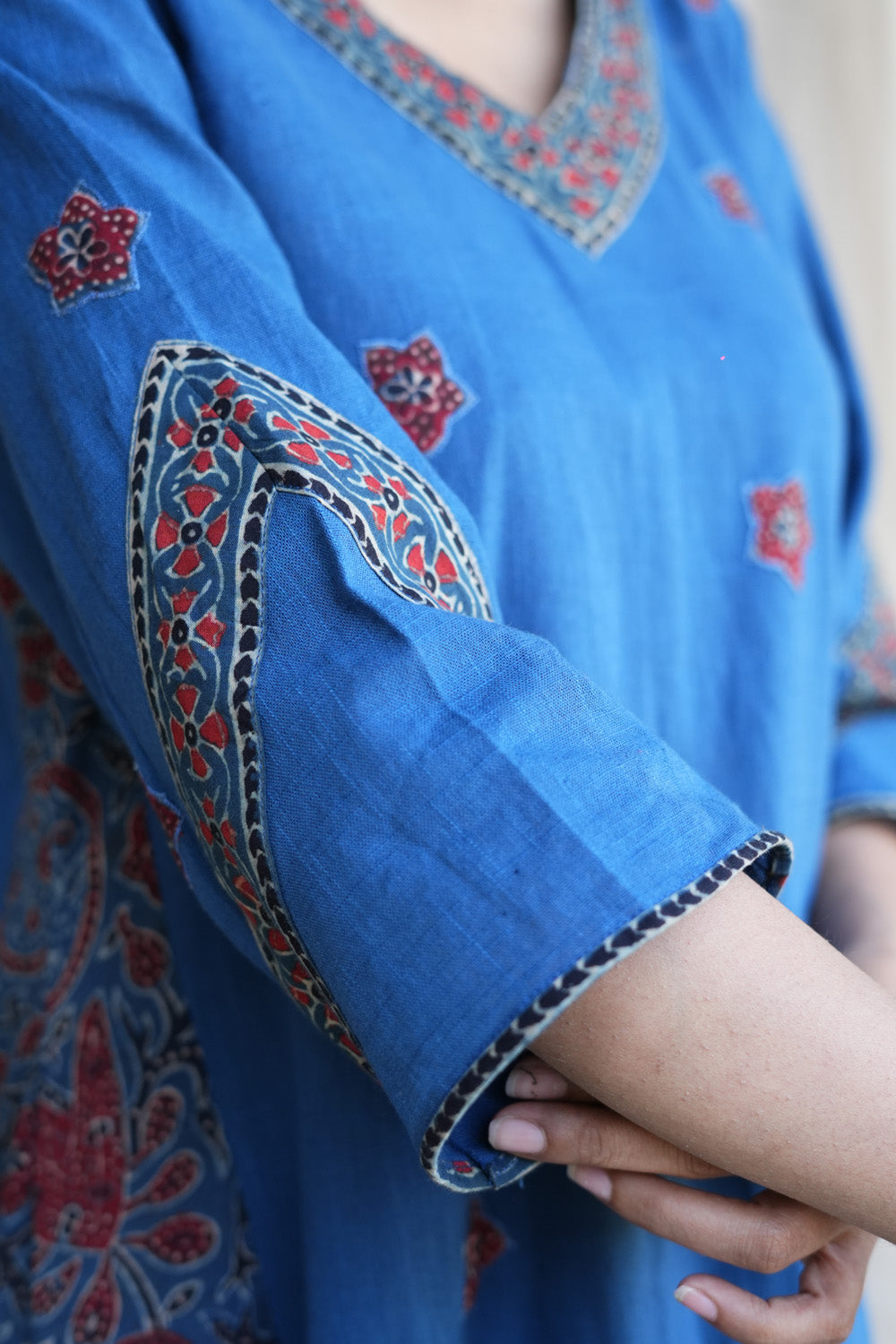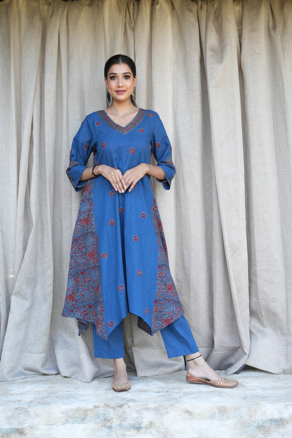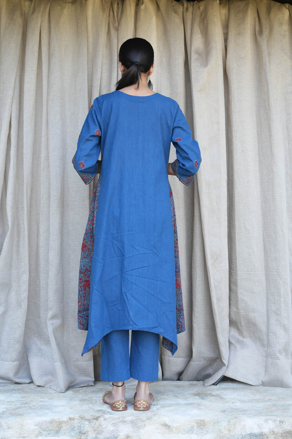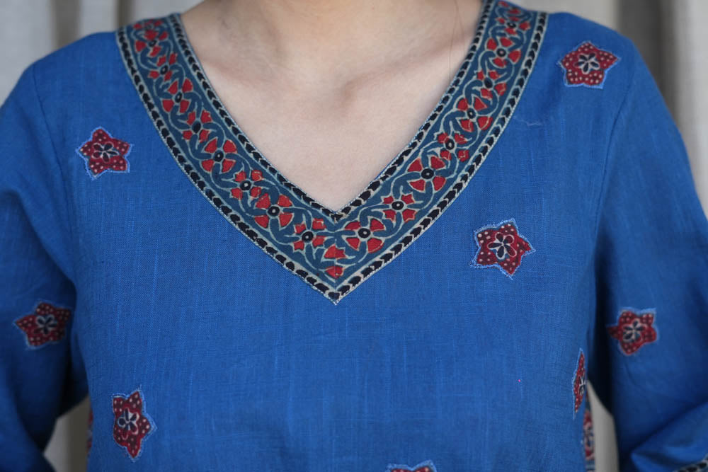 Look phenomenal in this beautiful Blue cotton slub V neck kurta which has ajrakh patched embroidered flower in front with ajrakh kali.