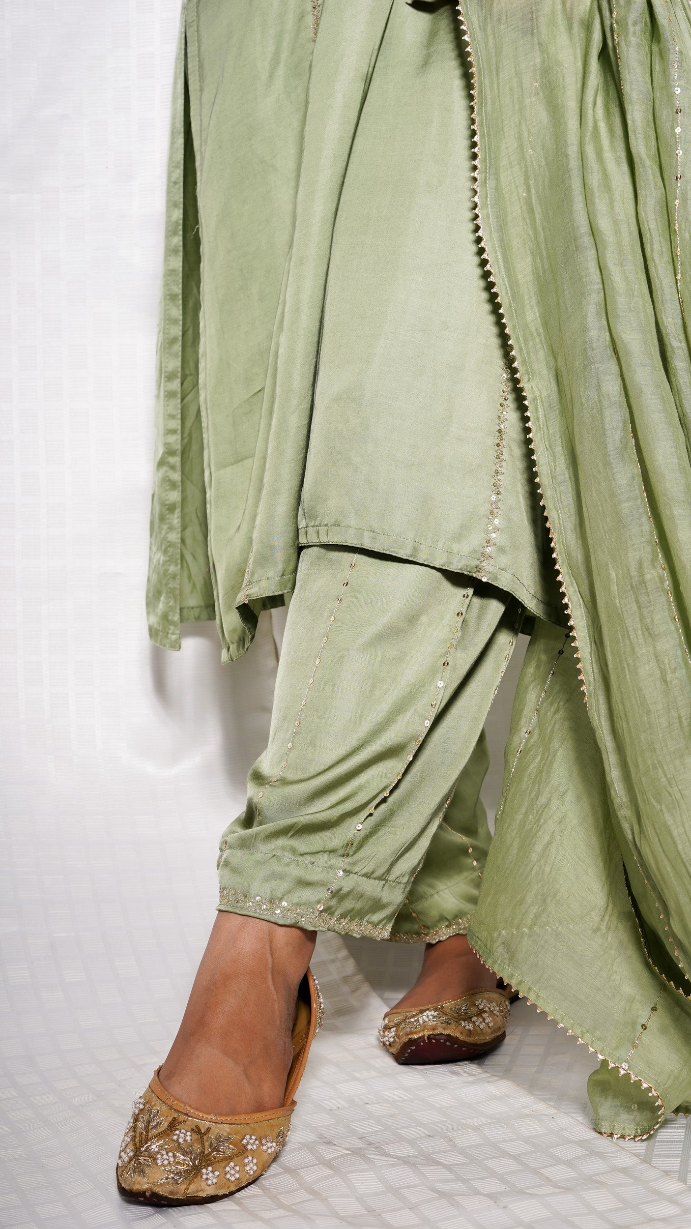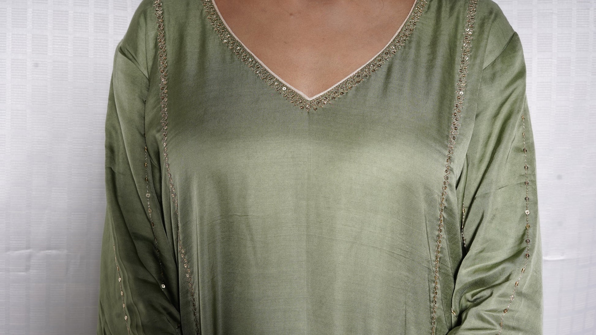 Crafted in pure chanderi silk the kurta front and sleeves is embroidered with zari and sequence.