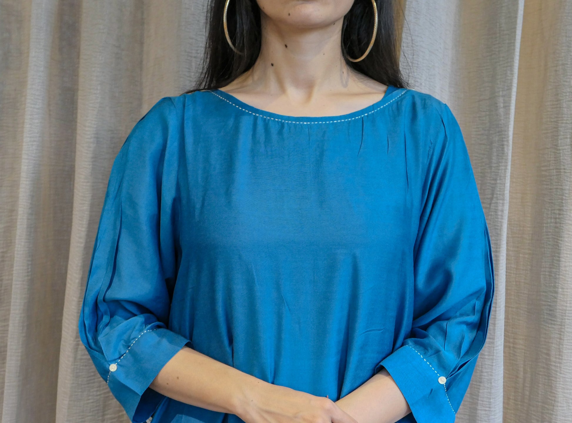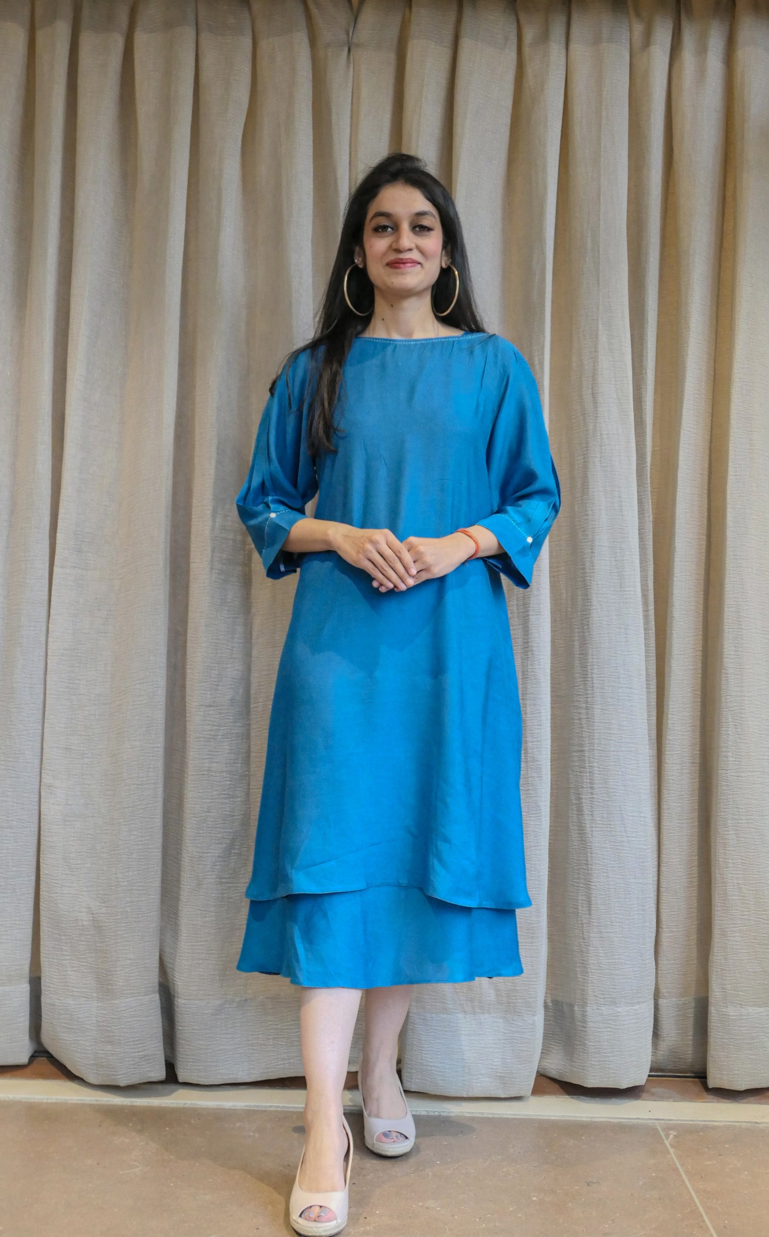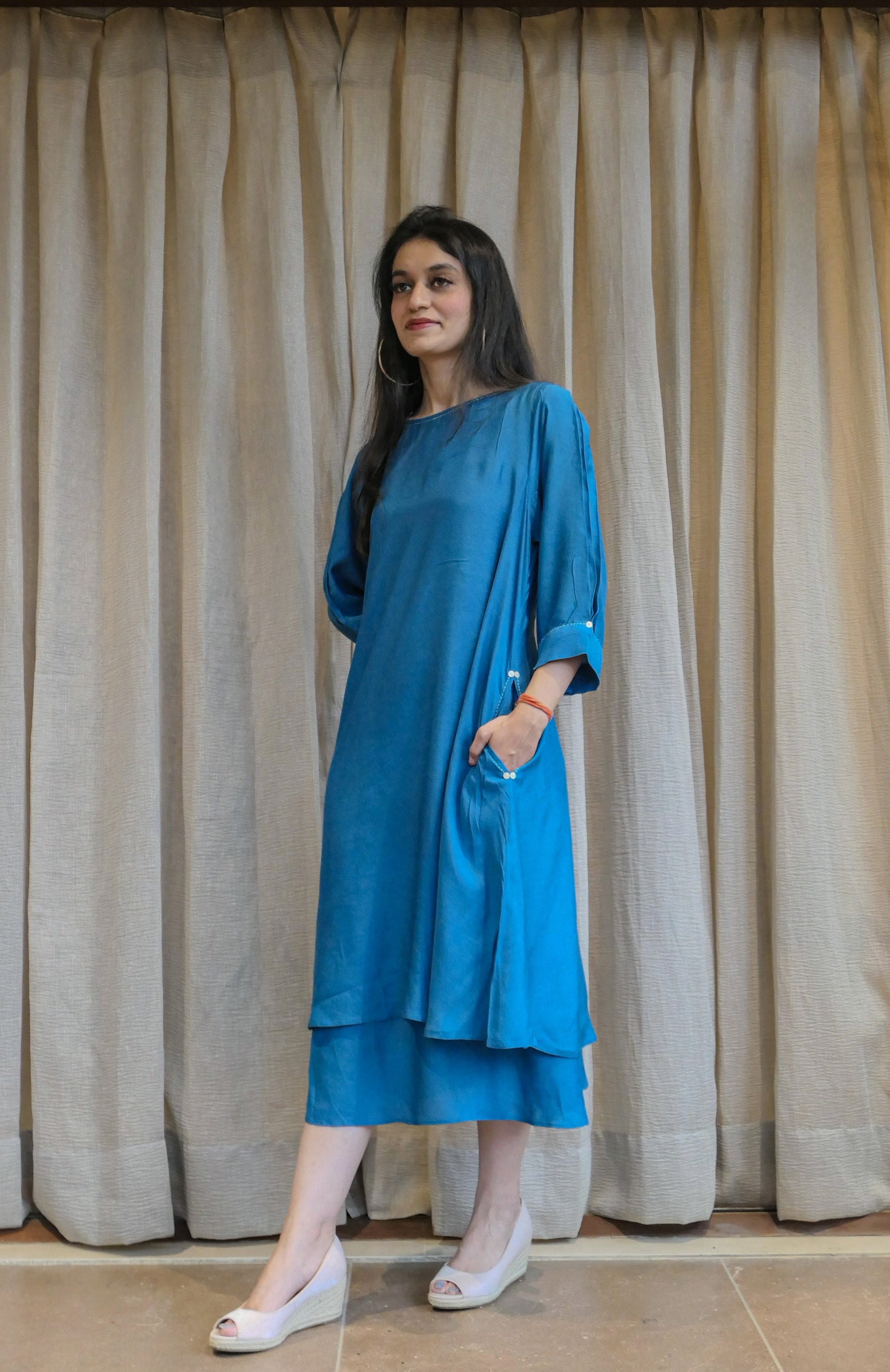 Crafted from breathable cotton slub fabric, this blue dress features a comfortable slip and a stylish boat neckline. With a 45-inch length, it offers a flattering fit that is perfect for summer wear. The cool blue shade adds a fresh and breezy feel, making it an ideal choice for warm, sunny days.