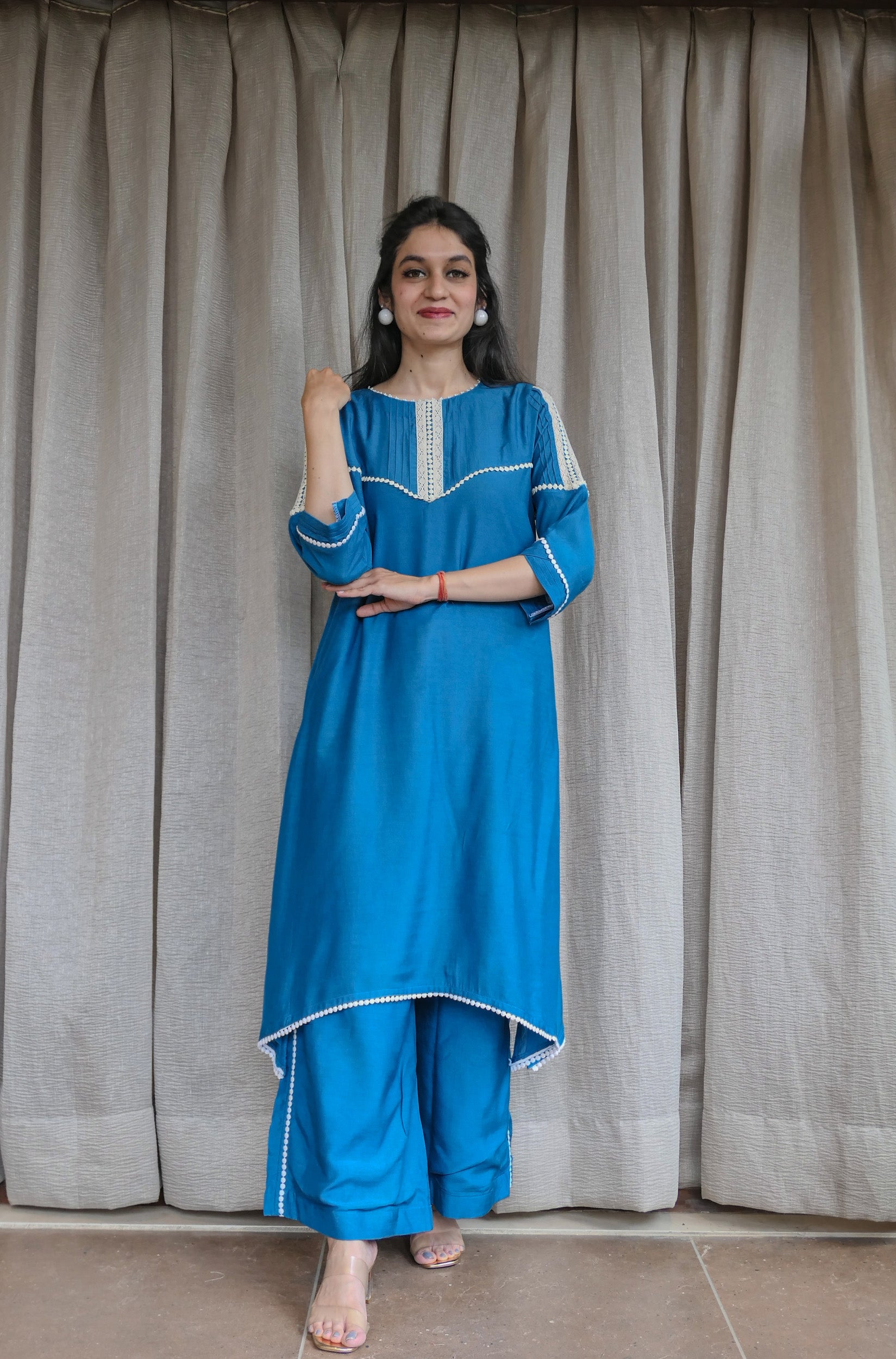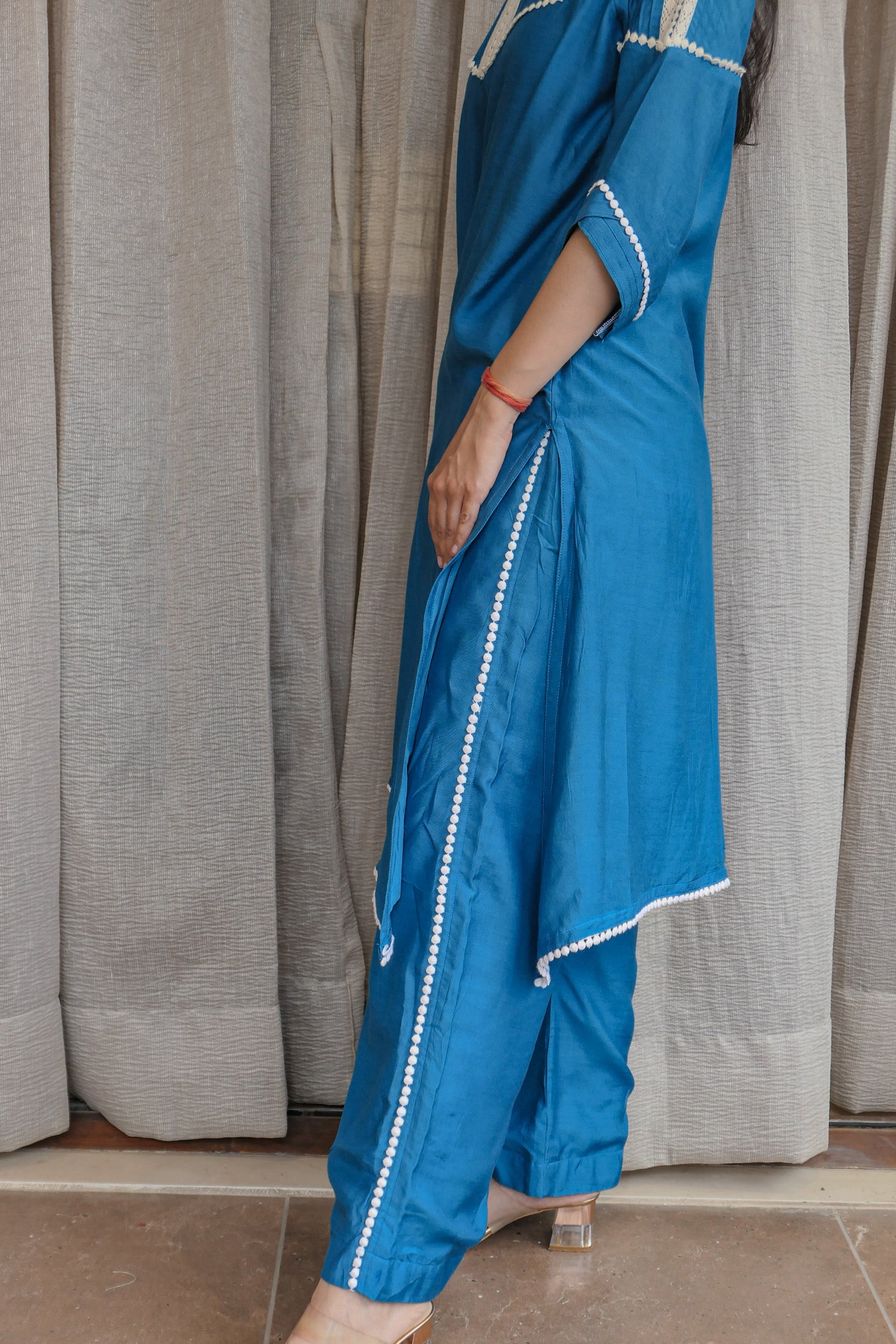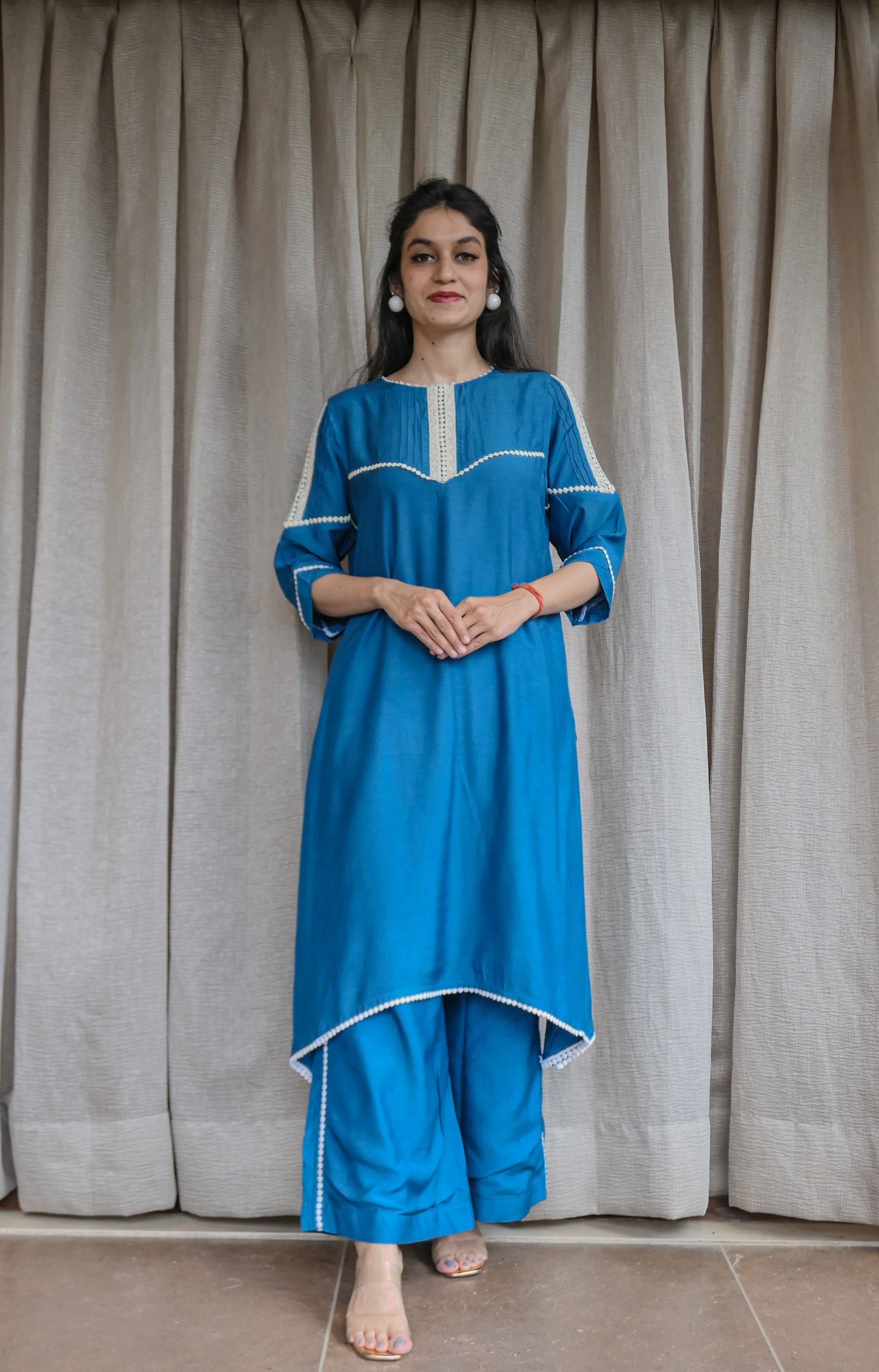 This blue cotton slub co-Ord set features delicate white lace embellishments, combining comfort and style for summer wear. Designed with a boat neck and three-quarter sleeves, it offers a relaxed yet refined silhouette perfect for warm weather. The breathable cotton fabric ensures ease and durability, making it an ideal choice for effortless, elegant casual dressing.