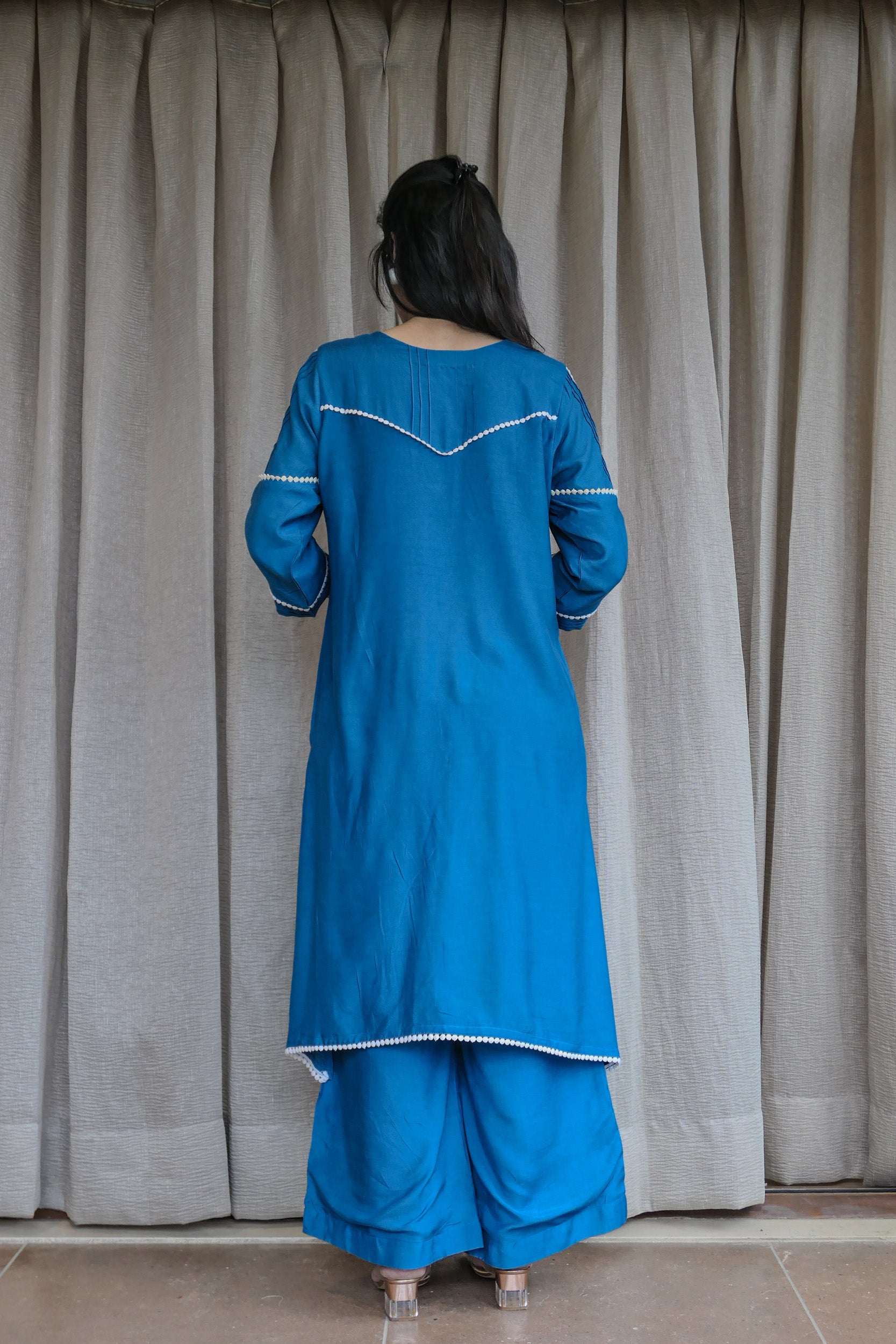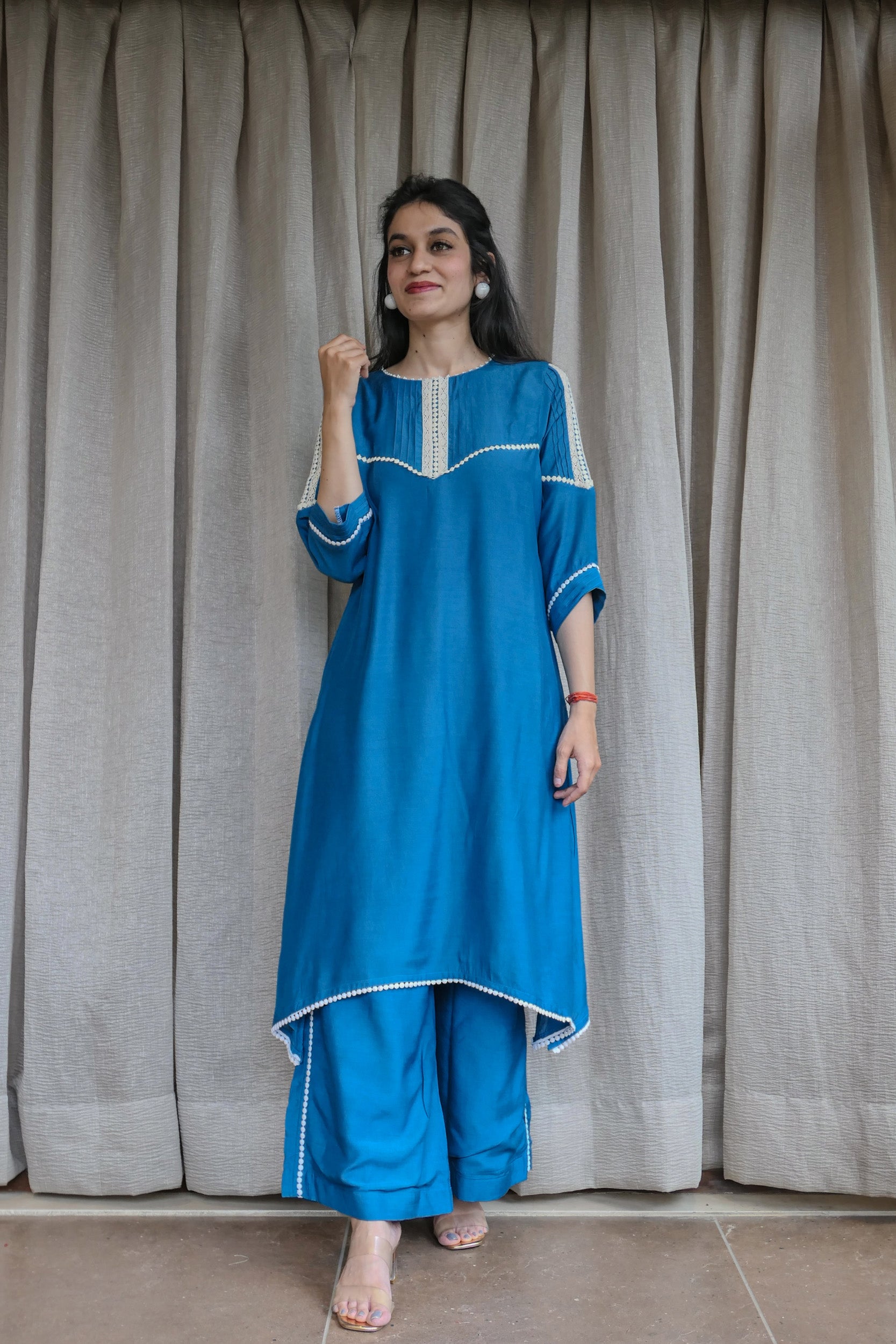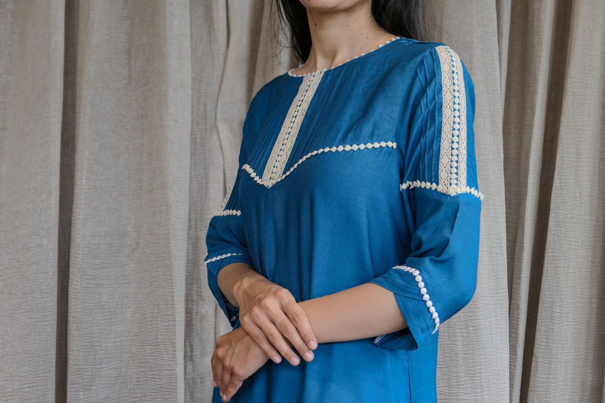 This blue cotton slub co-Ord set features delicate white lace embellishments, combining comfort and style for summer wear. Designed with a boat neck and three-quarter sleeves, it offers a relaxed yet refined silhouette perfect for warm weather. The breathable cotton fabric ensures ease and durability, making it an ideal choice for effortless, elegant casual dressing.