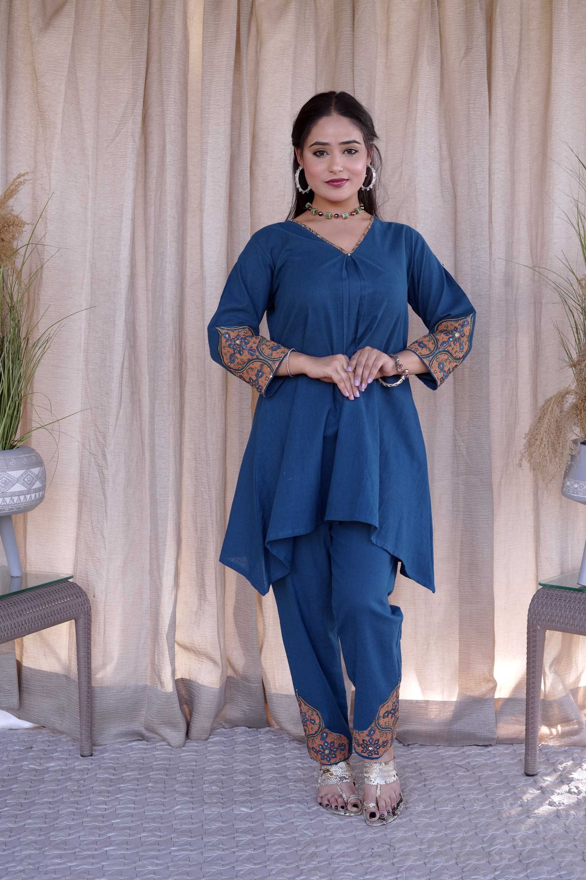 Blue Cotton Slub Ajrakh Patched Co-ord Set