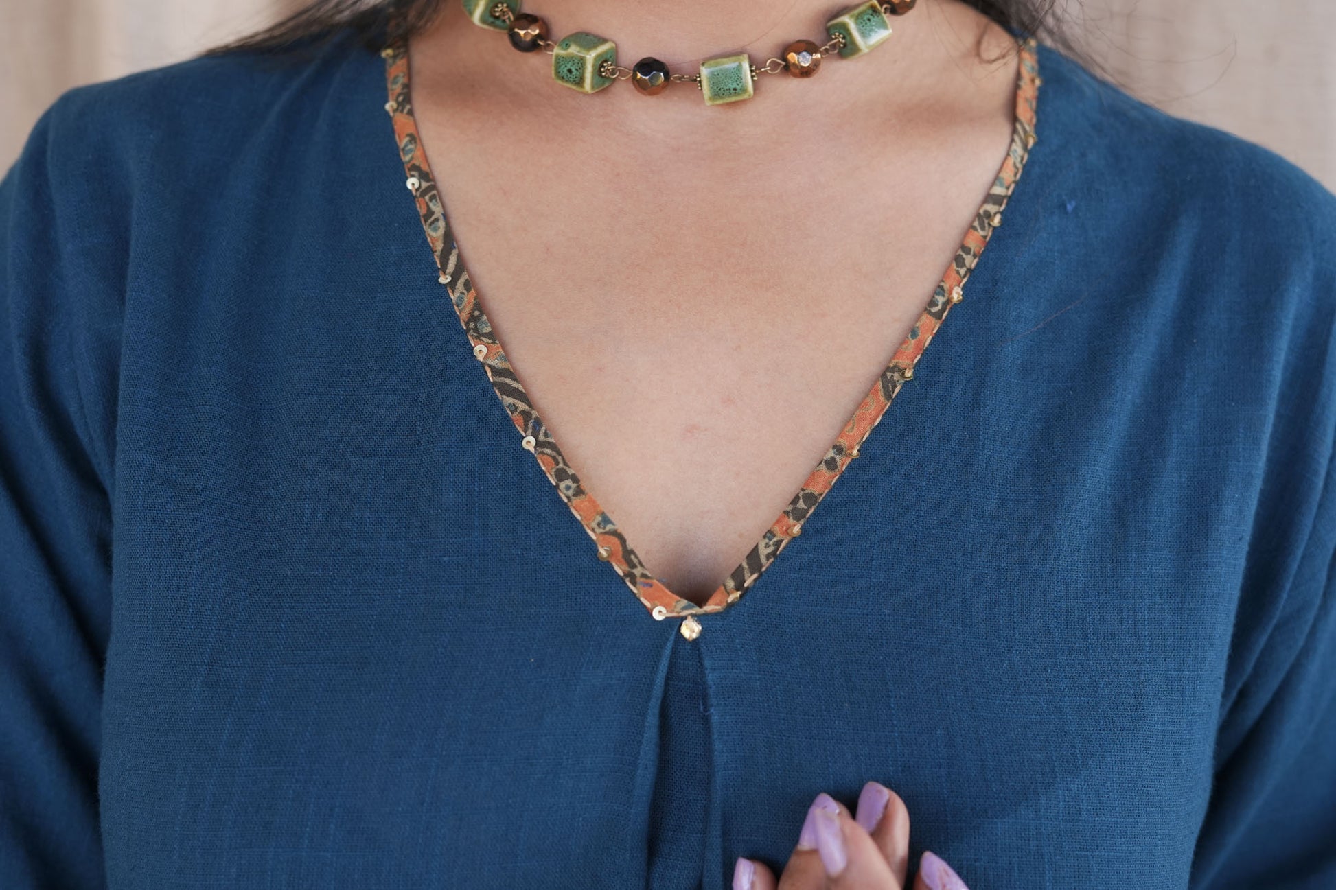 It comes with a cotton slub pant which has applique Ajarkh .