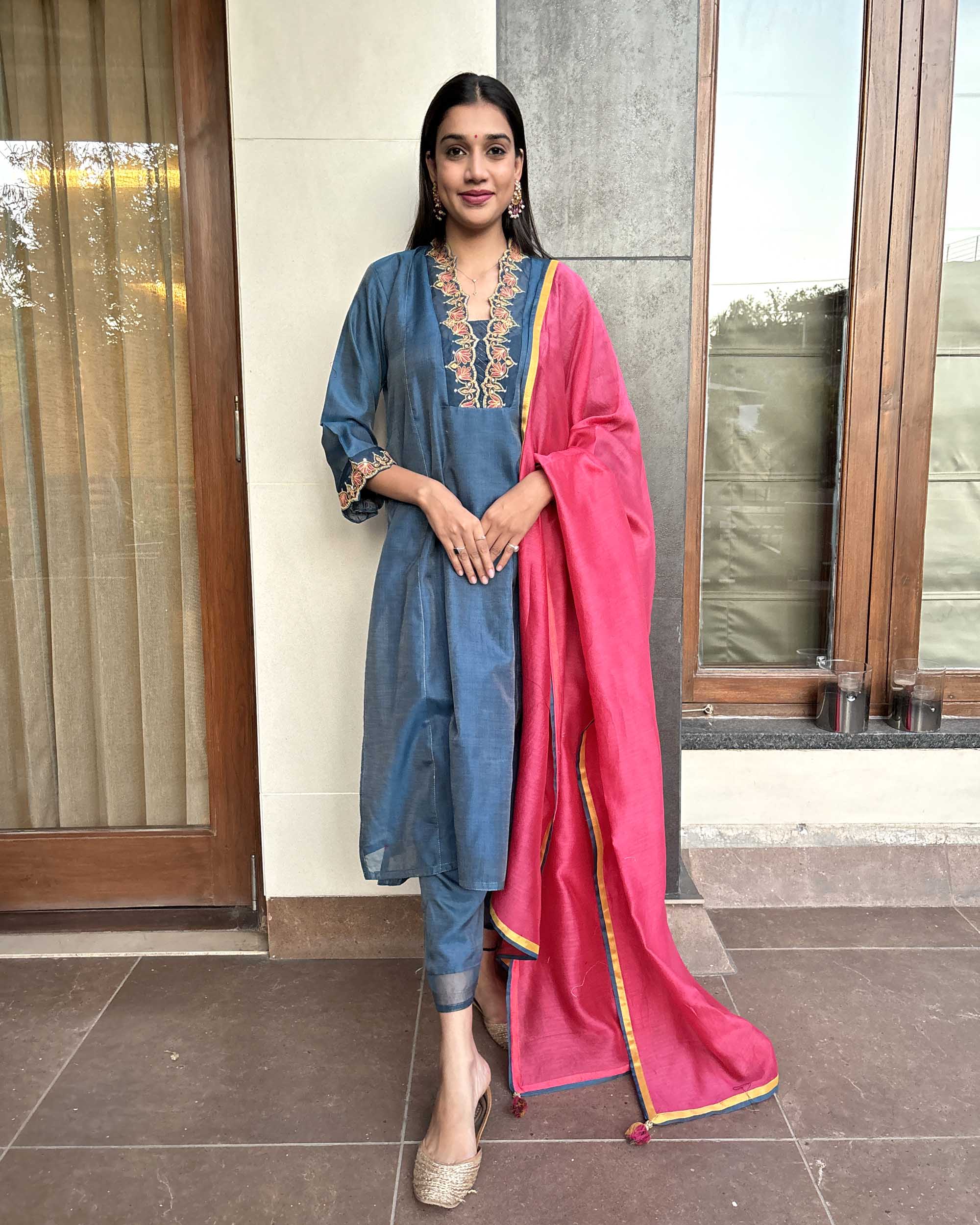 Pair is with blue chanderi pant and pink dupatta for the complete look.