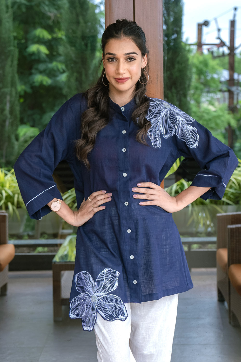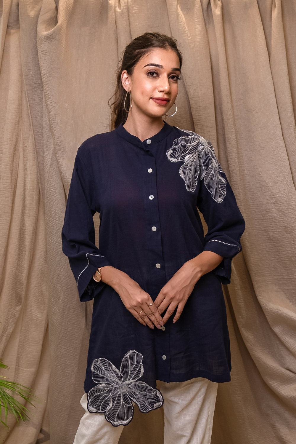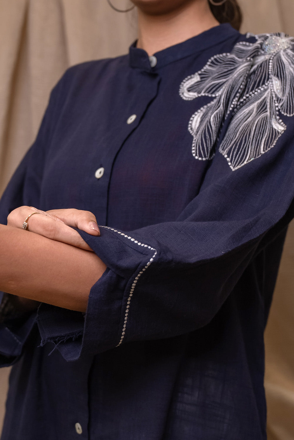 Introducing our blue cotton linen shirts which are beautifully floral embroidered with silk threads and embellished with beads.