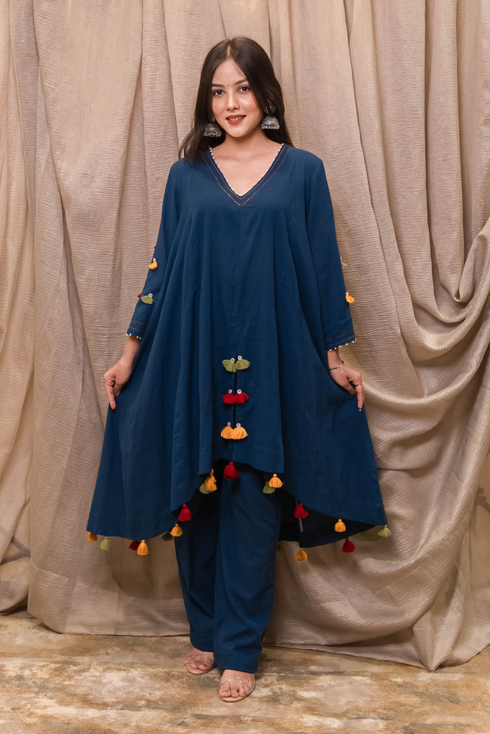 Handcrafted in pure cotton slub,the cape front is embroidered with colorful threads and has tassels. It comes with a elasticated pant which give you comfort fit.