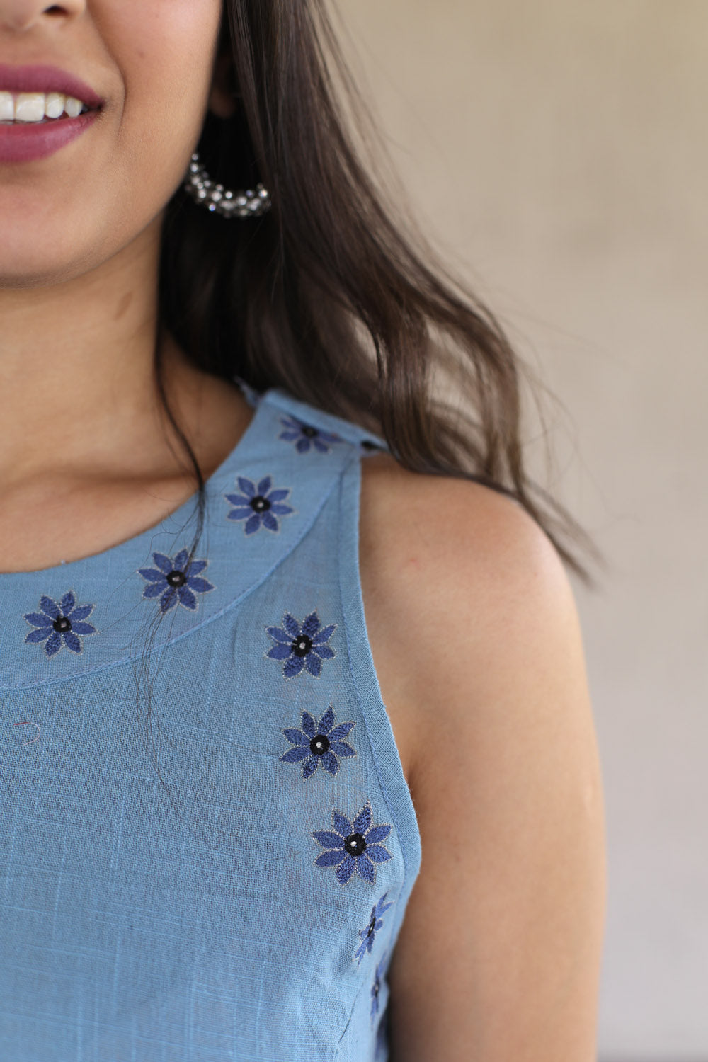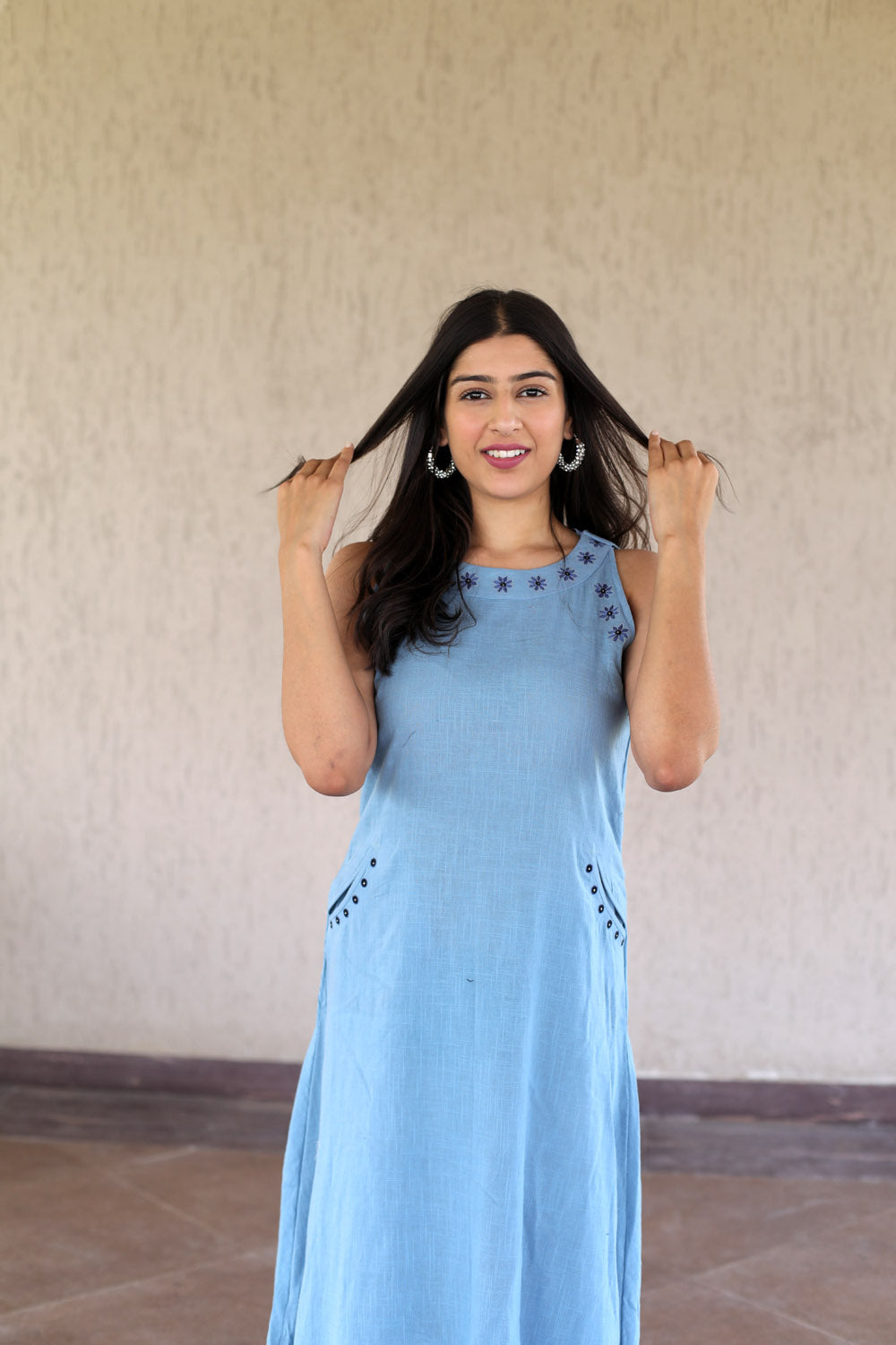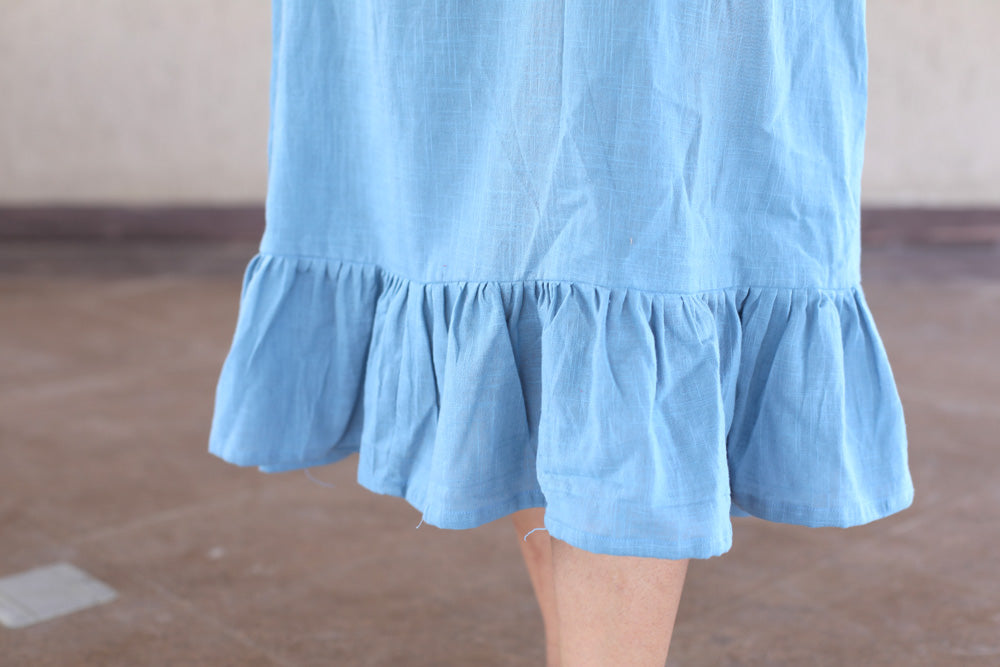 Blue Floral Embroidered Cotton Slub Dress