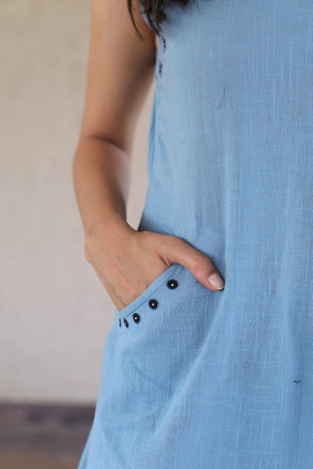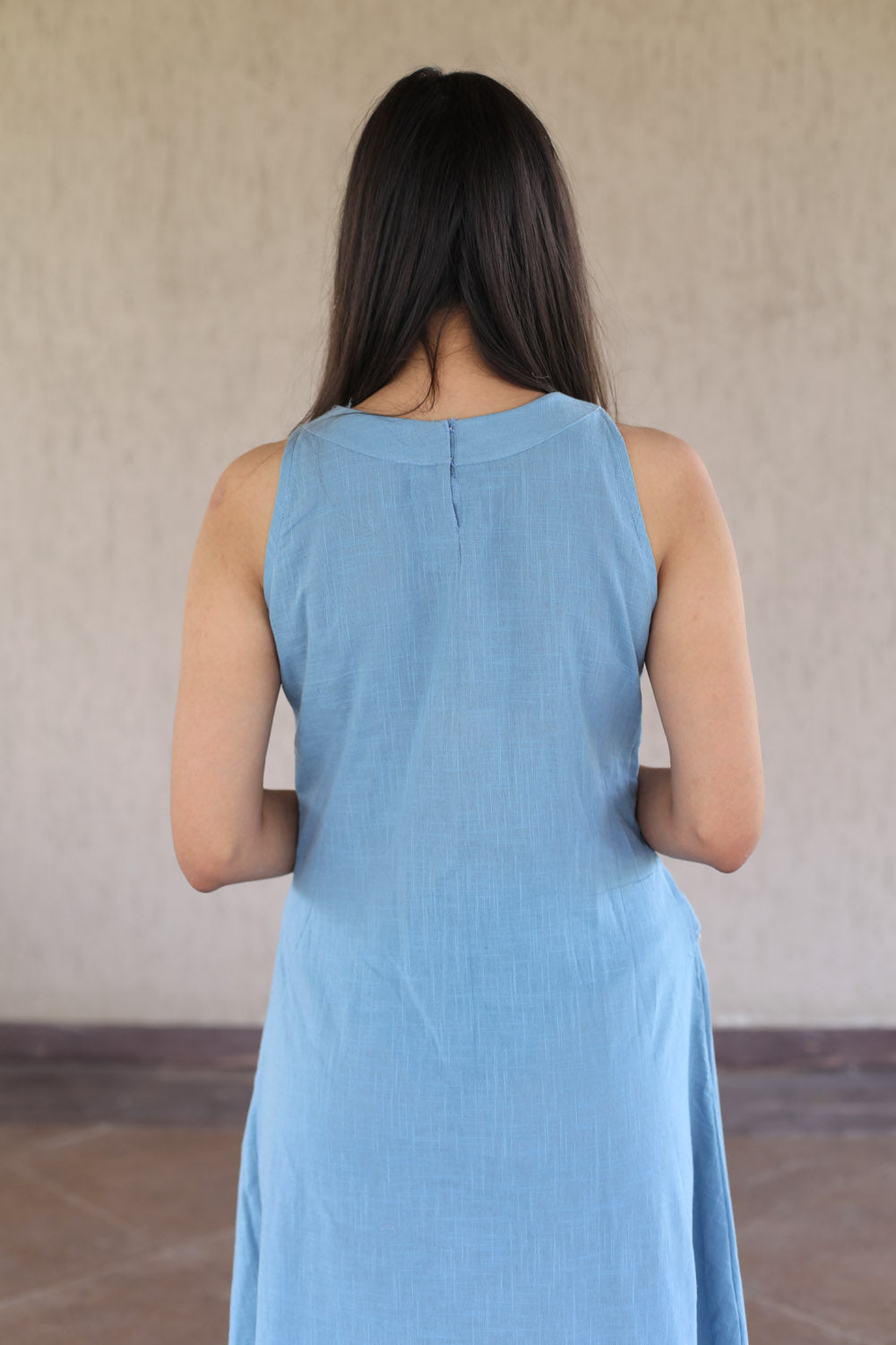 This summer get ready in this blue cotton slub halter neck dress. The neck and arm hole is embroidered with silk threads