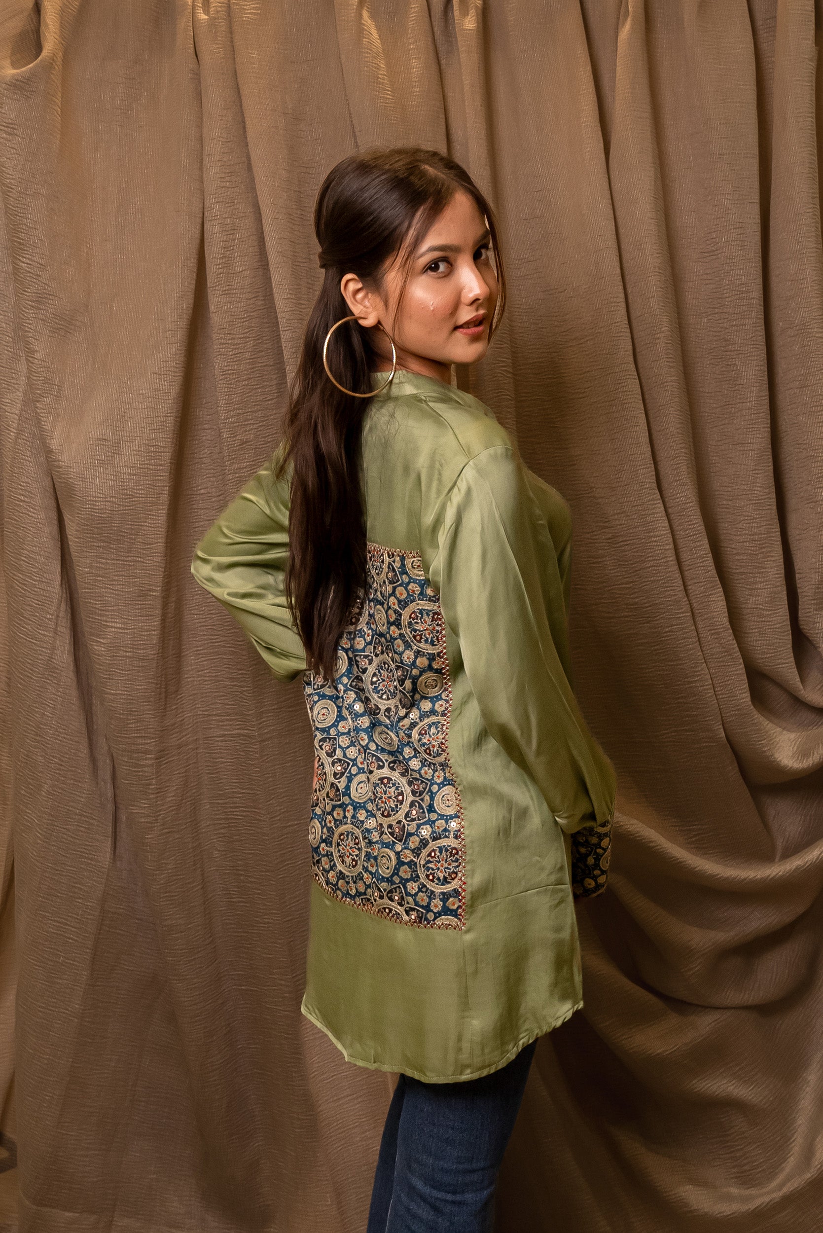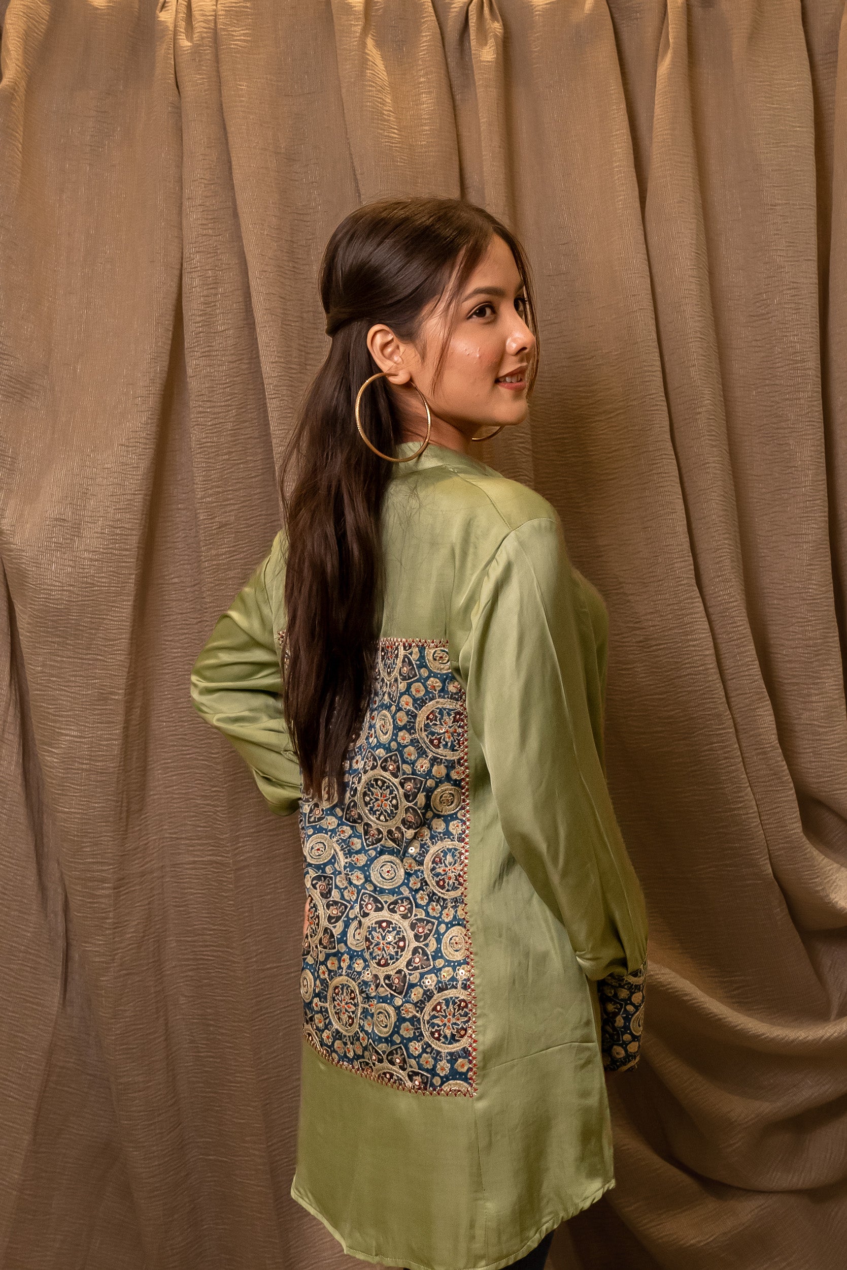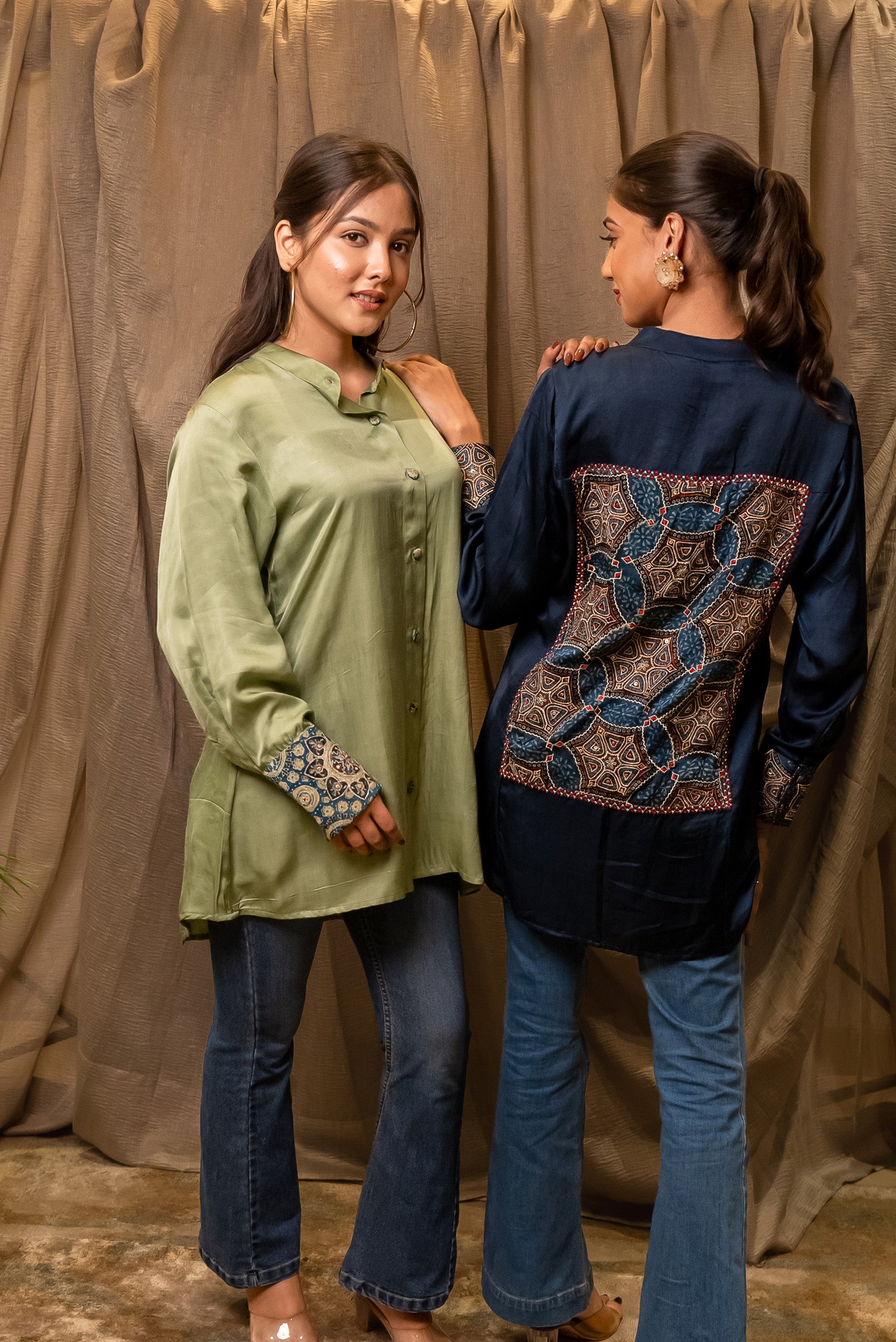 Crafted in pure modal silk the shirt has ajrakh patched at the back embroidered with golden zari thread and sequence.