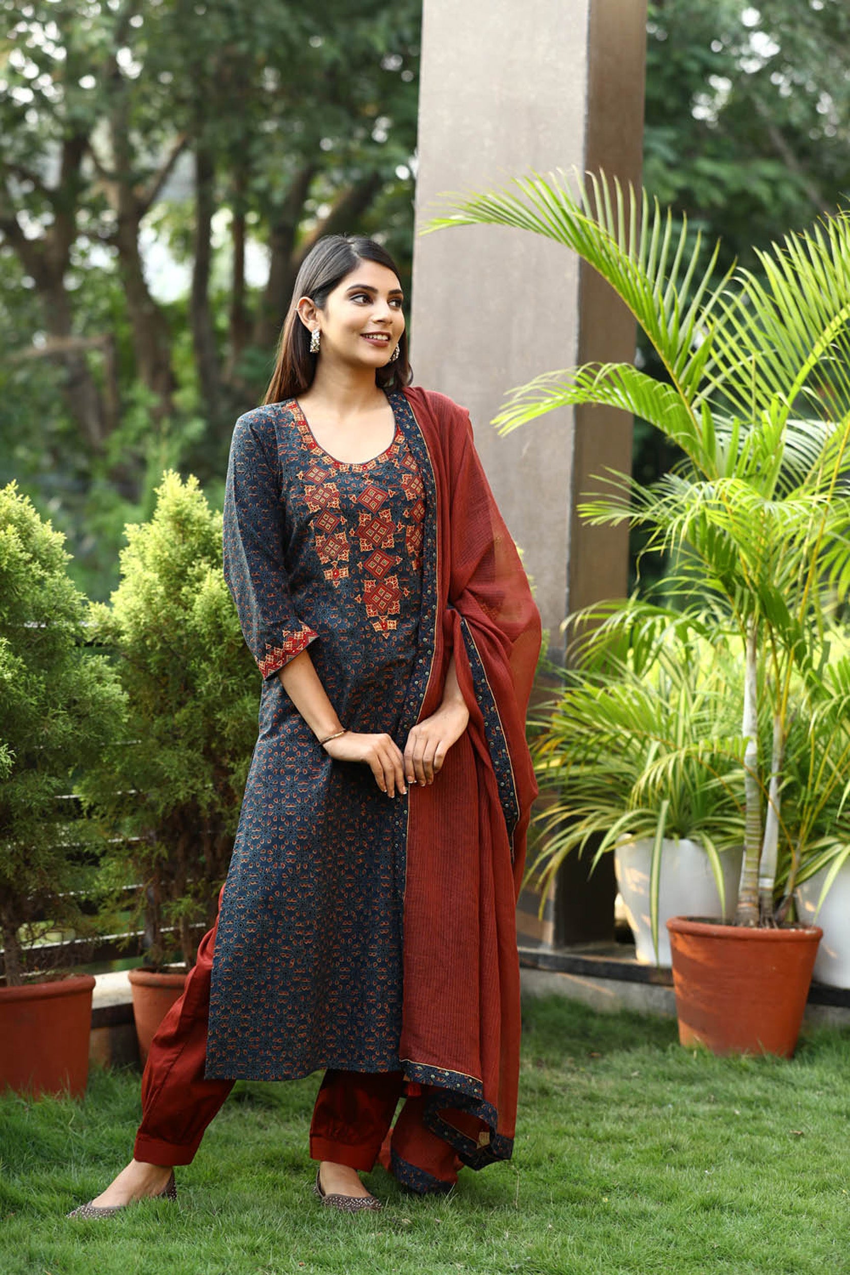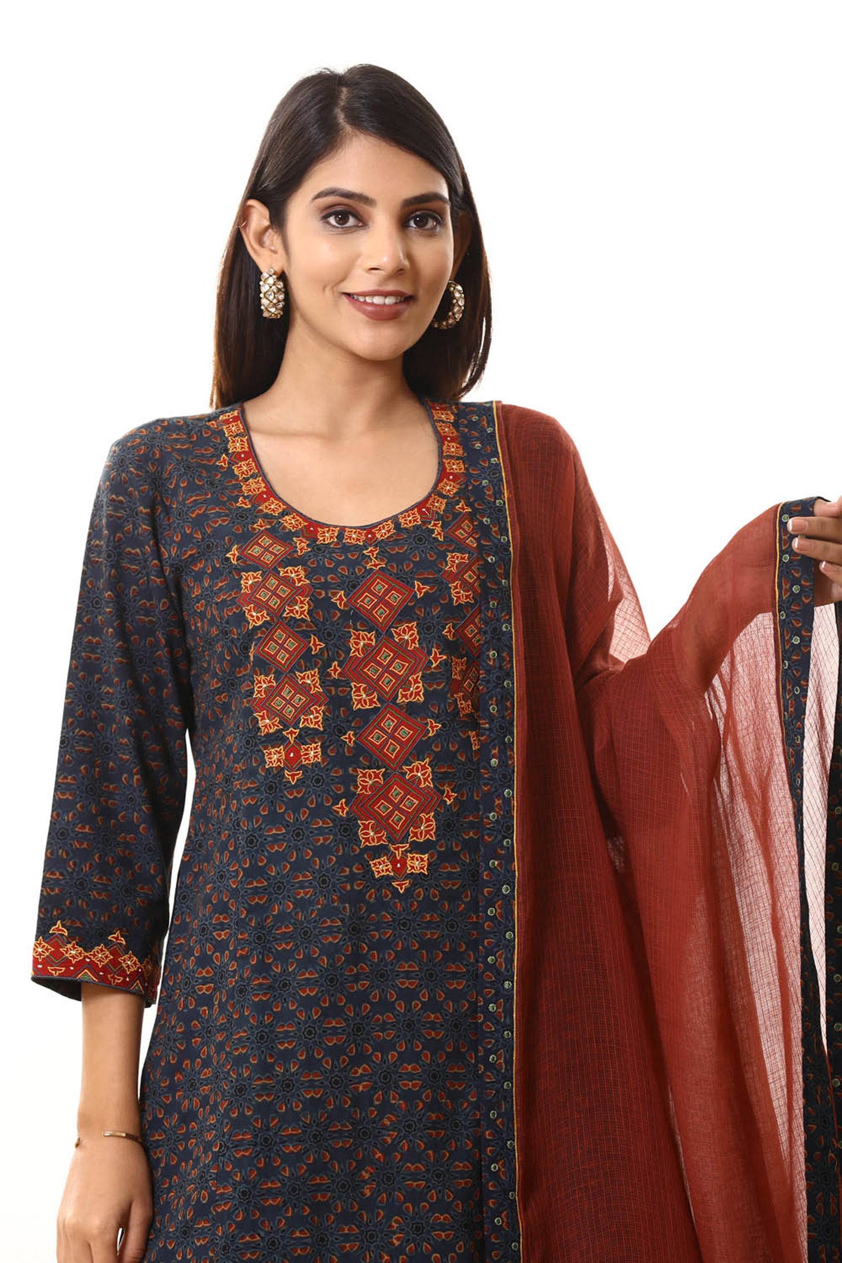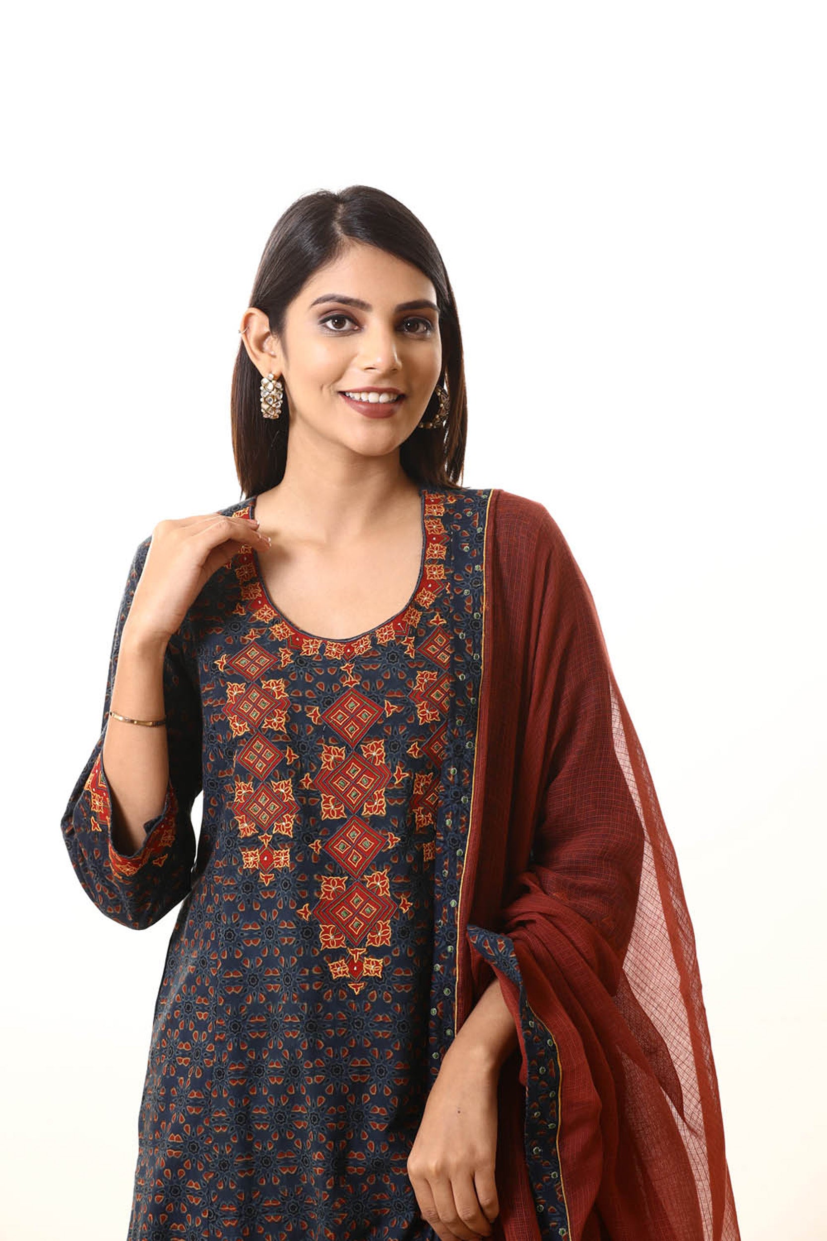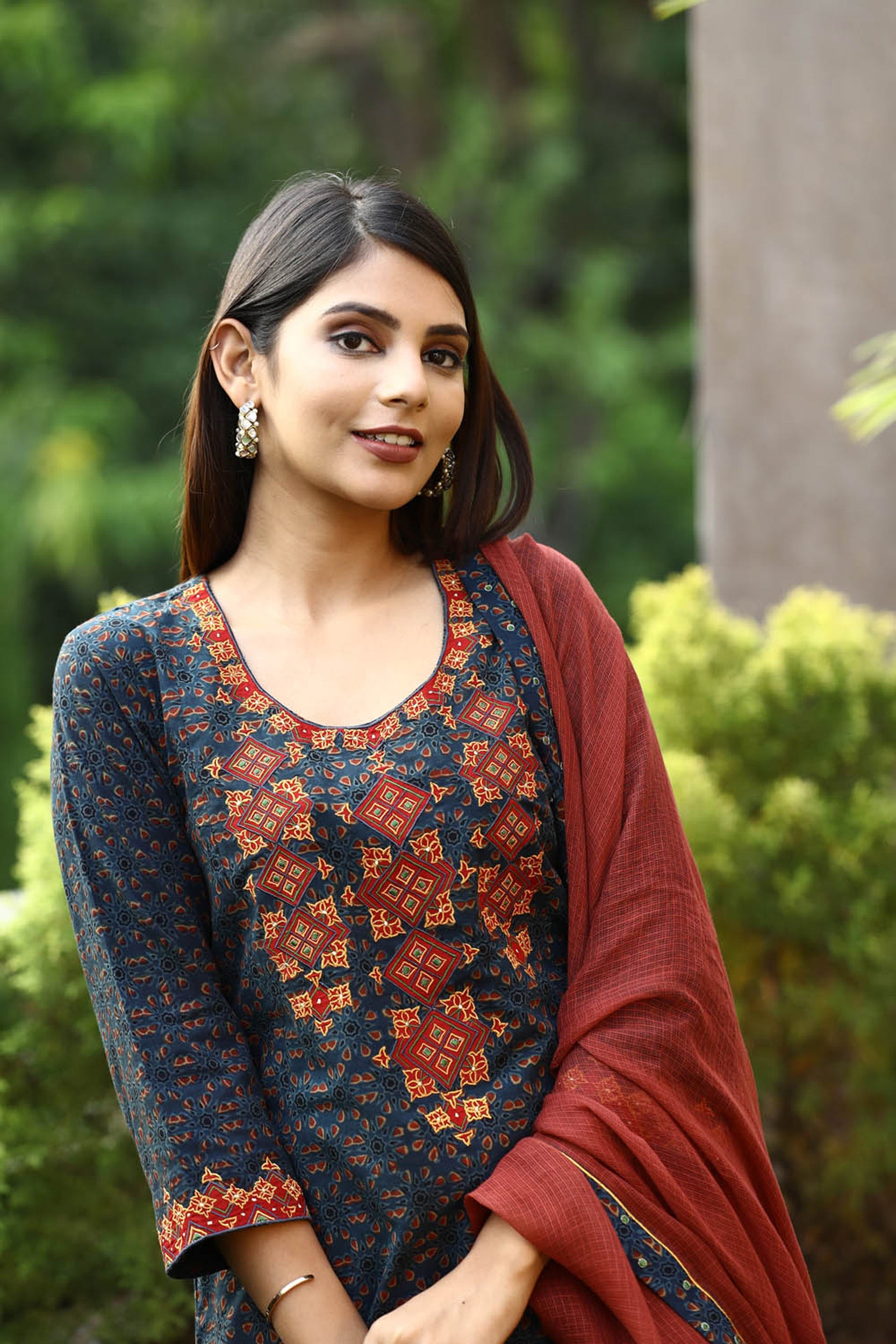 This exquisite Ajrakh suit set features a striking blue fabric adorned with traditional Ajrakh prints in red, enhanced by intricate silk embroidery patches. The accompanying dupatta is beautifully embellished with a detailed border and delicate zari silk work, adding a refined elegance to the ensemble. Perfect for those who appreciate artisanal craftsmanship and timeless design.