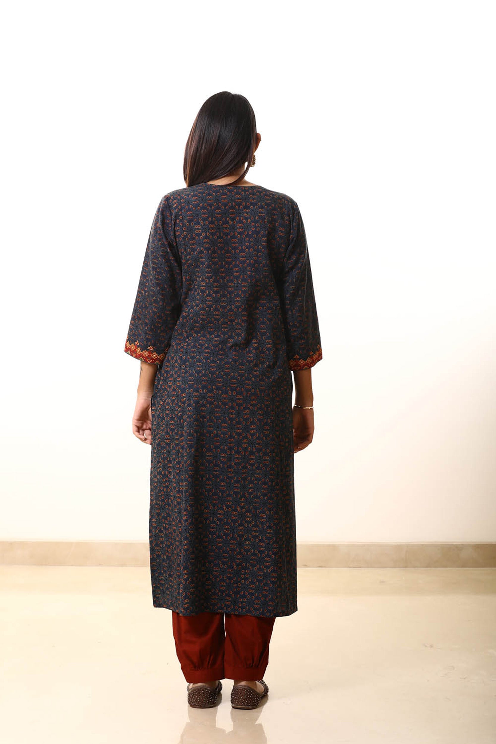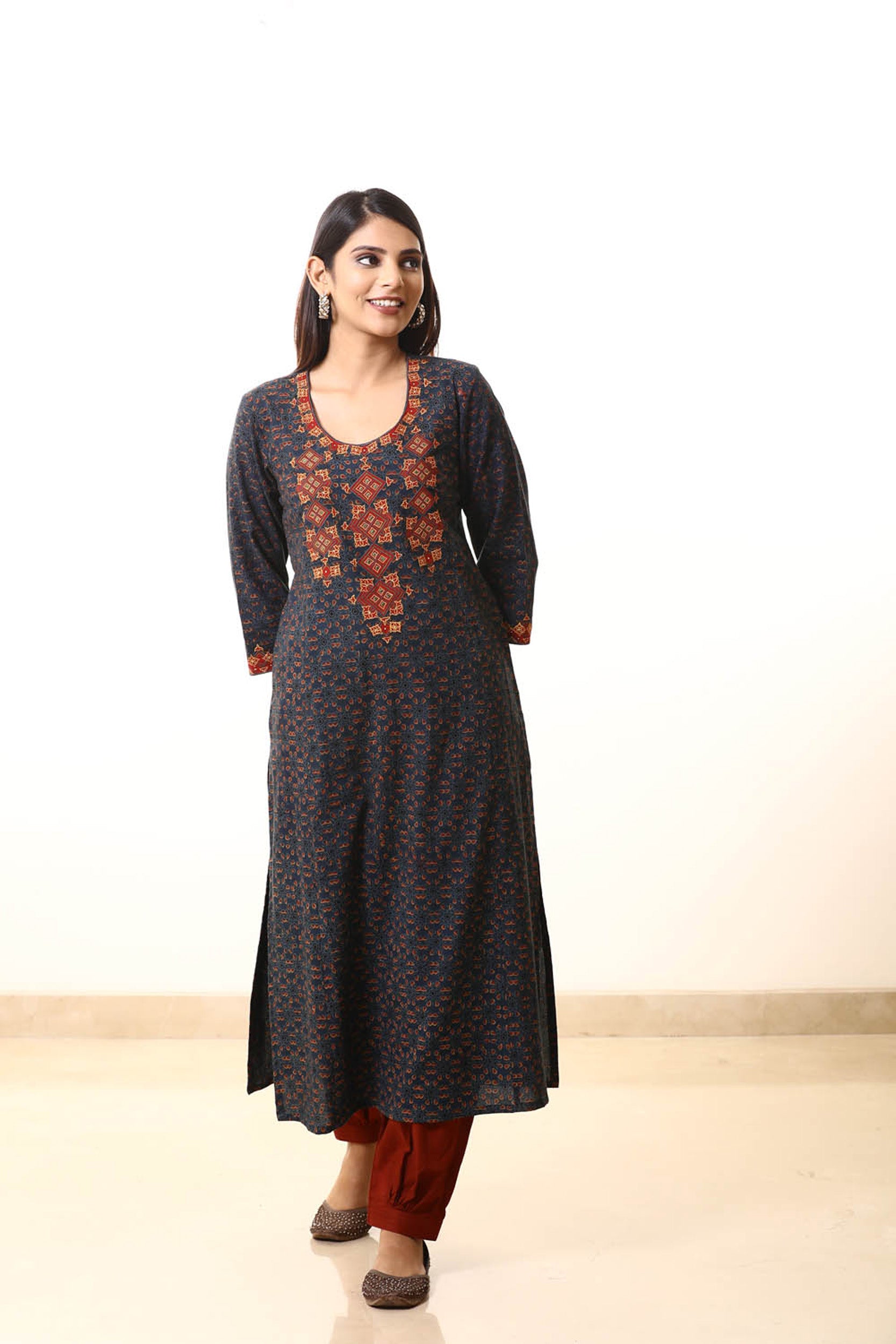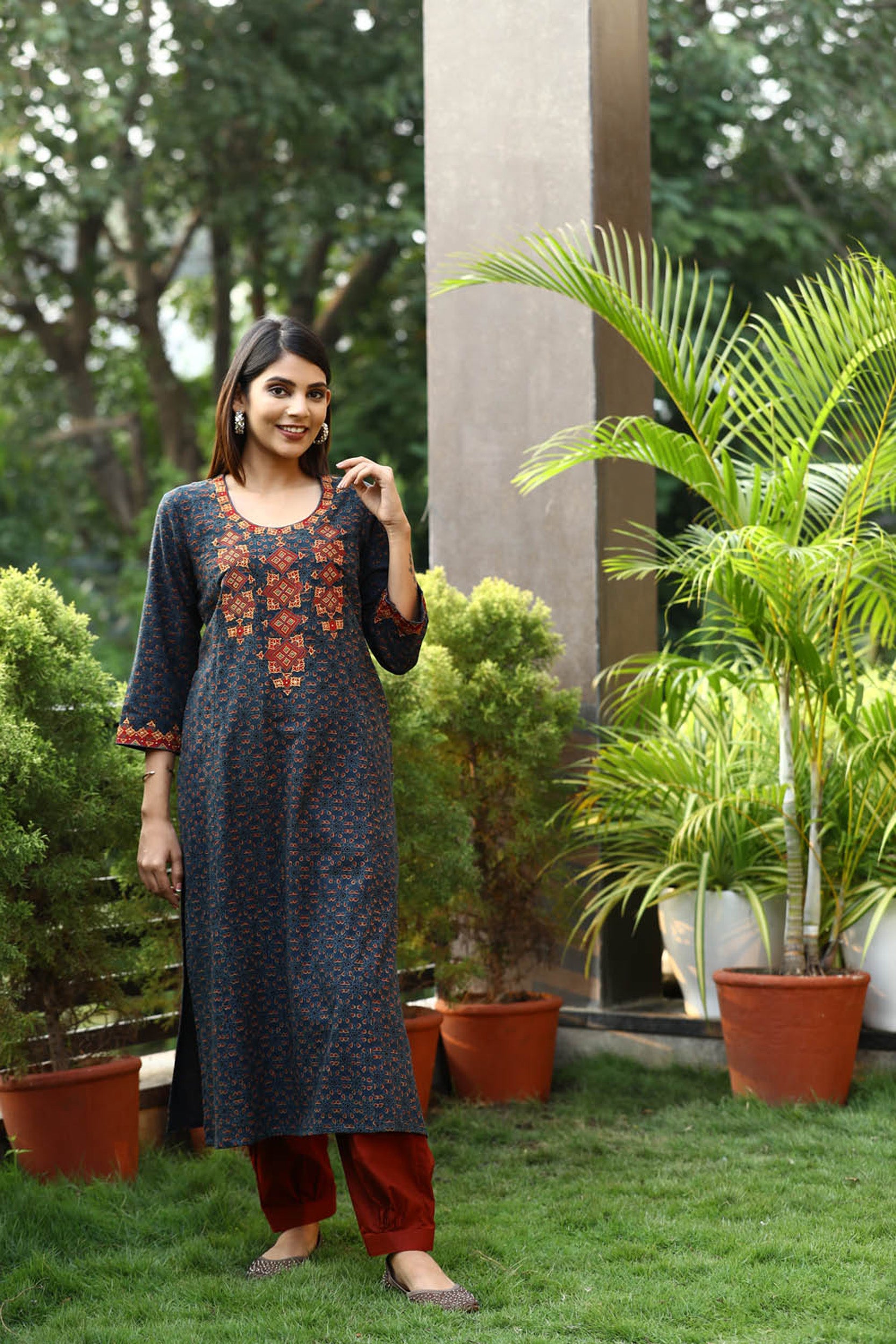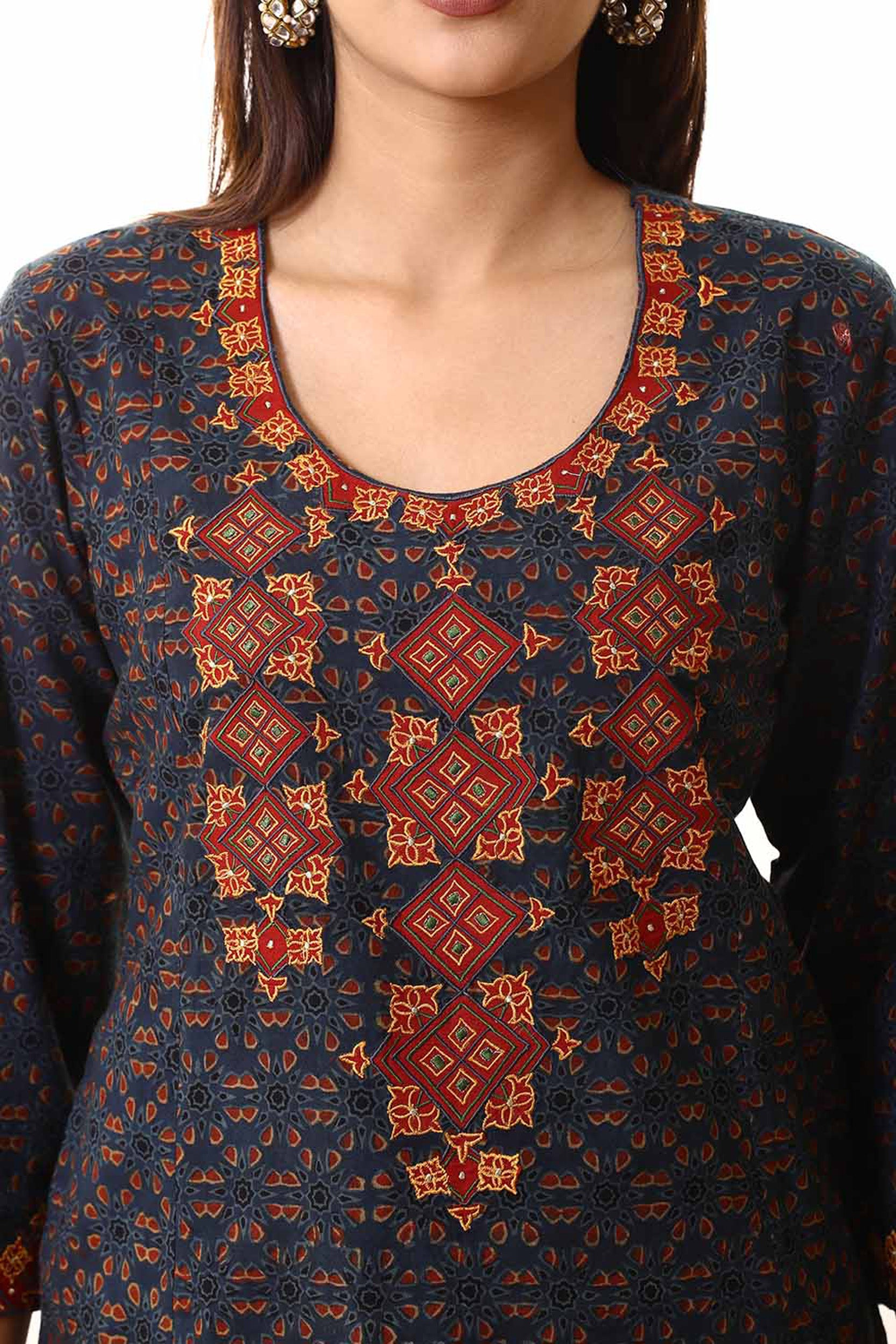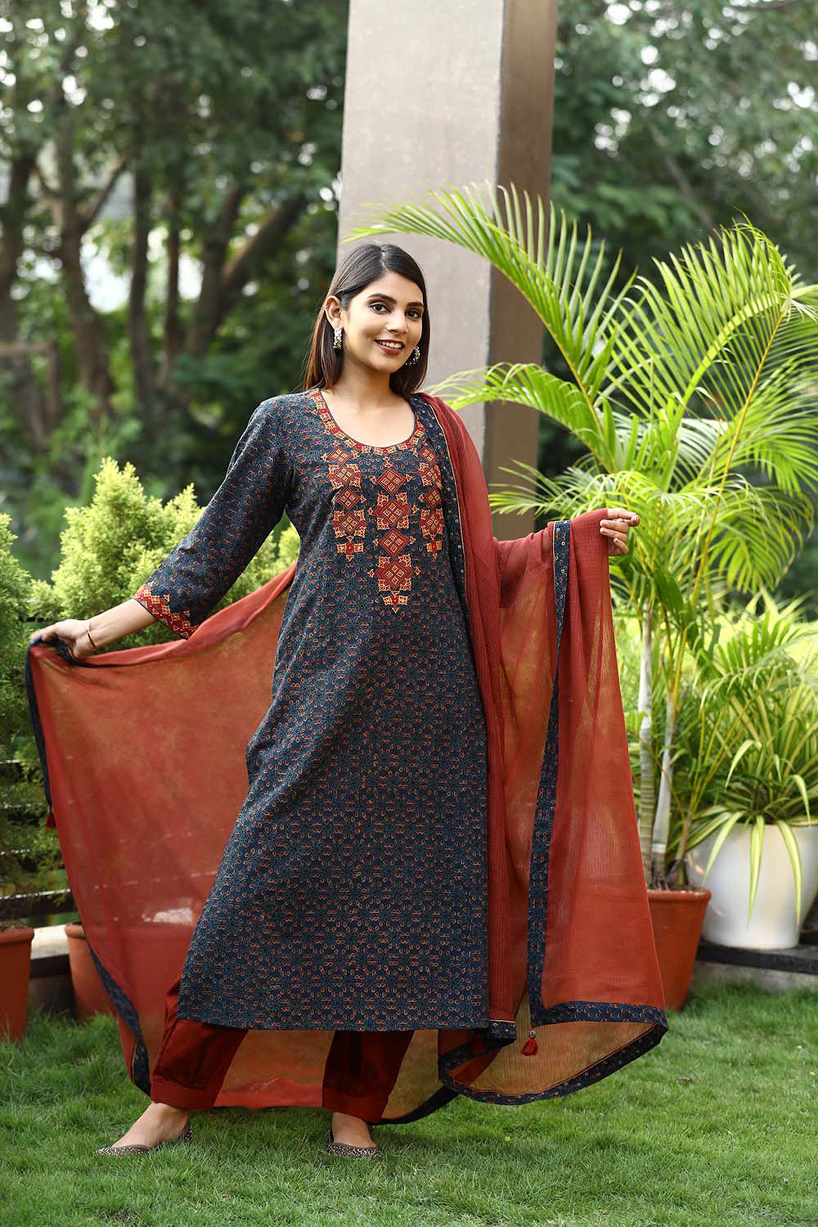 This exquisite Ajrakh suit set features a striking blue fabric adorned with traditional Ajrakh prints in red, enhanced by intricate silk embroidery patches. The accompanying dupatta is beautifully embellished with a detailed border and delicate zari silk work, adding a refined elegance to the ensemble. Perfect for those who appreciate artisanal craftsmanship and timeless design.