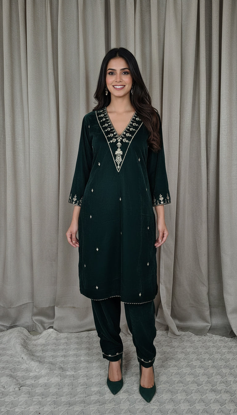 Bottlegreen velvet with zari zardozi embellishments Kurta and pant