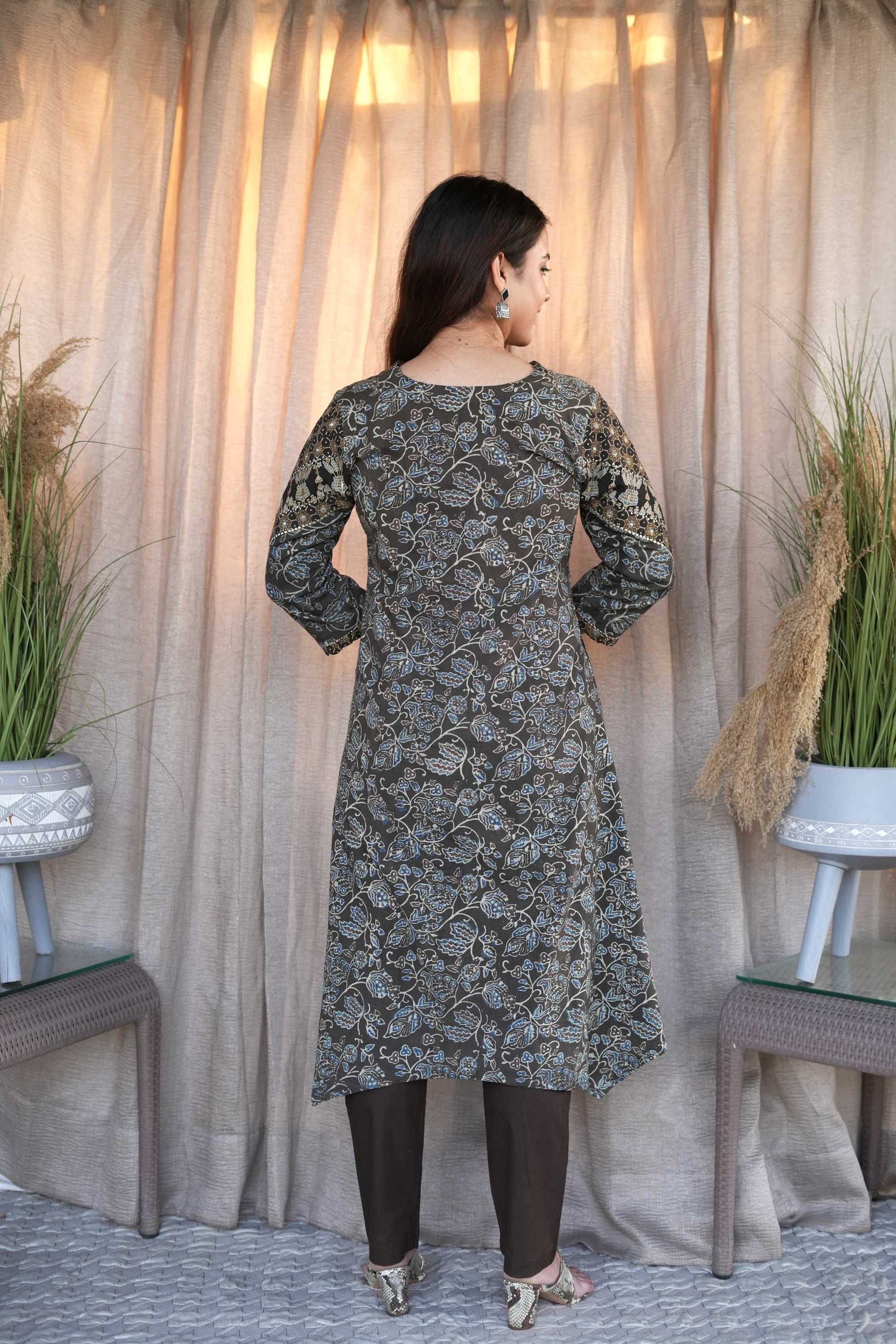 Crafted in pure cotton the kurta is beautifully printed in ajrakh in color combination of gray and brown. The kurta yoke is embroidered with golden zari threads