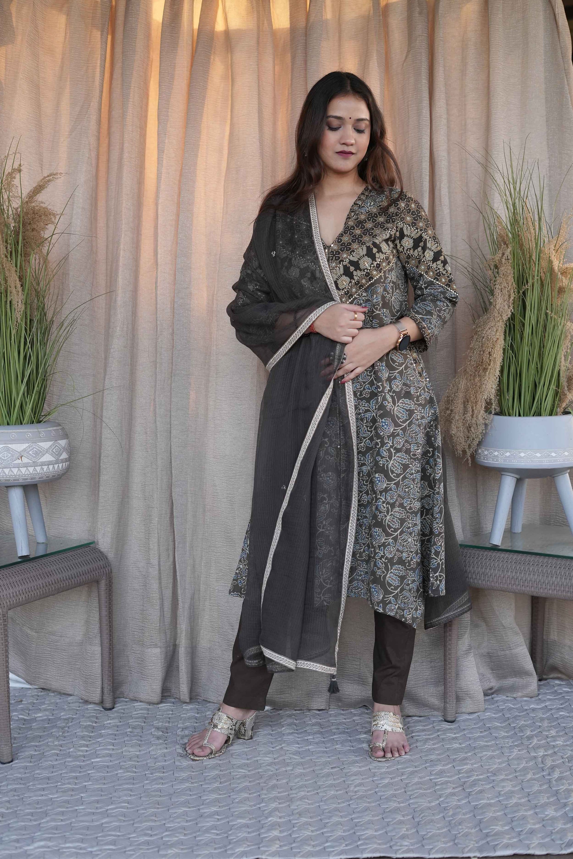 Brown And Grey Ajrakh Zari Embroidered SuitSet-Set of 3