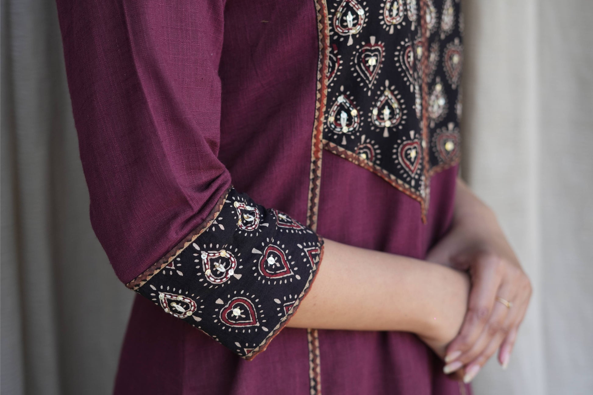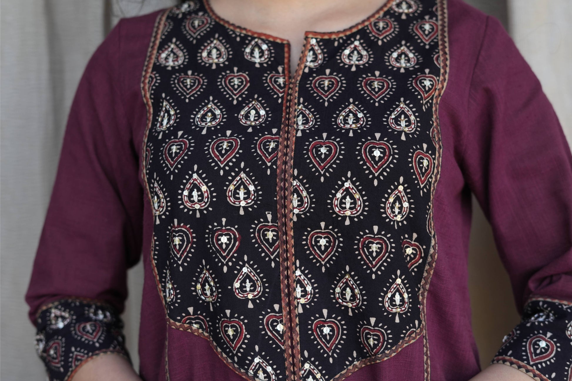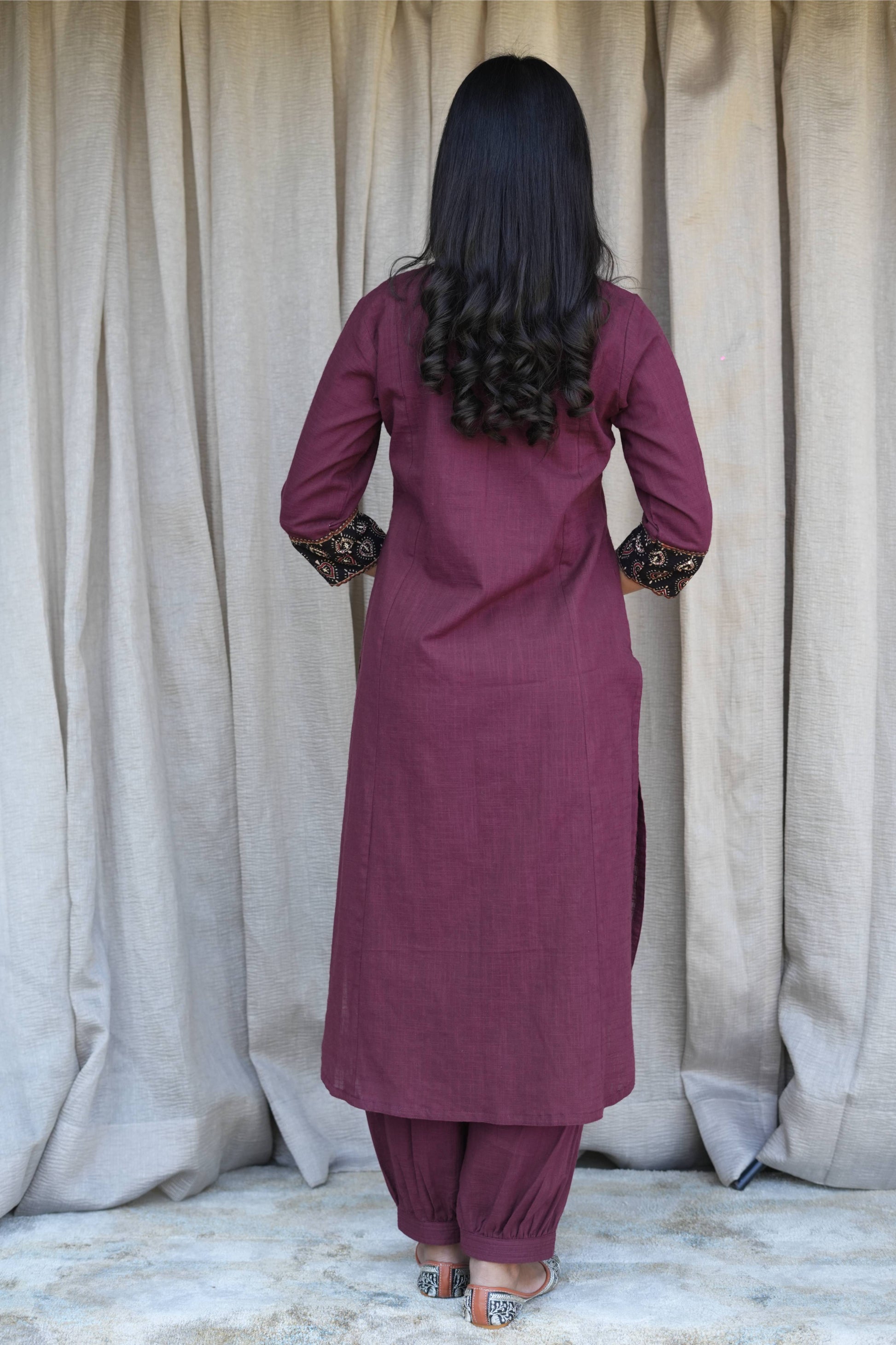 This summer dress yourself in this beautiful cotton slub suit set which has Ajrakh patch in front which is hand embroidered with thread and sequence.It comes with Afgani pant and kota doriya dupatta