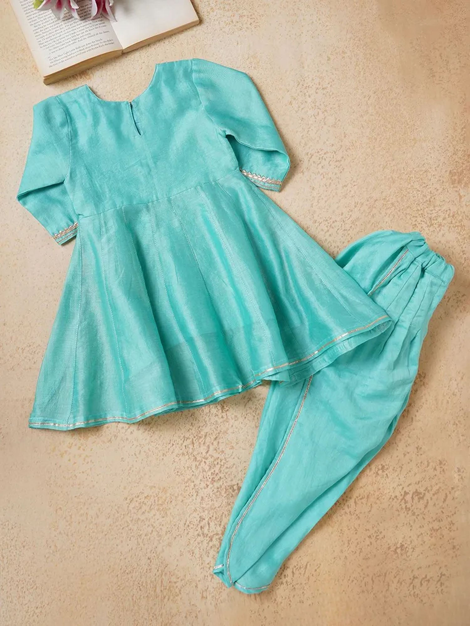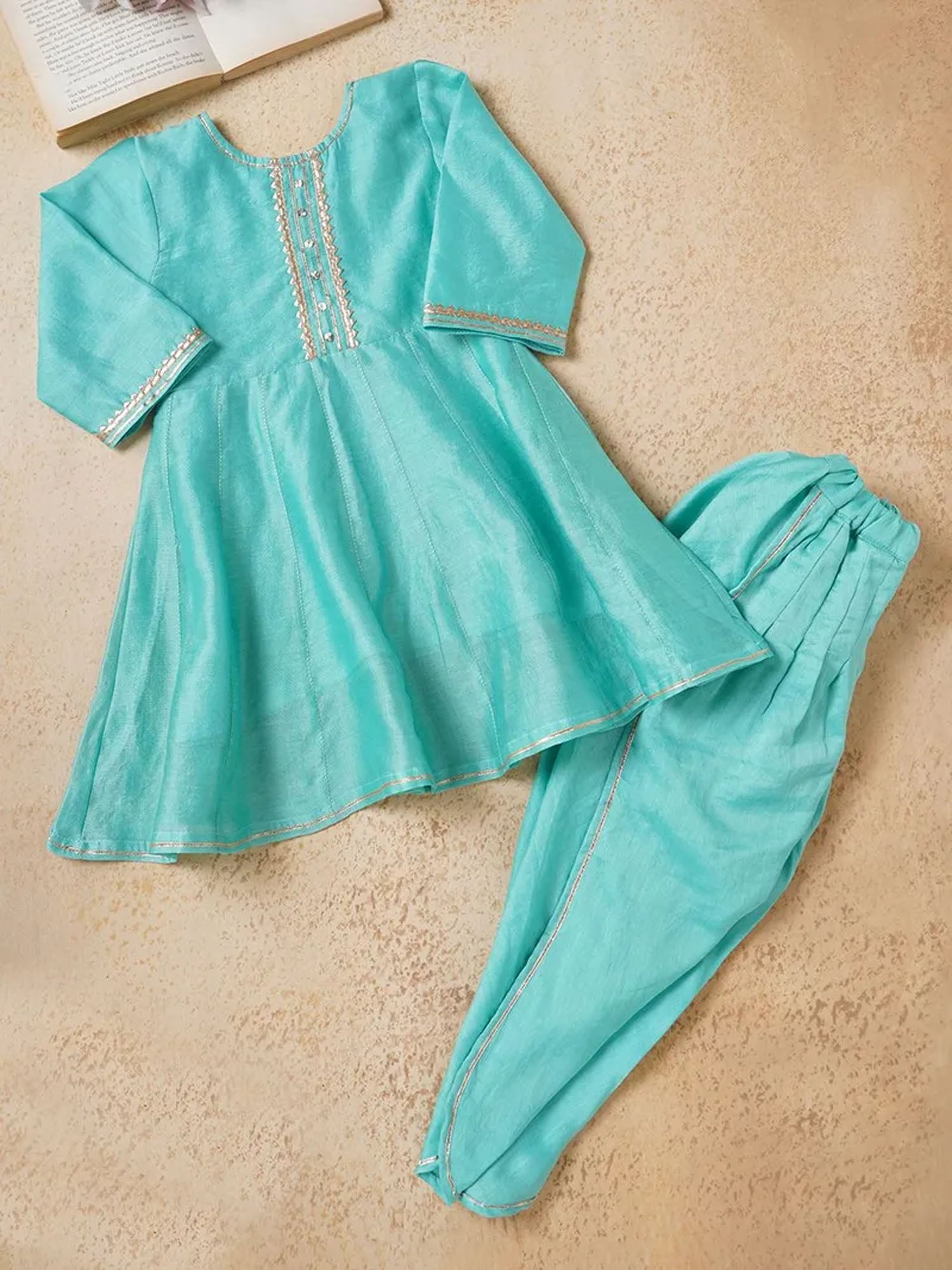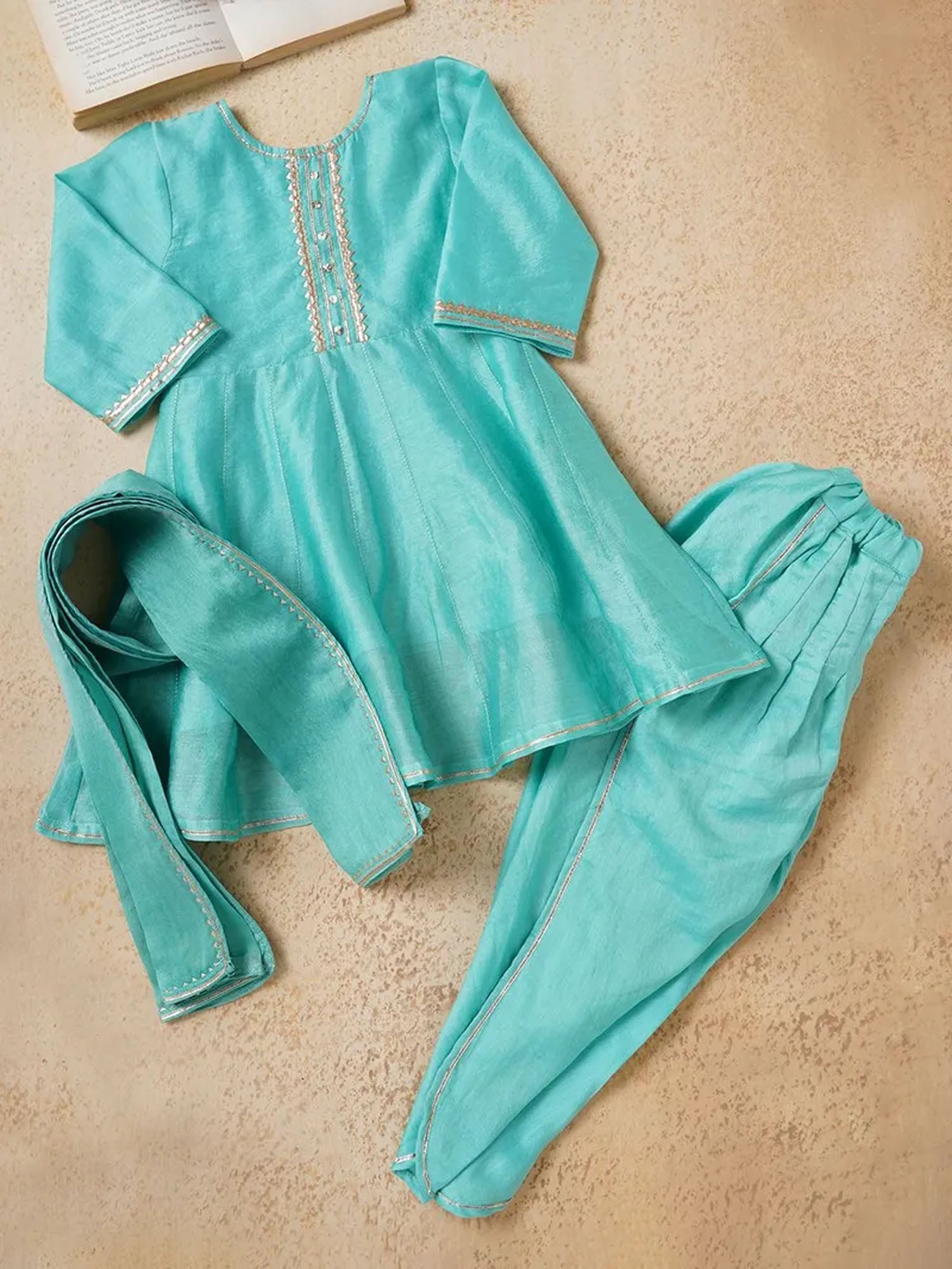 Graceful and sophisticated, the Blue Lace Work Chanderi Suit - Set of 3 is an exquisite ensemble that blends traditional artistry with contemporary charm. This three-piece set features a stunning blue chanderi kurta adorned with intricate embroidery and delicate lace work, perfectly complemented by a refined round neckline. Designed with comfort in mind, the kurta comes with an attached mulmul lining, ensuring a luxurious feel against the skin. The set includes matching blue chanderi dhoti pants showcasing graceful lace detailing and a fully elasticated waist, providing both ease and elegance. These pants also come with attached mulmul lining for a soft, breathable fit. Completing the look is a blue chanderi dupatta, elegantly designed with lace detailing to add a touch of ethereal beauty. Whether worn for festive celebrations or evening gatherings, this suit exudes charm and refinement.