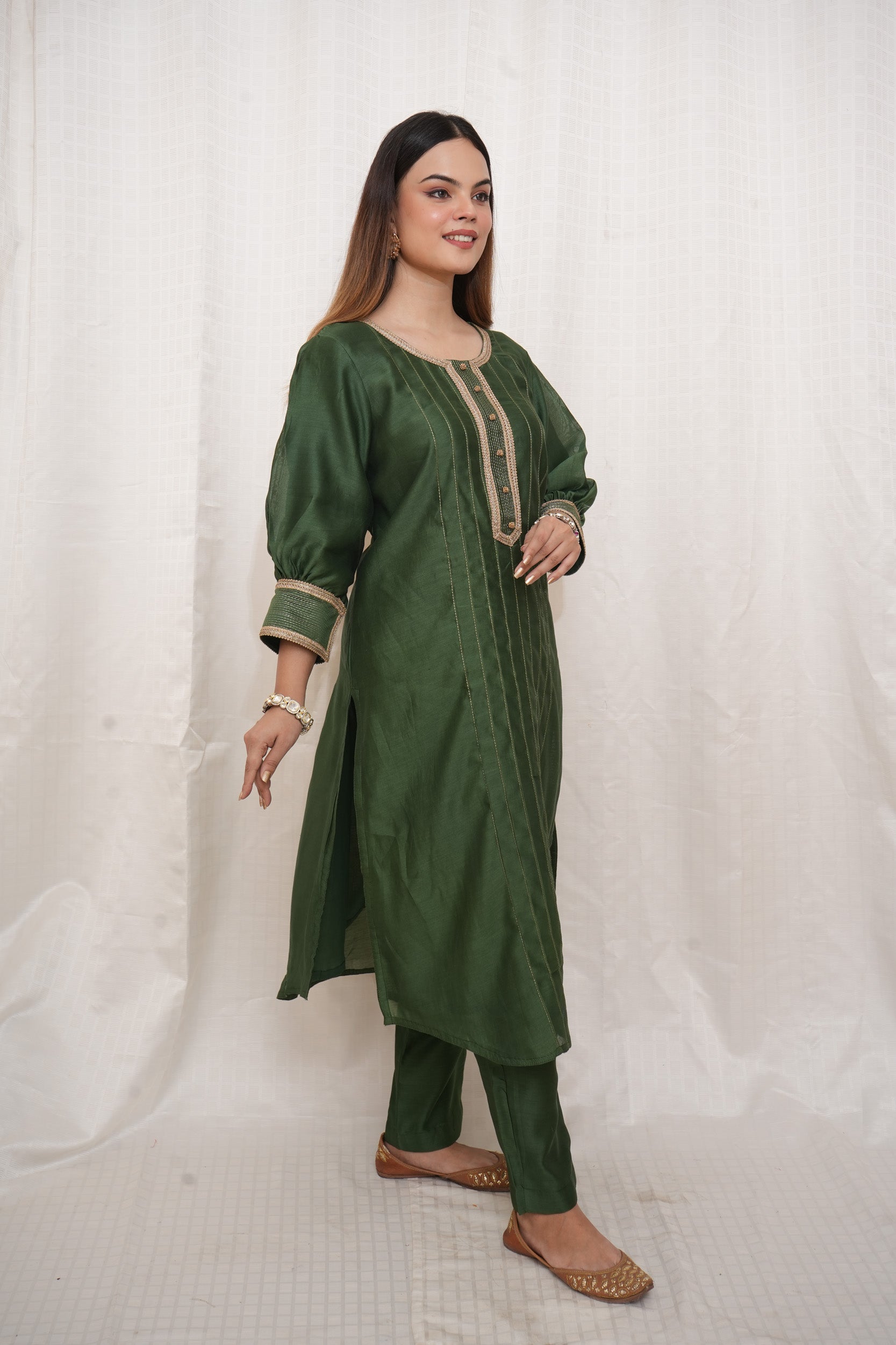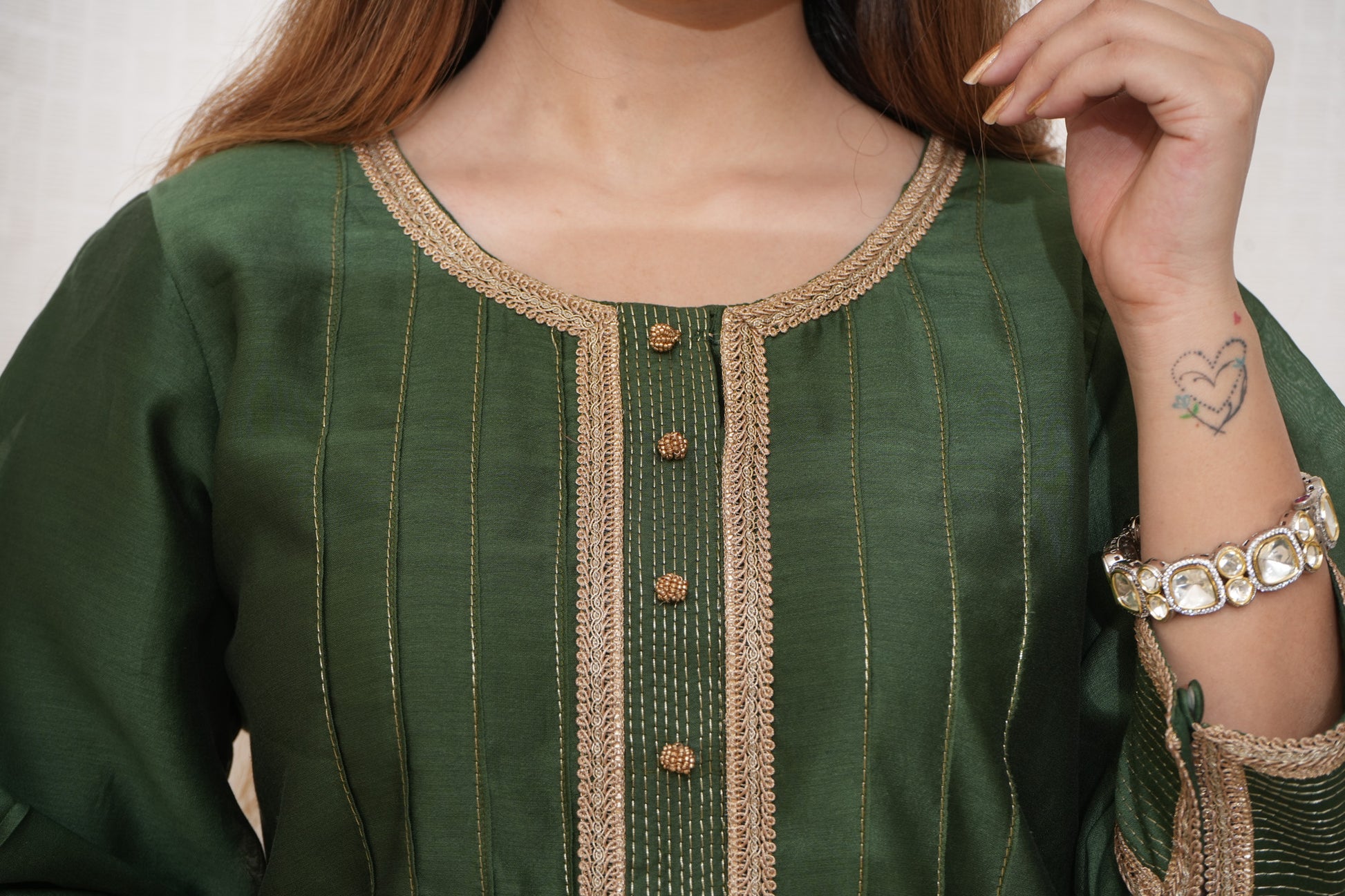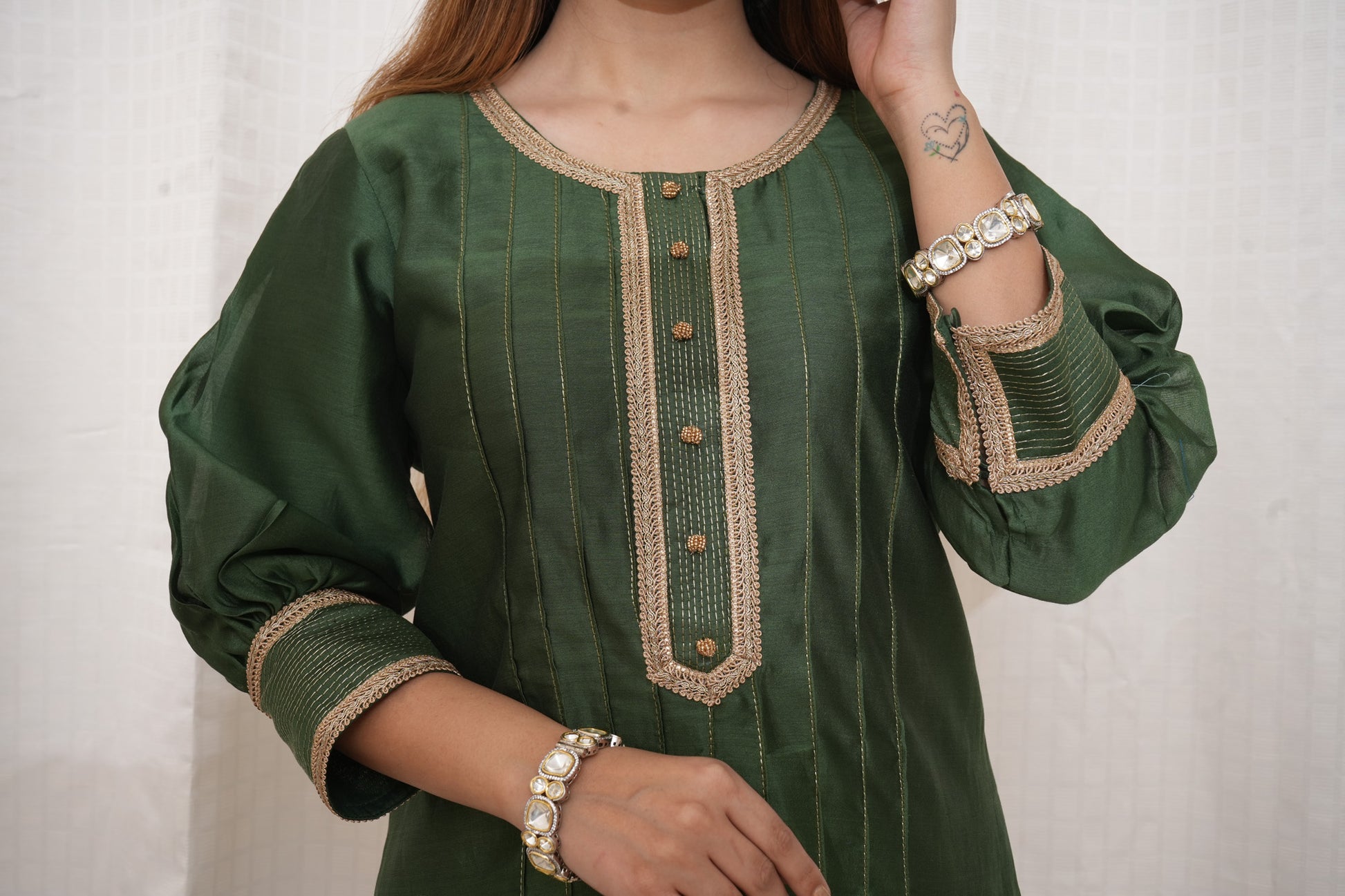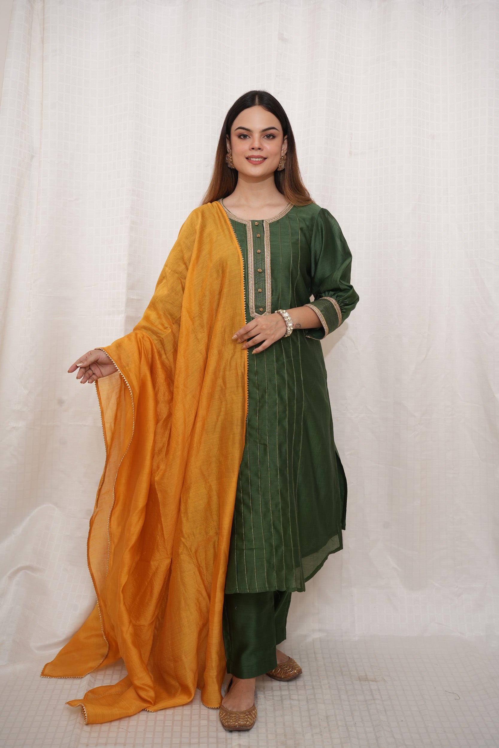 This elegant green Chanderi kurta features intricate zari and lace embellishments, showcasing refined craftsmanship. Paired with a contrasting mustard dupatta, this ensemble blends traditional artistry with contemporary style, perfect for festive occasions or formal gatherings. The breathable Chanderi fabric ensures comfort while maintaining a graceful silhouette.
