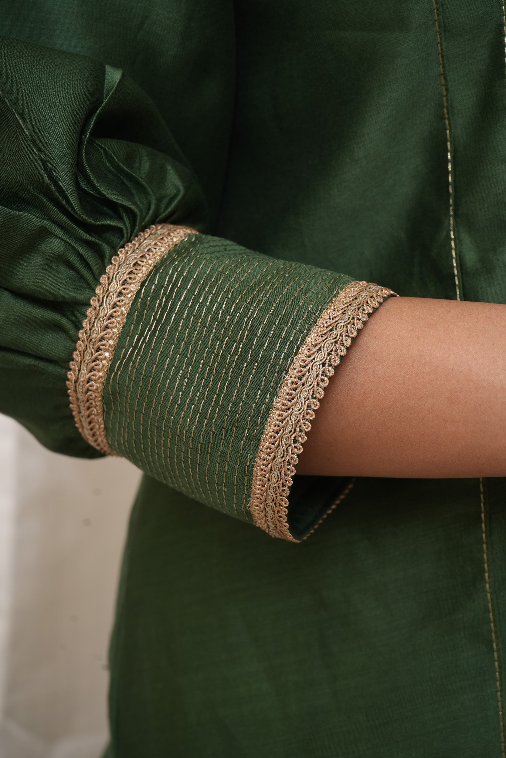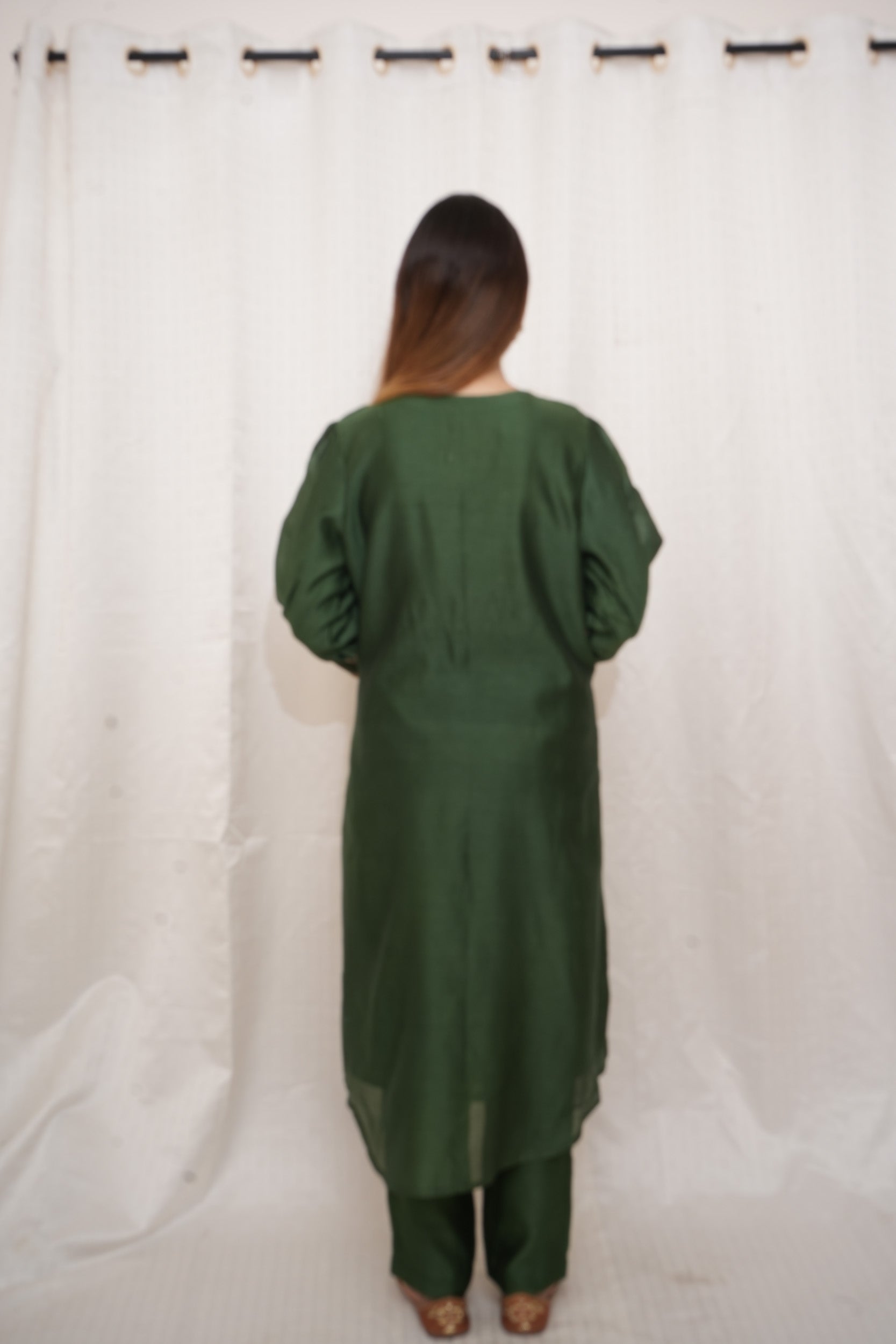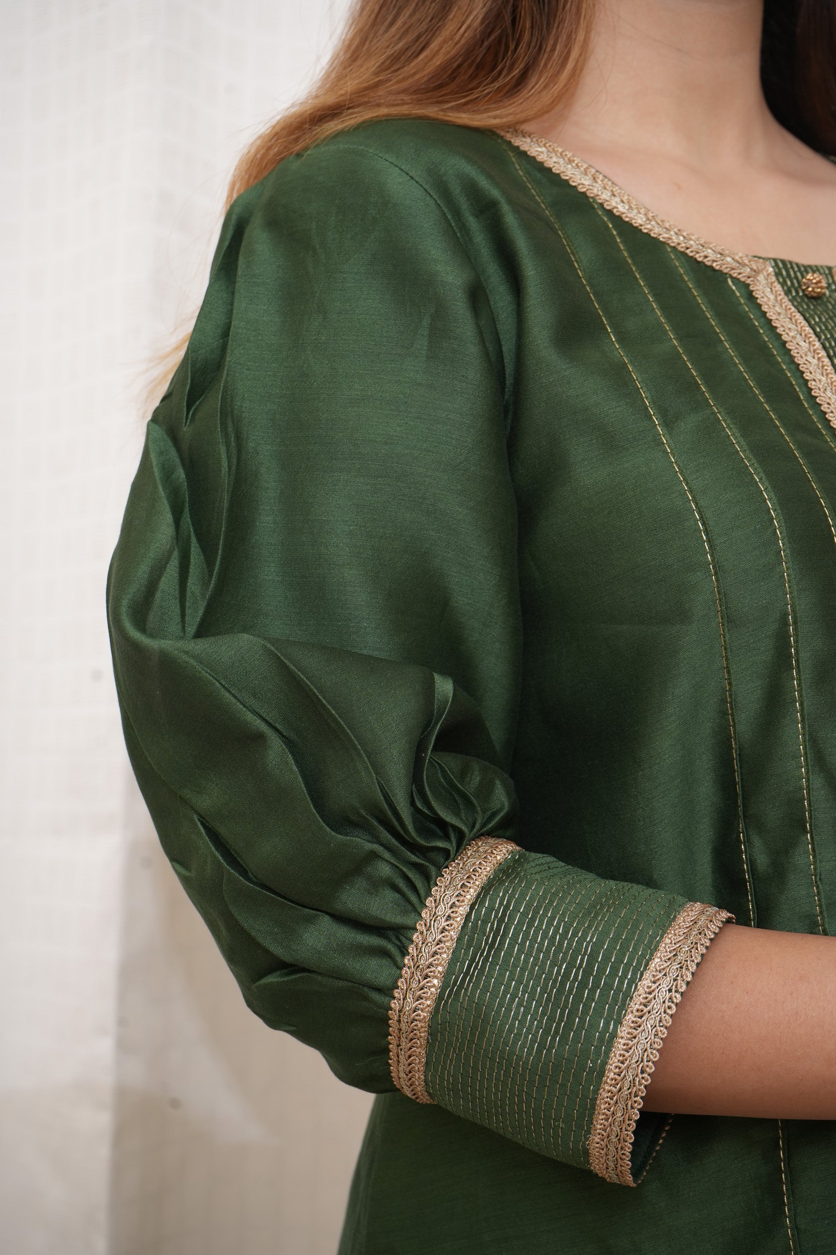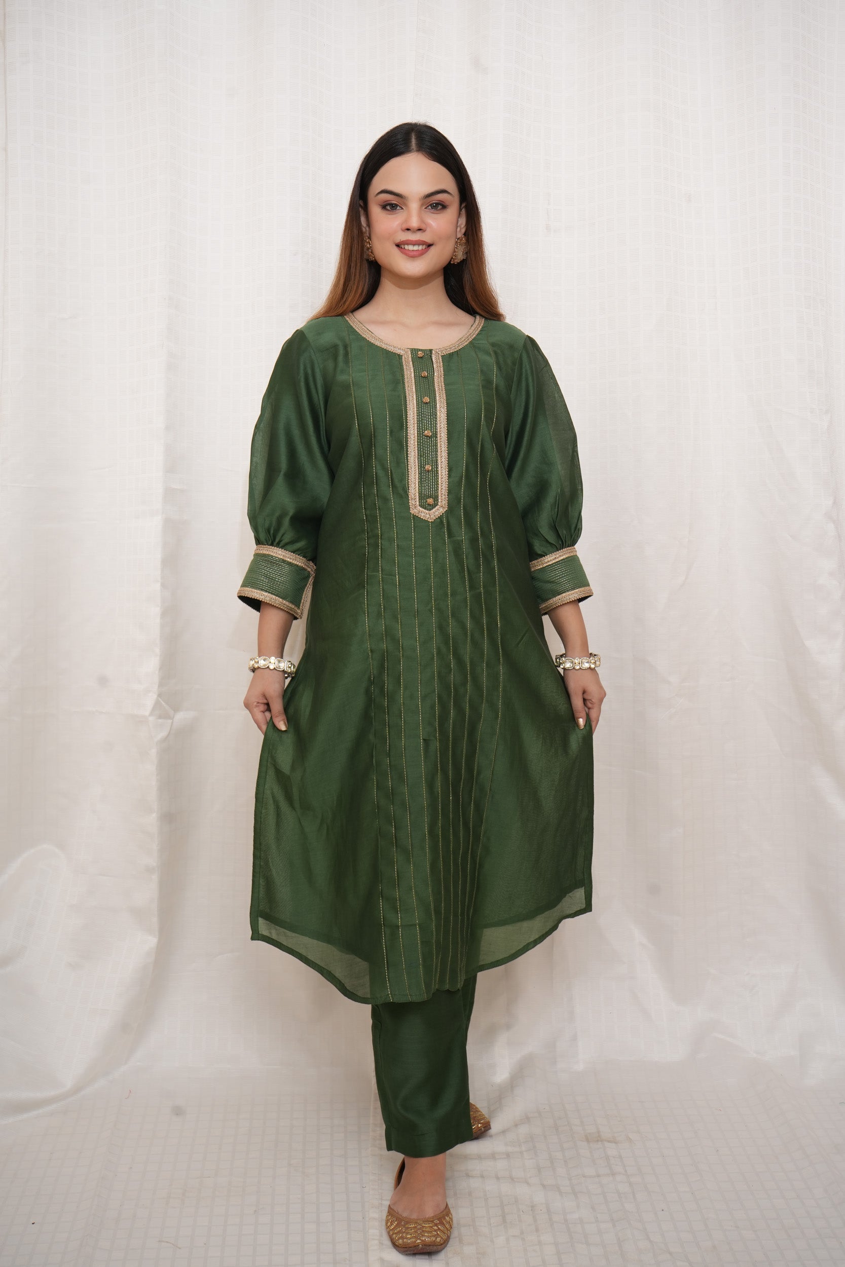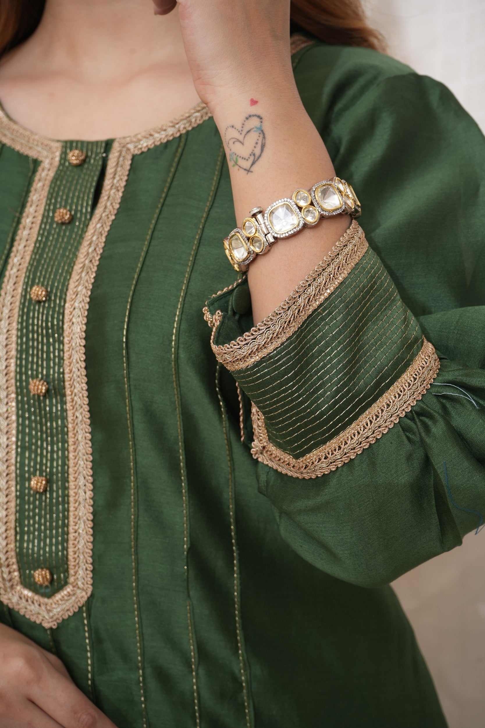 This elegant green Chanderi kurta features intricate zari and lace embellishments, showcasing refined craftsmanship. Paired with a contrasting mustard dupatta, this ensemble blends traditional artistry with contemporary style, perfect for festive occasions or formal gatherings. The breathable Chanderi fabric ensures comfort while maintaining a graceful silhouette.