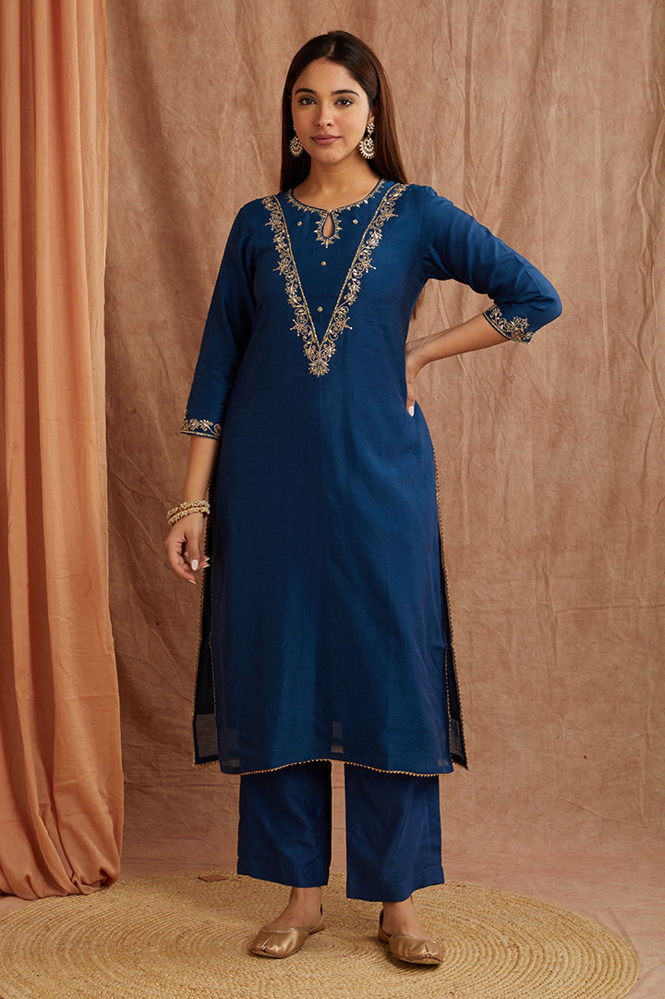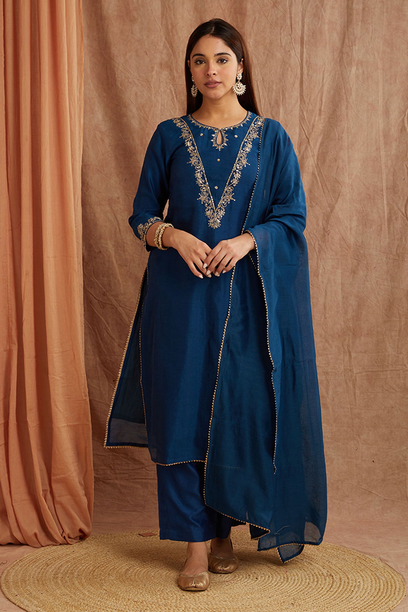 Elevate your ethnic wardrobe with this Ice Blue Chanderi Silk Kurta Pant set. The kurta features exquisite zari embroidery enhanced by delicate white beads and sequins, creating a refined and elegant look. Paired with stylish tulip pants, this ensemble offers both comfort and contemporary flair, perfect for festive occasions or formal gatherings. Crafted from premium Chanderi silk, it ensures a lightweight, breathable feel while maintaining a luxurious appearance.