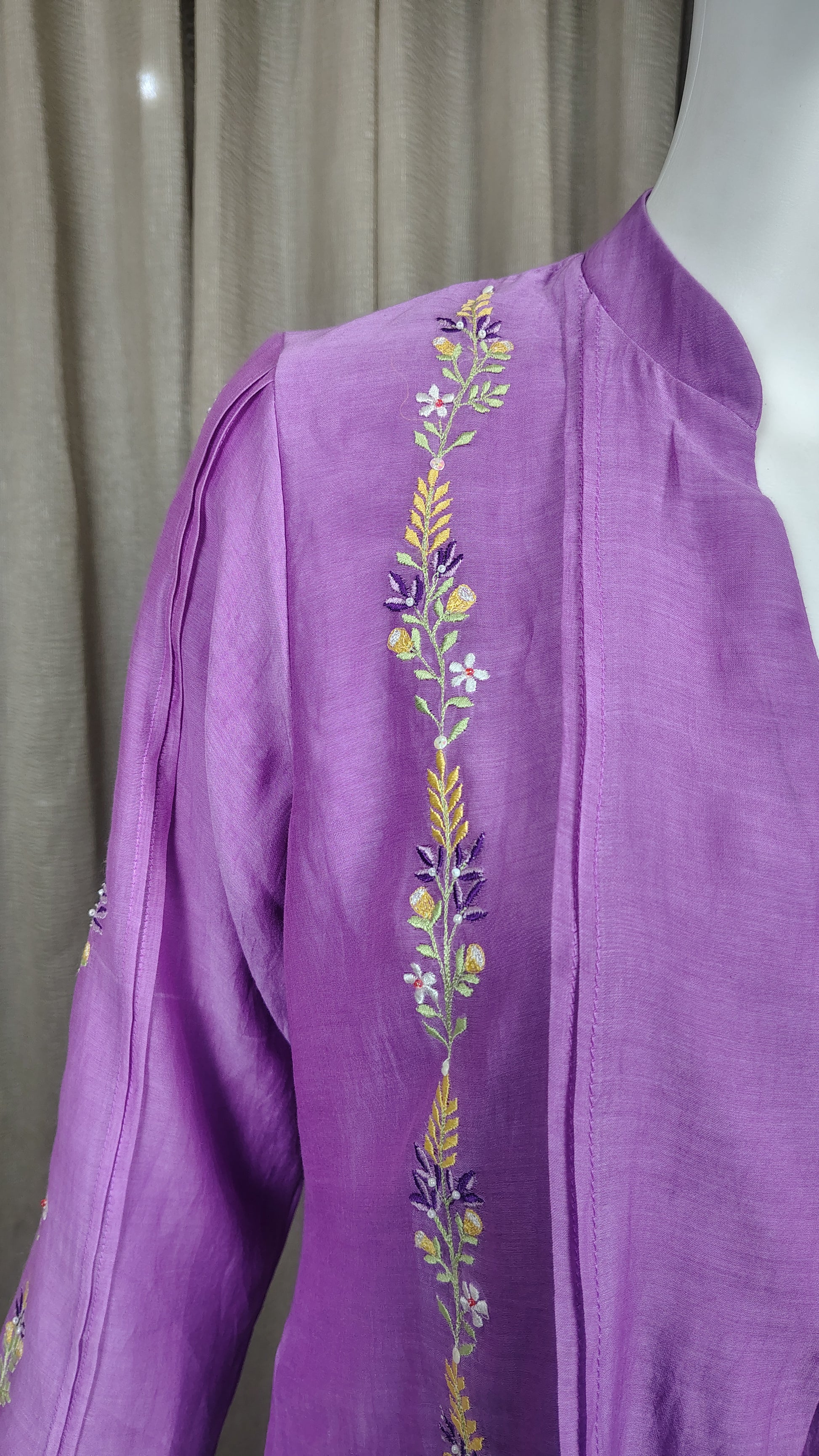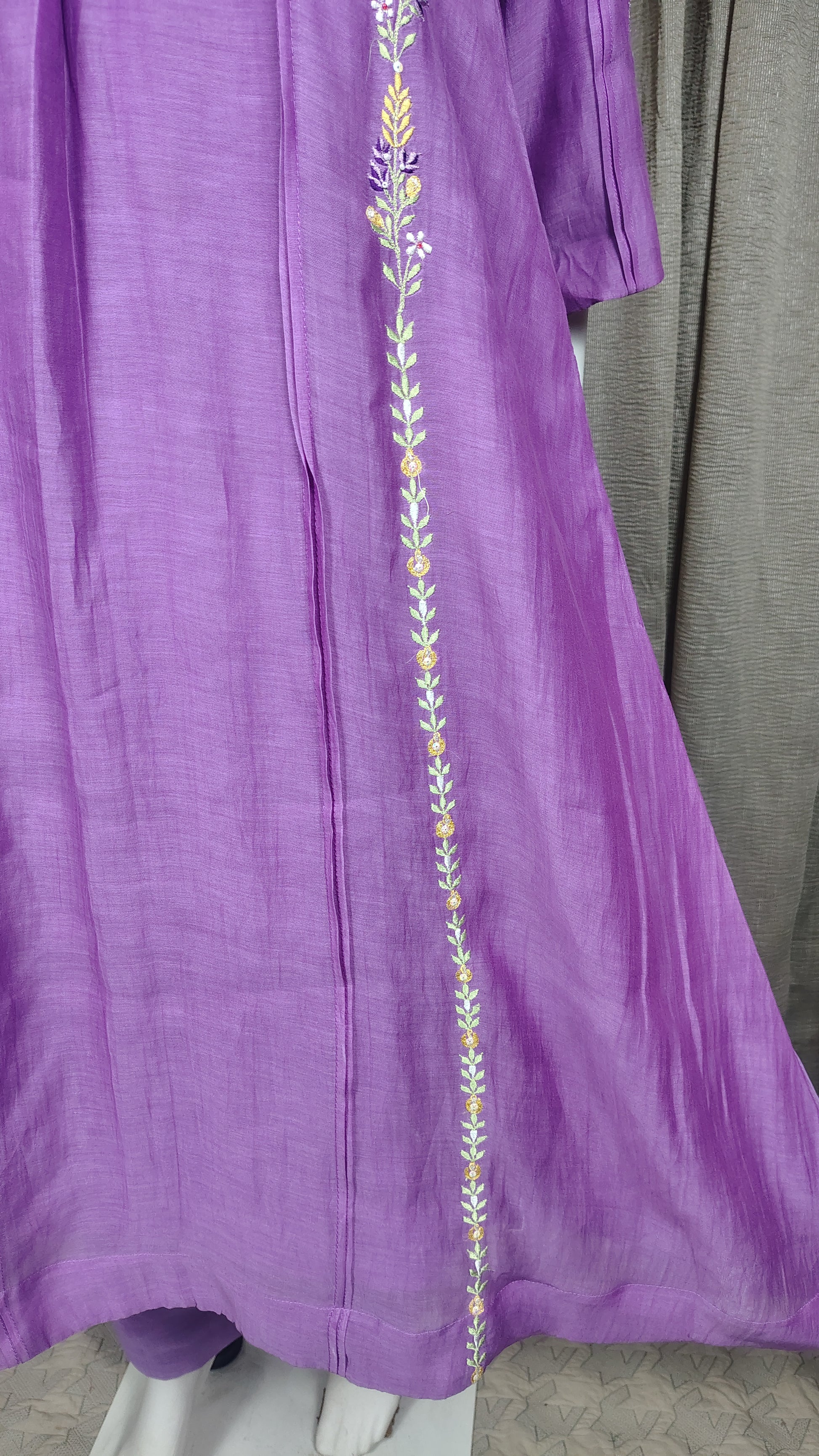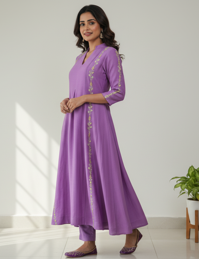 Elevate your ethnic wardrobe with this exquisite lilac silk Mul Chanderi kurta paired with matching pants. Crafted from premium Chanderi fabric, known for its lightweight drape and subtle sheen, this ensemble features intricate multicolor embroidery accented with delicate yellow rose motifs. The refined embroidery work showcases traditional craftsmanship, making it ideal for festive occasions, celebrations, or refined everyday wear. The soft lilac hue complements various skin tones, while the coordinated pant ensures a polished, complete look. Perfect for those who appreciate quality fabrics and timeless ethnic elegance.