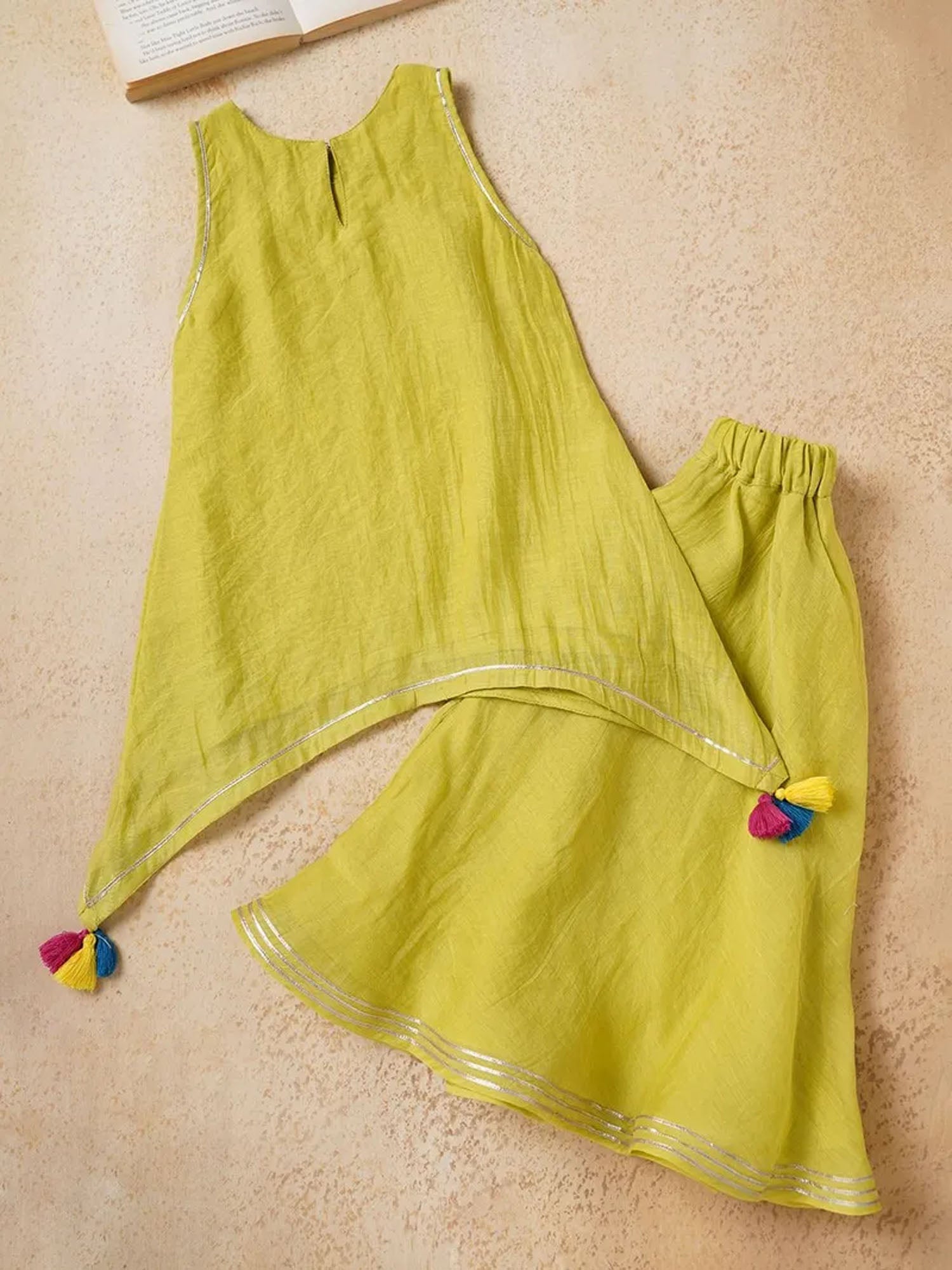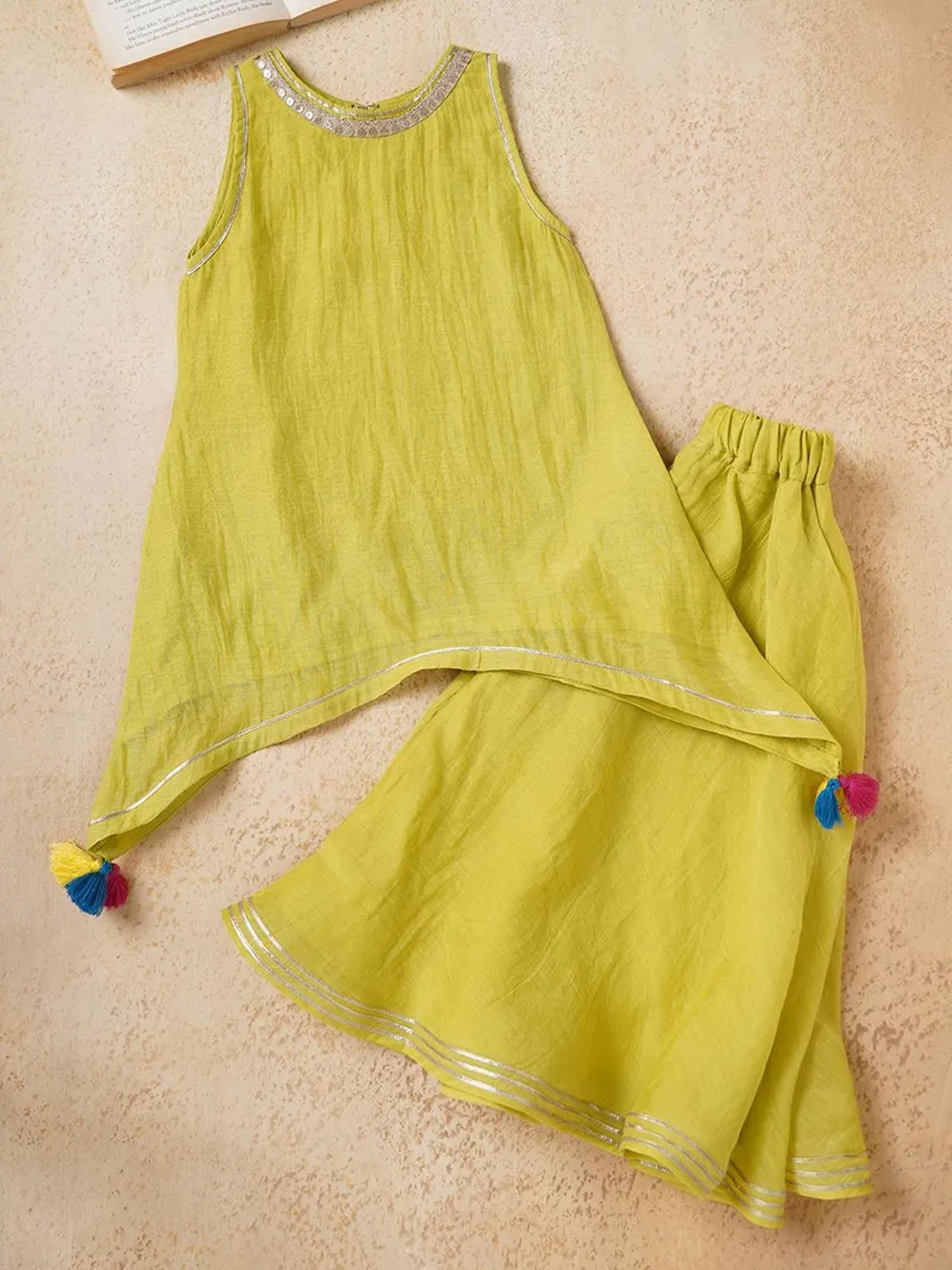Lime Green Lace Work Chanderi Kurta with Palazzo- Set of 2
