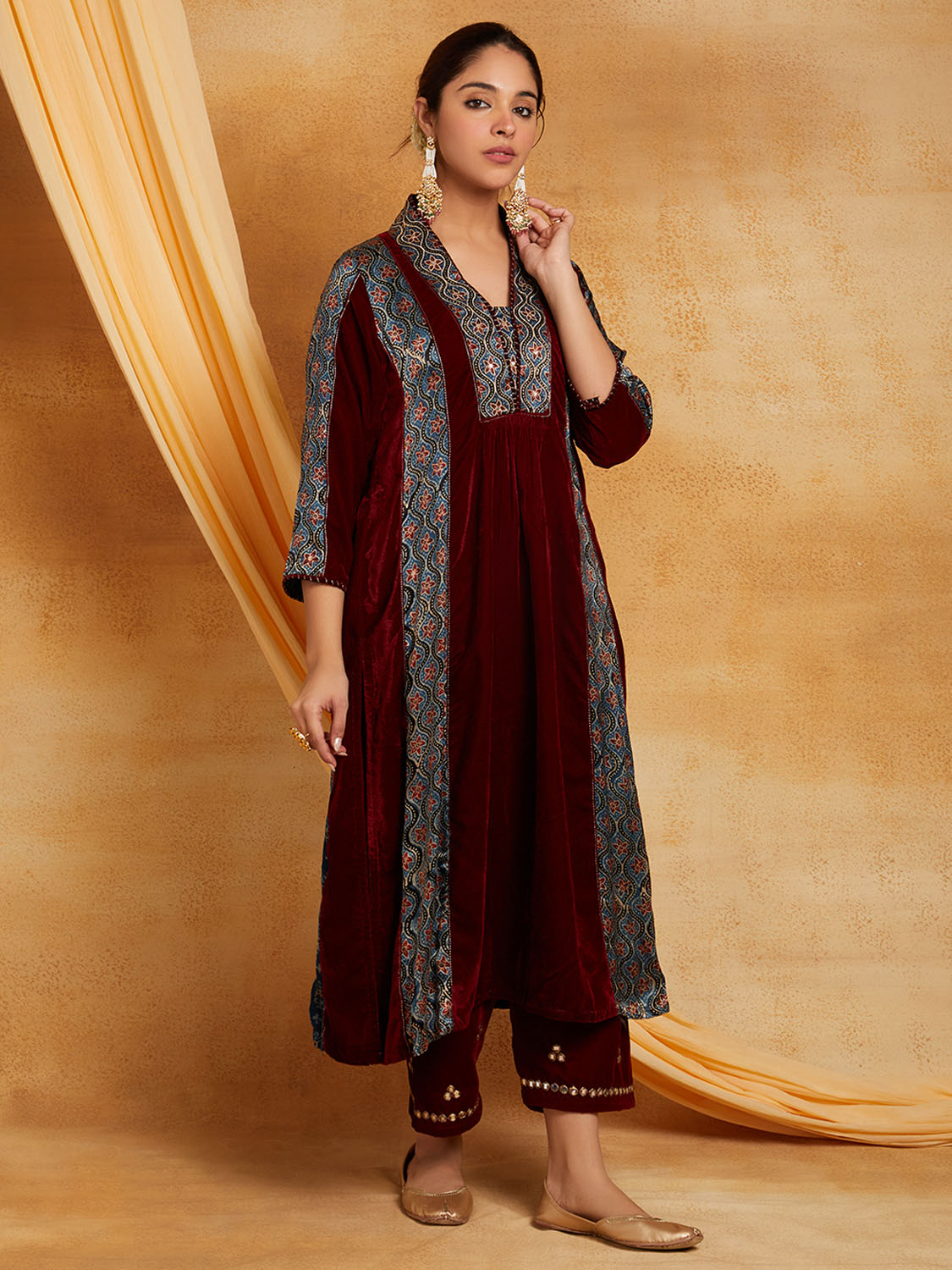 Maroon Velvet Ajrakh Applique Golden Embroidered Kurta And Pant-Set of 2