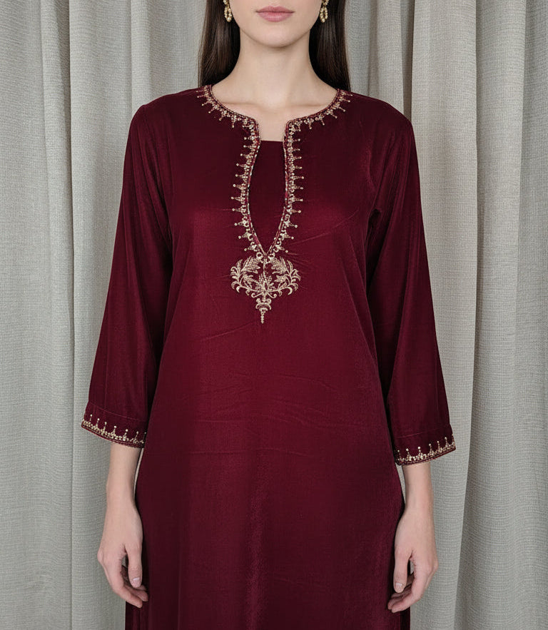 Maroon Velvet Zari Sequence Embellished Kurta and Pant