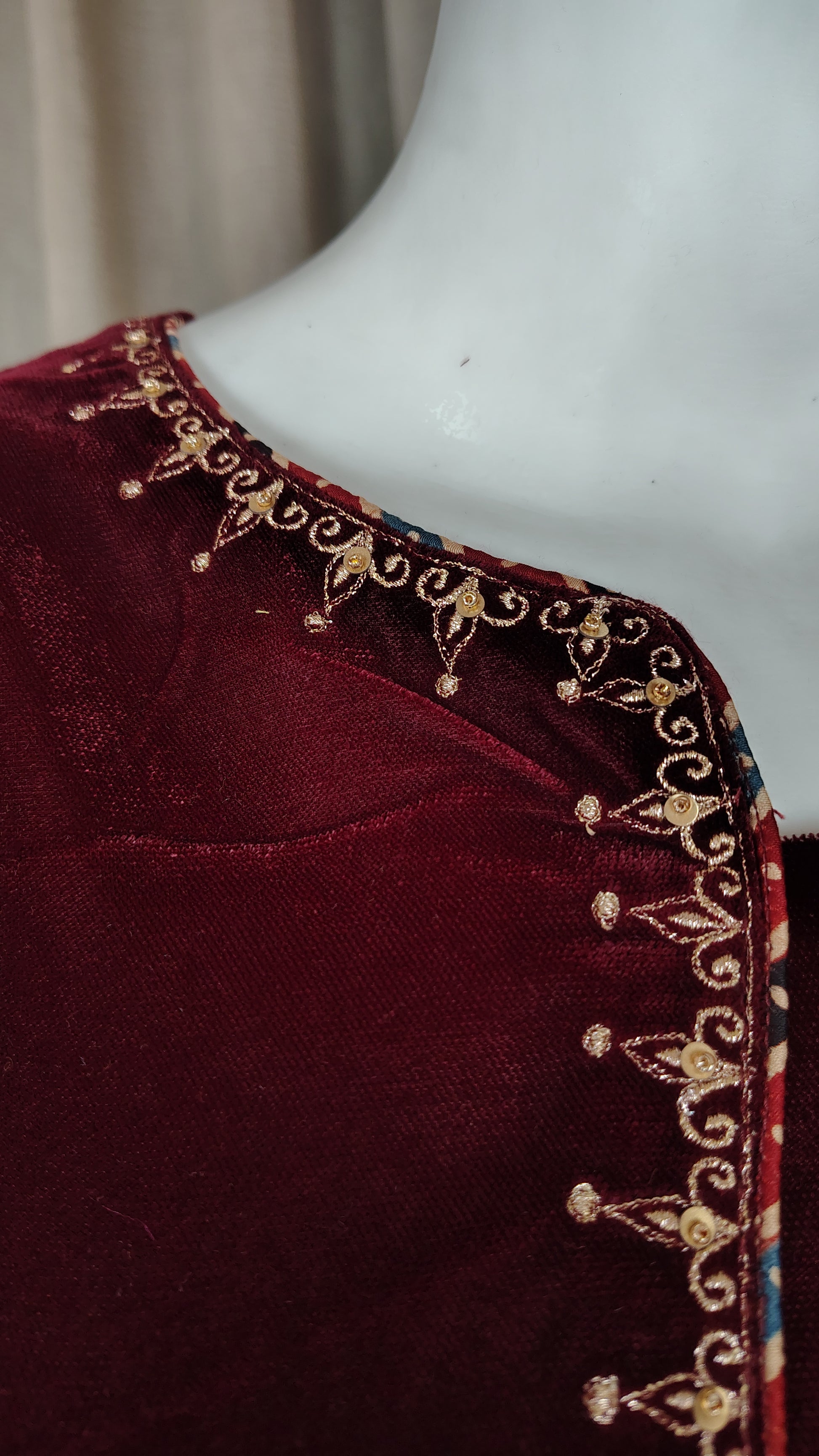 Elevate your ethnic wardrobe with this sophisticated maroon velvet kurta and pant set. Crafted from premium velvet with a luxurious modal inner finish for superior comfort, this ensemble features intricate zari and sequin embellishments that catch the light beautifully. The coordinating pants showcase delicate lace detailing, while the kurta's elegant 3/4-length sleeves offer a refined silhouette perfect for festive occasions and celebrations. A timeless investment piece that seamlessly blends traditional craftsmanship with contemporary style.