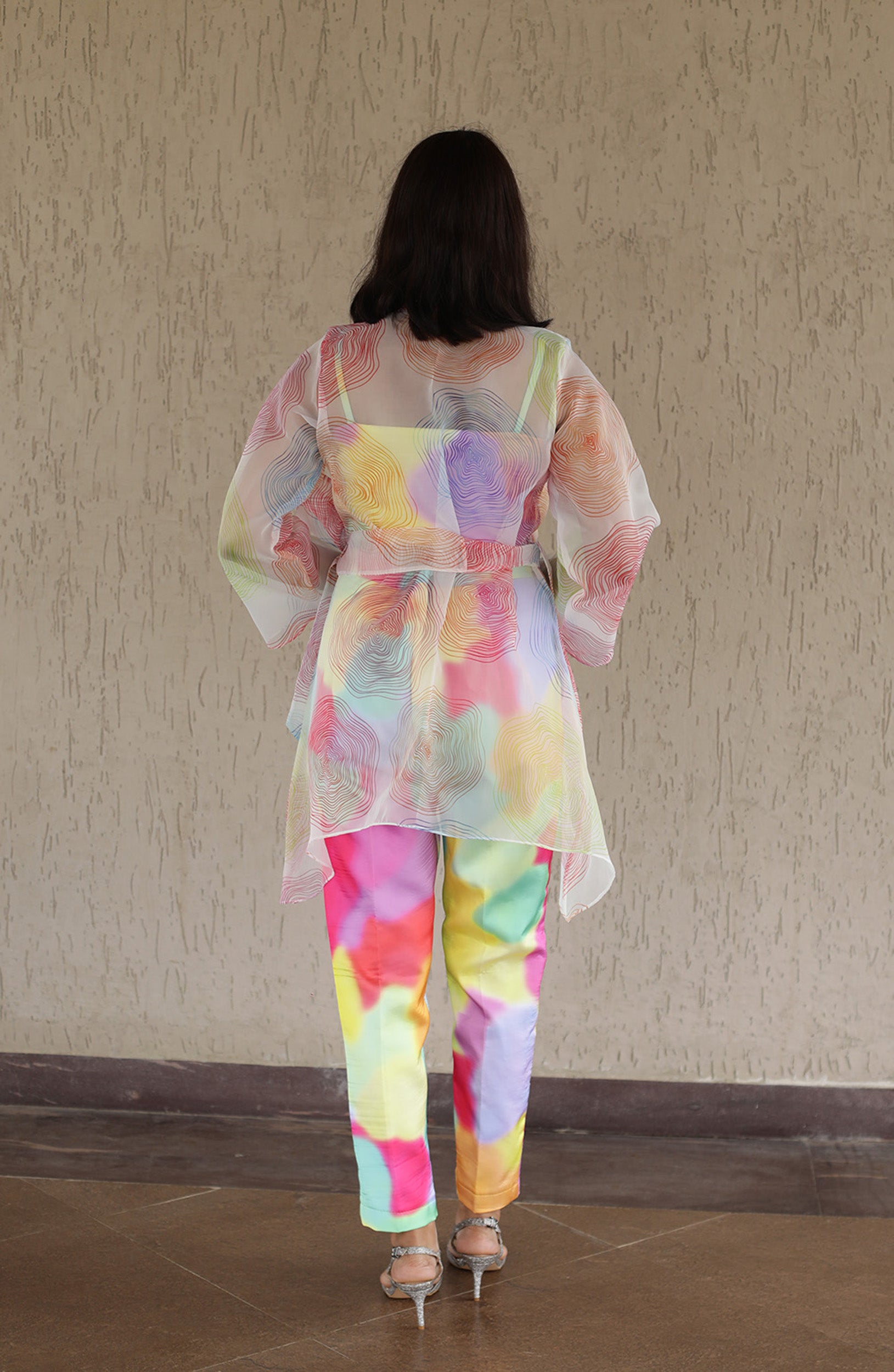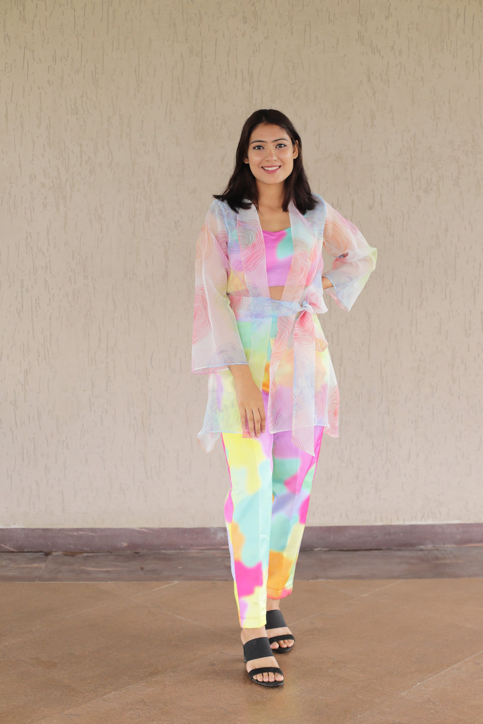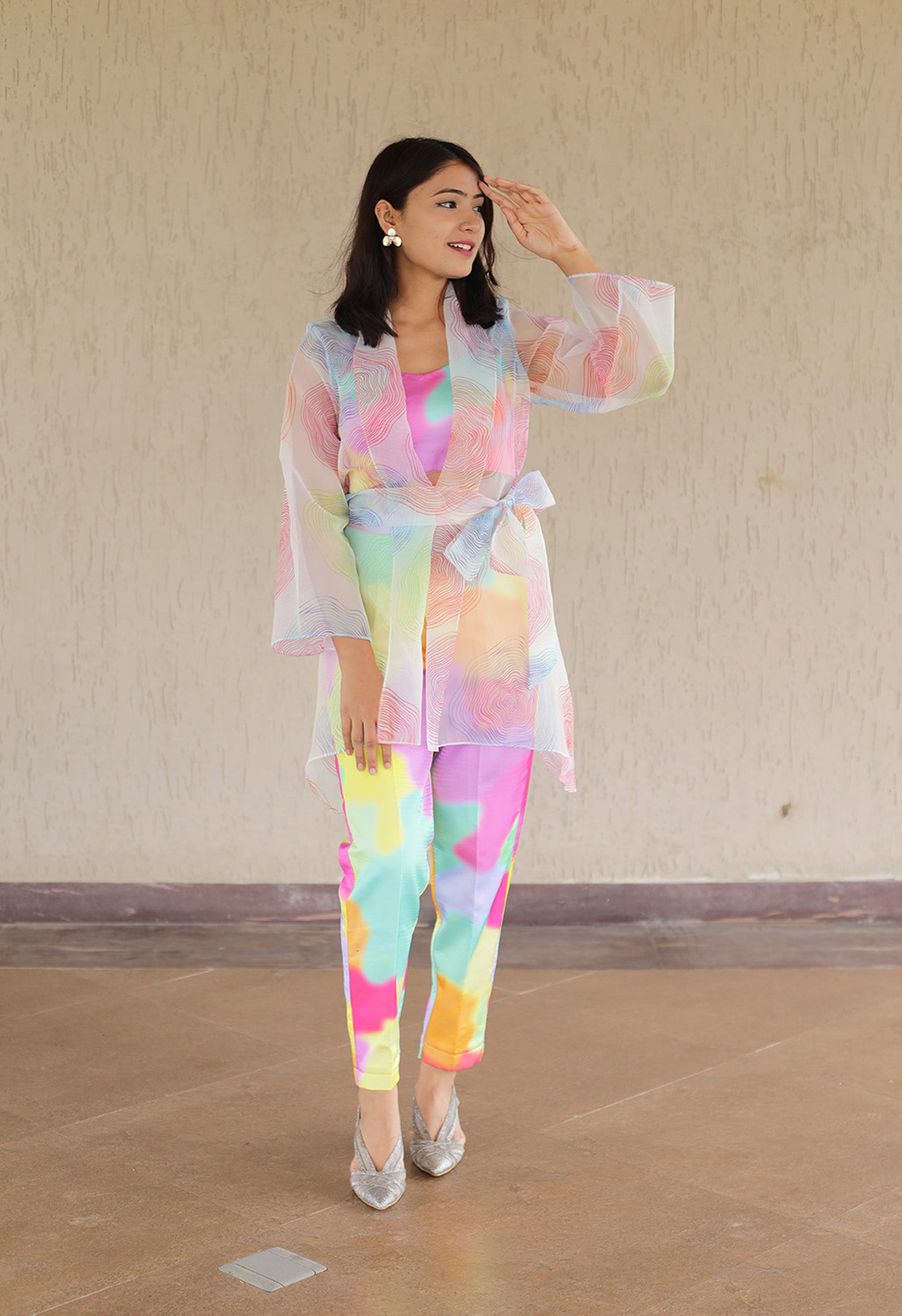 This vibrant multicolor co-ord set features a stylish crop top paired with high-waist pants designed for comfort and practicality, including convenient pockets. The ensemble is completed with a sheer organza multicolor shrug, adding a unique, funky edge to your look. Perfect for those seeking a blend of contemporary style and functional design.